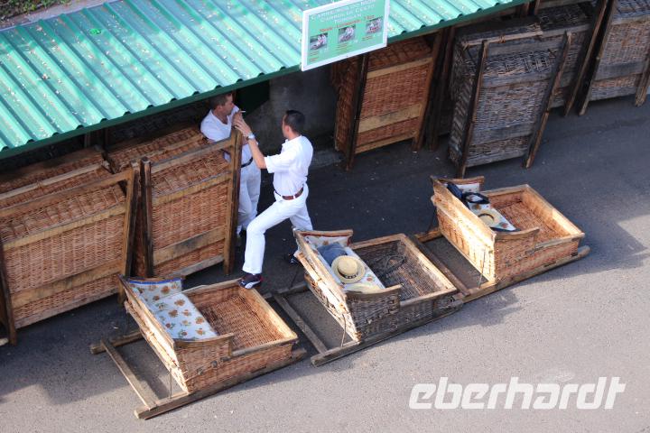 Anschließend bot sich uns die Möglichkeit, mit einem traditionellen Korbschlitten zu fahren. In jedem Schlitten fanden zwei Leute Platz, die von zwei traditionell bekleideten Herren mit dem Schlitten ins Tal gebracht wurden. Wir staunten, wie diese unsere Schlitten bei hohen Geschwindigkeiten sicher durch die engen und steilen Kurven brachten. Nach zwei Kilometer aufregender Fahrt kamen wir wieder im Tal an, wo wir kurz darauf von unserem Bus abgeholt wurden.