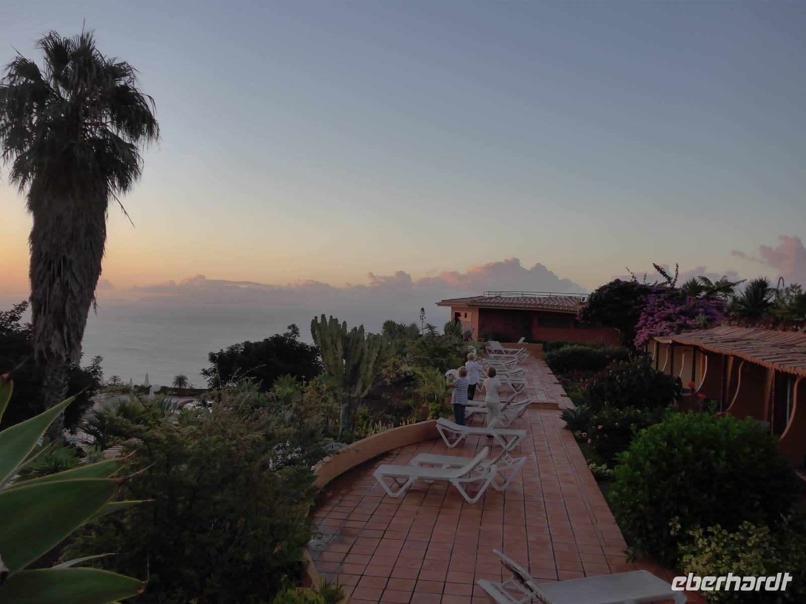 An einem sonnigen Tag ist es endlich soweit, unser Abenteuer Madeira beginnt Unsere Reisegruppe trifft sich pünktlich am Vormittag gegen 11.00 Uhr im Flughafen Leipzig/Halle. Dort erwartet uns leider eine riesige Warteschlange vor den Condor-Schaltern, so dass wir über eine Stunde warten müssen, bevor wir unser Gepäck aufgeben. Daher bleibt auch kaum Zeit, um gemütlich und in Ruhe zur Sicherheitskontrolle zu laufen. Es geht heute also alles etwas schneller und kaum angekommen am Gate, steigen wir auch schon ins Flugzeug. Unser Flug DE 4578 hebt mit allen 37 Reisegästen um 13.00 Uhr nach Funchal ab. Nun liegen noch rund 3.152,66 Kilometer Luftlinie auf unserem circa 4,5-Stunden Flug nach Madeira vor uns. Die nächsten acht Tage wollen wir die Blumeninsel im Atlantik seiner vielfältigen Flora und Fauna näher kennenlernen. Gegen 16.10 Uhr landen wir auf Madeira und werden mit einem herzlich Willkommen "bem-vindo!" begrüßt Dieses Mal müssen wir nicht solange warten und nach der Entgegennahme unserer Koffer werden wir in der Eingangshalle des Flughafen "Airport Santa Catarina" von unserer örtlichen Reiseleiterin Helena freundlich empfangen. Dann fahren wir gemeinsam zu unserem Übernachtungsort Caniço und dem wunderschönen Hotel "Quinta Splendida Wellness & Botanical Garden" für die kommenden acht Tage. Madeira heißt ins Deutsche übersetzt "Holz". Sie ist 57 Kilometer lang und 22 Kilometer breit. Auf einer Gesamtfläche von rund 740 Quadratkilometern leben über 230.000 Einwohner. Madeira besteht aus vier Inseln und ist ein Archipel im Atlantik. Neben der gleichnamigen Hauptinsel gehört die wesentlich kleinere, aber noch besiedelte Insel Porto Santo (42 km²) hinzu. Dann gibt es noch die "verlassenen" unbewohnten Wüsteninseln "Ilhas Desertas", bestehend aus Ilhéu Chão, Deserta Grande und Bugio, welche zusammen eine Gesamtfläche von rund 14 km² aufweisen. Die vierte zugehörige Inselgruppe sind die circa 280 Kilometer entfernten Wilden Inseln "Ilhas Selvagens". Madeira ist eine autonome Region, also sie ist nicht selbstständig, sondern sie besitzt zwar ein eigenes Parlament, aber handeln nach portugiesischen Gesetz. Die Busfahrt von nicht einmal zehn Kilometern dauert auch nur wenige Minuten und der Check-In im Hotel verläuft ebenfalls reibungslos. Dann treffen wir uns zur Einführungsveranstaltung mit Helena und unserem Willkommensgetränk, dem leckeren Madeira-Wein Ungefähr eine halbe Stunde später beziehen wir unsere Zimmer und bestaunen die riesige Anlage. Das Hotel liegt inmitten einer rund 30.000 Quadratmeter großen Fläche botanischer Gärten mit mehr als 1.000 verschiedenen Pflanzen. Das älteste Gebäude ist das im 14. Jahrhundert restaurierte Herrenhaus mit eine großen Sammlung an Antiquitäten. Dieses Hotel bietet momentan 166 Wohneinheiten, Rezeption, Aufenthaltsraum, große Sonnenterrasse, die Restaurants "Galeria" und "La Perla" sowie die Thai Lounge mit asiatischer Fusionsküche. Wir sind vollkommend überwältig von Größe und Schönheit der Hotelanalge. Bis zum Abendessen entspannen wir in unseren großen Zimmern oder spazieren durch Caniço. Dieses Örtchen gehört zum Kreis Santa Cruz und befindet sich an der Ostküste in 0 bis 400 Meter Höhe. Um 18.55 Uhr findet sich der Großteil unserer Gruppe wieder zusammen für ein gemeinsames Abendessen im Restaurant "Café Klenk". Während einige Gäste den kostenlosen Shuttle des Restaurants nutzen, laufen die anderen Gäste rund 20 Minuten bergab bis zum Restaurant. Einige Gäste probieren bereits die landestypischen Gerichte Madeiras wie "Espetada" (Fleischspieß) oder "Espada" (Degenfisch). Das Essen ist köstlich und auch das Restaurantambiente gefällt uns. Wir können dieses Restaurant und das Essen wirklich empfehlen, ein gelungener Start unserer aufregenden Reise Der Abend neigt sich langsam dem Ende und wir freuen uns schon auf unsere Betten und ein wenig Schlaf. Während die meisten Gäste zum Hotel zurück chauffiert werden, spazieren zwei Gäste und die Reisebegleiterinnen bei frischer angenehmer Abendluft die rund 20 Minuten wieder bergauf. Wir wünschen eine gute Nacht "Boa noite!" und vielleicht träumt der ein oder andere Reisegast schon von den Erlebnissen und Highlights der kommenden Tage.