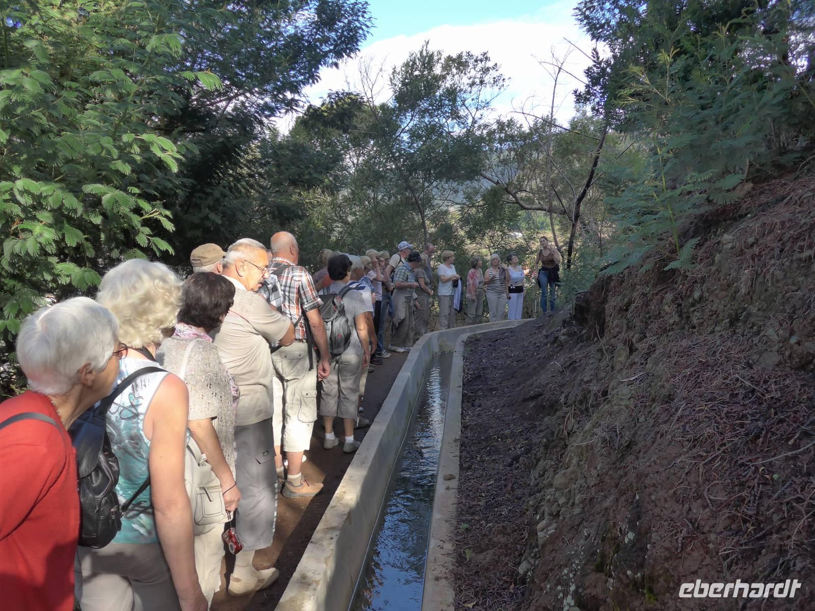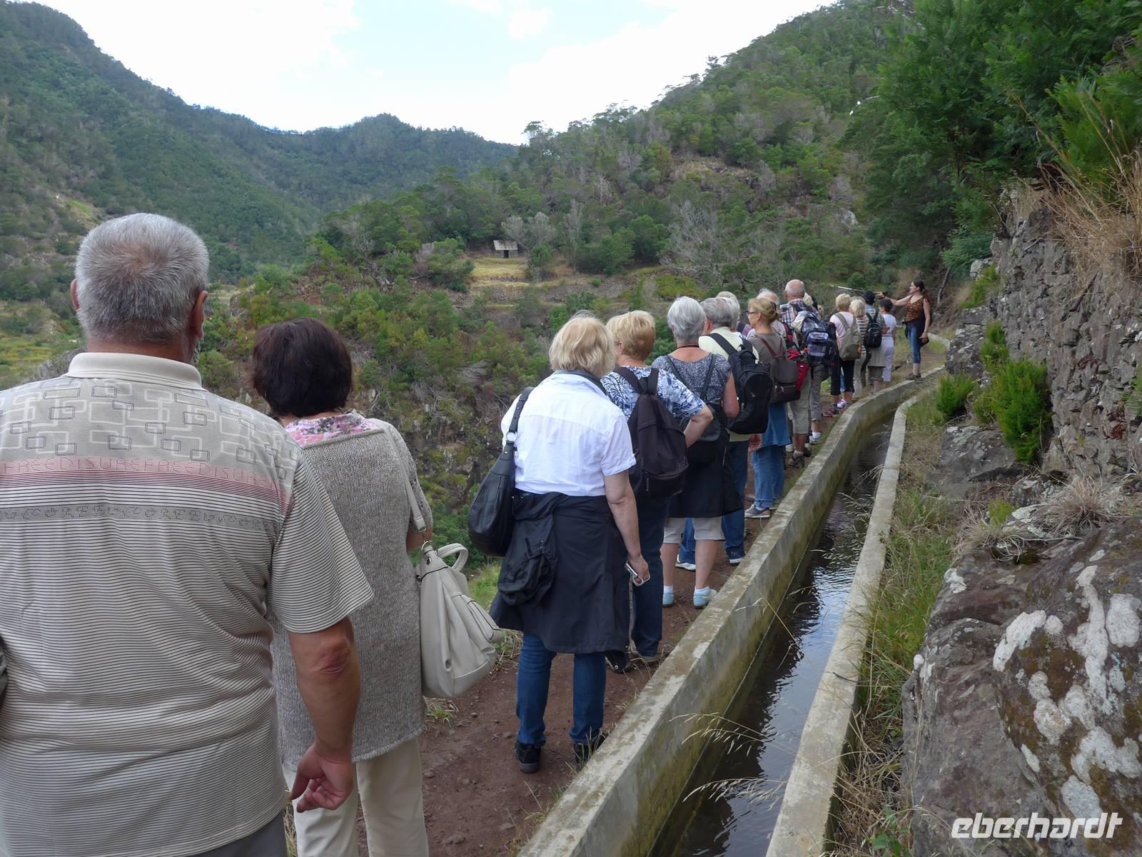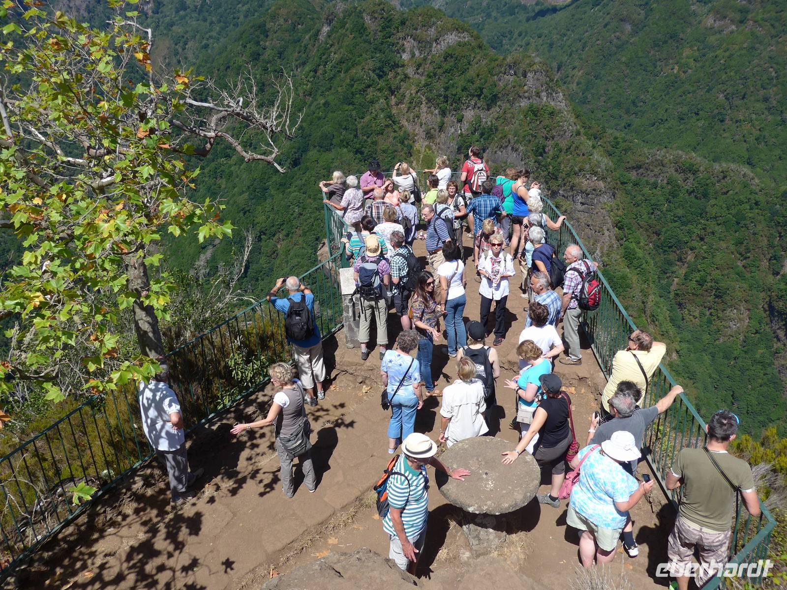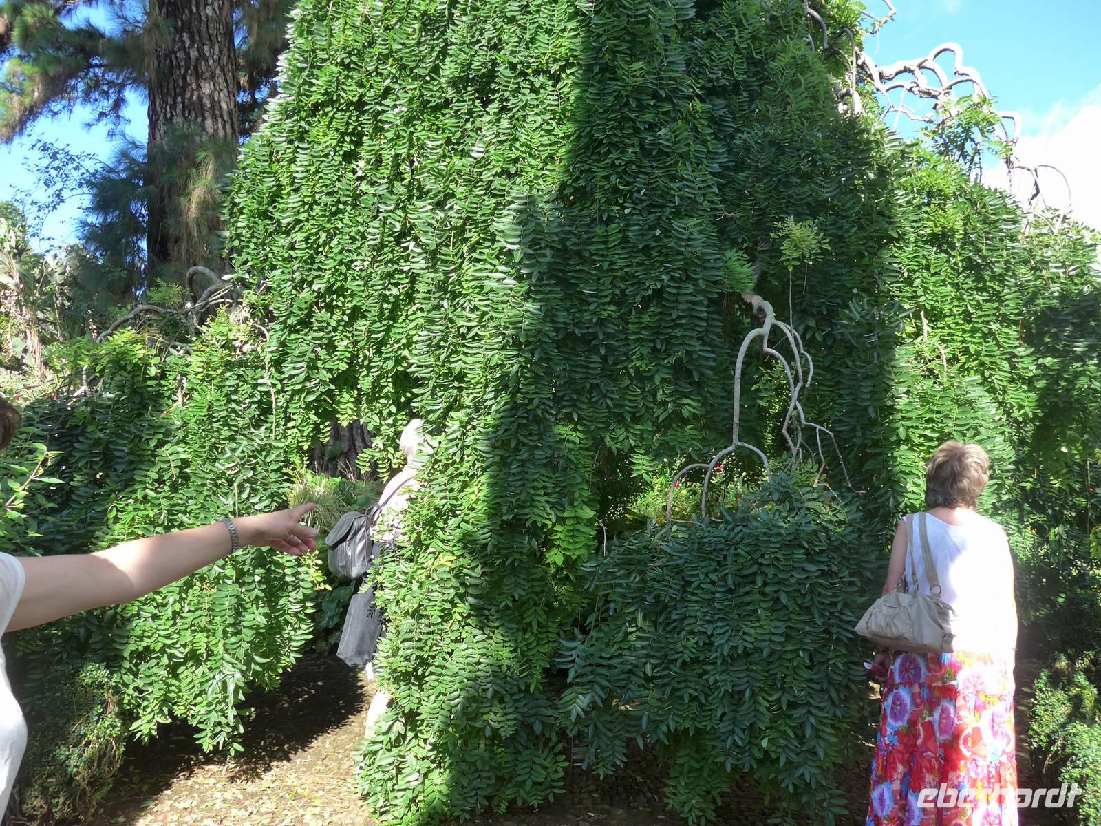 In unserer ersten Nacht auf Madeira bekommen wir ausreichend Schlaf und nach einem reichhaltigen Frühstück starten wir zur ersten Etappe unserer spannenden Reise. Wir werden von Helena und unserem Busfahrer Roberto abgeholt, um zum Zentrum der Korbflechtkunst nach Camacha zu fahren und die Korbflechter bei ihrer Arbeit zu bestaunen. Helena und Roberto werden uns auf unserer abenteuerlichen Reise begleiten und uns ihre wunderschöne Blumeninsel zeigen. Helena spricht sehr gut Deutsch und wir freuen uns schon, dass sie uns die kommenden Tage von Madeira verzaubern wird. Camacha ist ebenfalls eine Gemeinde von Santa Cruz und sie liegt rund 700 Meter hoch an der Verbindungsstraße der Hauptstadt Funchal mit Santo António da Serra. Nach unserem Besuch in der Korbflechterei und einen Blick in die moderne 2003 erbaute katholische Kirche folgt auch schon der nächste Programmpunkt, nämlich der Pico do Arieiro. Während der Fahrt erläutert uns Helena unter anderem den Fischfang des für Madeira bekannten schwarzen Degenfisches und sie zeigt uns Avocado-Bäume, Anone-Bäume mit der Frucht Cherimoya (oder auch Ochsenherz, Tutti-Frutti-Frucht, Zuckerapfel oder Zimtapfel genannt), Zuckerrohr, Mango, Papaya, Kaffeebohnen oder Feigen. Außerdem nennt sie uns die fünf wichtigsten Farben orange, weiß, grün, blau und schwarz der Insel und gibt wichtige Informationen zur landestypischen Fado-Musik. Bei unserer Ankunft auf dem mit 1818 Metern drittgrößten Berg Madeiras, den Pico do Arieiro, haben wir herrlichem Sonnenschein mit sehr guter Fernsicht. Das Besondere dieses Berges ist, das er gegenüber den zwei höheren Bergen Madeiras, den Pico Ruivo mit 1861 Metern und dem Pico das Torres mit 1851 Metern über eine befahrbare Straße mit dem Bus erreichbar ist. Dann fahren wir weiter nach Ribeiro Frio. Wir erfahren von Helena, welche Bedeutung die Flagge Madeiras hat. Der gelbe Streifen in der Mitte steht für Sonnenschein, Blau für Atlantik und das rot-weiße Kreuz als Templerorden. In Ribeiro Frio wandern wir den rund 3,5 Kilometer ebenen Weg Vereda dos Balcões durch dichten Urwald und an einer Levada entlang. Levadas sind künstlich angelegte Kanäle, um Regenwasser aus dem niederschlagsreicheren Norden zu den südlichen landwirtschaftlichen Anbaugebieten zu leiten. Bei unserer tollen Wanderungen sehen wir zum Beispiel Lorbeerbäume, Farne, Usnea barbata (Bartflechte), Douglasien, Koniferen, Thuja (Lebensbäume), Girlandenblume (auch als Falscher Ingwer bezeichnet) oder Yucca Palme. Rund eine Stunde später sitzen wir alle zusammen und genießen unseren ersten leckeren "Poncha" auf Madeira Poncha setzt sich zu je einem Drittel aus dem Zuckerrohrschnaps "Aguardente de cana", Honig und Zitronensaft zusammen. Natürlich gibt es auch vom Poncha verschiedene Varianten, klassisch mit Zitrone oder andererseits auch mit Maracuja oder Orange. Die nächste Etappe des Tages ist der wunderschöne Ort Santana mit seinen für Madeira bekannten mit Weizenstroh bedeckten Bauernhäuschen. Der Name Santana kommt von heiliger Santa Anna, der Mutter von Maria. Dieses Örtchen ist sowohl eine Cidade (Stadt) als auch Concelho (Kreis). Hier verbringen wir unsere Mittagspause und genießen eine leckere Suppe, (schwarzer) Degenfisch, Thunfisch oder Salat. Wir besichtigen die strohbedeckten Häuschen und schauen uns auf dem kleinen Bauernmarkt mit typischen Obst und Gemüse um. Helena zeigt uns unter anderem fünf verschiedene Sorten der Passiflora (Passionsblume) und ihren persönlichen Favorit, die Passiflora edulis oder Grenadilla (Maracuja-Passionsfrucht). Die prächtigen rosa Blüten der Passiflora mollissima (Bananen-Passionsfrucht) haben wir bereits bei unserer Wanderung gesehen ? Außerdem erhalten wir Informationen zu den als Paradiesfrucht, Philodendronfrucht oder Ananasbanane bezeichneten Früchte der Monstera deliciosa (Köstliches Fensterblatt), zu Süßkartoffeln, den Bananen und ihre Ernte nach Madeira-Art und auch zur für die Insel typischen Pipinella (auch Chayote, Chuchu oder Birnengemüse genannt). Im Anschluss fahren wir nach Portela, von wo wir einen wunderbaren Blick auf den Adlerfelsen Penha de Águia haben. Wir lassen uns schöne Blumen zeigen und einige Gäste kaufen ihre ersten Blumenzwiebeln. Den heutigen Abschuss bildet ein Foto-Stopp am Pico da Facho. Hier haben wir einen tollen Blick auf die Ostspitze Madeiras. Diese schmale Landzunge bezeichnen die Inseleinwohner liebevoll auch als Wurmfortsatz oder Blinddarm. Außerdem sehen wir die Landungsbucht Machico von Madeira und wir können sogar die Landung mehrerer Flugzeuge beobachten. Früher wurde die Start- und Landebahn von den Piloten gefürchtet, da sie mit 1.800 Metern sehr kurz war und sich direkt am Hang einer Steilküste befindet, wo Scherwinde vorkommen können. Im Jahre 2000 wurde sie auf 2.777 Meter ausgebaut, so dass eine Landung vieler Flugzeugtypen in Funchal möglich ist. Gegen 18.00 Uhr erreichen wir unser großartiges Hotel und entspannen bis zum gemeinsamen Abendessen in dem nur rund fünf Gehminuten entfernten Currascaria & Restaurante "a central". Heute essen wir eine typische Landesspeise, den für die Insel bekannten Fleischspieß Espetada und auch selbstgebackenes Knoblauchbrot. Als Aperitif trinken wir ein weiteres Mal den charakteristischen Madeira-Wein und leckere gegrillte Ananas als Nachtisch. Gegen 21.30 Uhr laufen wir zum Hotel zurück und lassen die Eindrücke des Tages Revue passieren