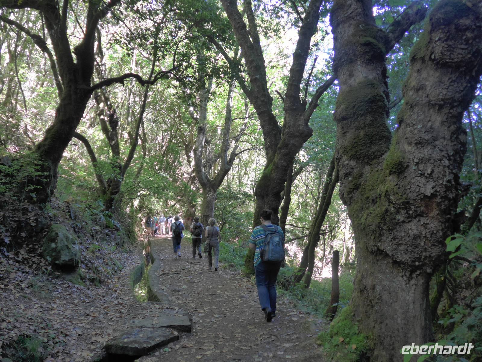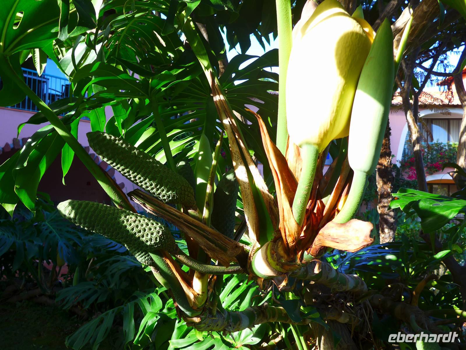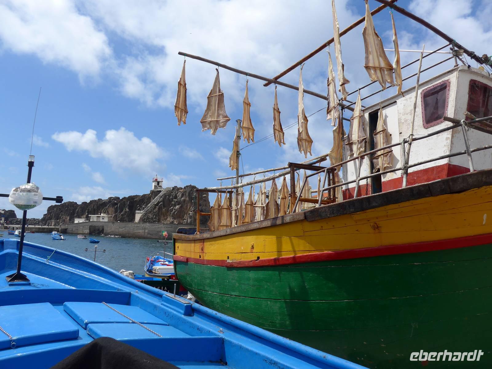 In unserer ersten Nacht auf Madeira bekommen wir ausreichend Schlaf und nach einem reichhaltigen Frühstück starten wir zur ersten Etappe unserer spannenden Reise. Wir werden von Helena und unserem Busfahrer Roberto abgeholt, um zum Zentrum der Korbflechtkunst nach Camacha zu fahren und die Korbflechter bei ihrer Arbeit zu bestaunen. Helena und Roberto werden uns auf unserer abenteuerlichen Reise begleiten und uns ihre wunderschöne Blumeninsel zeigen. Helena spricht sehr gut Deutsch und wir freuen uns schon, dass sie uns die kommenden Tage von Madeira verzaubern wird. Camacha ist ebenfalls eine Gemeinde von Santa Cruz und sie liegt rund 700 Meter hoch an der Verbindungsstraße der Hauptstadt Funchal mit Santo António da Serra. Nach unserem Besuch in der Korbflechterei und einen Blick in die moderne 2003 erbaute katholische Kirche folgt auch schon der nächste Programmpunkt, nämlich der Pico do Arieiro. Während der Fahrt erläutert uns Helena unter anderem den Fischfang des für Madeira bekannten schwarzen Degenfisches und sie zeigt uns Avocado-Bäume, Anone-Bäume mit der Frucht Cherimoya (oder auch Ochsenherz, Tutti-Frutti-Frucht, Zuckerapfel oder Zimtapfel genannt), Zuckerrohr, Mango, Papaya, Kaffeebohnen oder Feigen. Außerdem nennt sie uns die fünf wichtigsten Farben orange, weiß, grün, blau und schwarz der Insel und gibt wichtige Informationen zur landestypischen Fado-Musik. Bei unserer Ankunft auf dem mit 1818 Metern drittgrößten Berg Madeiras, den Pico do Arieiro, haben wir herrlichem Sonnenschein mit sehr guter Fernsicht. Das Besondere dieses Berges ist, das er gegenüber den zwei höheren Bergen Madeiras, den Pico Ruivo mit 1861 Metern und dem Pico das Torres mit 1851 Metern über eine befahrbare Straße mit dem Bus erreichbar ist. Dann fahren wir weiter nach Ribeiro Frio. Wir erfahren von Helena, welche Bedeutung die Flagge Madeiras hat. Der gelbe Streifen in der Mitte steht für Sonnenschein, Blau für Atlantik und das rot-weiße Kreuz als Templerorden. In Ribeiro Frio wandern wir den rund 3,5 Kilometer ebenen Weg Vereda dos Balcões durch dichten Urwald und an einer Levada entlang. Levadas sind künstlich angelegte Kanäle, um Regenwasser aus dem niederschlagsreicheren Norden zu den südlichen landwirtschaftlichen Anbaugebieten zu leiten. Bei unserer tollen Wanderungen sehen wir zum Beispiel Lorbeerbäume, Farne, Usnea barbata (Bartflechte), Douglasien, Koniferen, Thuja (Lebensbäume), Girlandenblume (auch als Falscher Ingwer bezeichnet) oder Yucca Palme. Rund eine Stunde später sitzen wir alle zusammen und genießen unseren ersten leckeren "Poncha" auf Madeira Poncha setzt sich zu je einem Drittel aus dem Zuckerrohrschnaps "Aguardente de cana", Honig und Zitronensaft zusammen. Natürlich gibt es auch vom Poncha verschiedene Varianten, klassisch mit Zitrone oder andererseits auch mit Maracuja oder Orange. Die nächste Etappe des Tages ist der wunderschöne Ort Santana mit seinen für Madeira bekannten mit Weizenstroh bedeckten Bauernhäuschen. Der Name Santana kommt von heiliger Santa Anna, der Mutter von Maria. Dieses Örtchen ist sowohl eine Cidade (Stadt) als auch Concelho (Kreis). Hier verbringen wir unsere Mittagspause und genießen eine leckere Suppe, (schwarzer) Degenfisch, Thunfisch oder Salat. Wir besichtigen die strohbedeckten Häuschen und schauen uns auf dem kleinen Bauernmarkt mit typischen Obst und Gemüse um. Helena zeigt uns unter anderem fünf verschiedene Sorten der Passiflora (Passionsblume) und ihren persönlichen Favorit, die Passiflora edulis oder Grenadilla (Maracuja-Passionsfrucht). Die prächtigen rosa Blüten der Passiflora mollissima (Bananen-Passionsfrucht) haben wir bereits bei unserer Wanderung gesehen ? Außerdem erhalten wir Informationen zu den als Paradiesfrucht, Philodendronfrucht oder Ananasbanane bezeichneten Früchte der Monstera deliciosa (Köstliches Fensterblatt), zu Süßkartoffeln, den Bananen und ihre Ernte nach Madeira-Art und auch zur für die Insel typischen Pipinella (auch Chayote, Chuchu oder Birnengemüse genannt). Im Anschluss fahren wir nach Portela, von wo wir einen wunderbaren Blick auf den Adlerfelsen Penha de Águia haben. Wir lassen uns schöne Blumen zeigen und einige Gäste kaufen ihre ersten Blumenzwiebeln. Den heutigen Abschuss bildet ein Foto-Stopp am Pico da Facho. Hier haben wir einen tollen Blick auf die Ostspitze Madeiras. Diese schmale Landzunge bezeichnen die Inseleinwohner liebevoll auch als Wurmfortsatz oder Blinddarm. Außerdem sehen wir die Landungsbucht Machico von Madeira und wir können sogar die Landung mehrerer Flugzeuge beobachten. Früher wurde die Start- und Landebahn von den Piloten gefürchtet, da sie mit 1.800 Metern sehr kurz war und sich direkt am Hang einer Steilküste befindet, wo Scherwinde vorkommen können. Im Jahre 2000 wurde sie auf 2.777 Meter ausgebaut, so dass eine Landung vieler Flugzeugtypen in Funchal möglich ist. Gegen 18.00 Uhr erreichen wir unser großartiges Hotel und entspannen bis zum gemeinsamen Abendessen in dem nur rund fünf Gehminuten entfernten Currascaria & Restaurante "a central". Heute essen wir eine typische Landesspeise, den für die Insel bekannten Fleischspieß Espetada und auch selbstgebackenes Knoblauchbrot. Als Aperitif trinken wir ein weiteres Mal den charakteristischen Madeira-Wein und leckere gegrillte Ananas als Nachtisch. Gegen 21.30 Uhr laufen wir zum Hotel zurück und lassen die Eindrücke des Tages Revue passieren