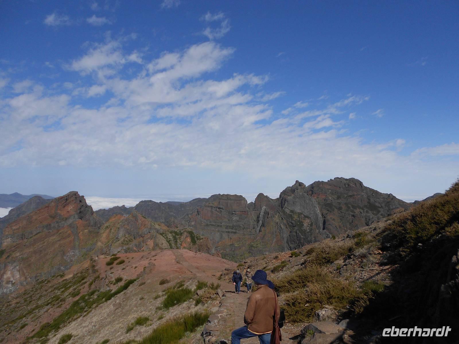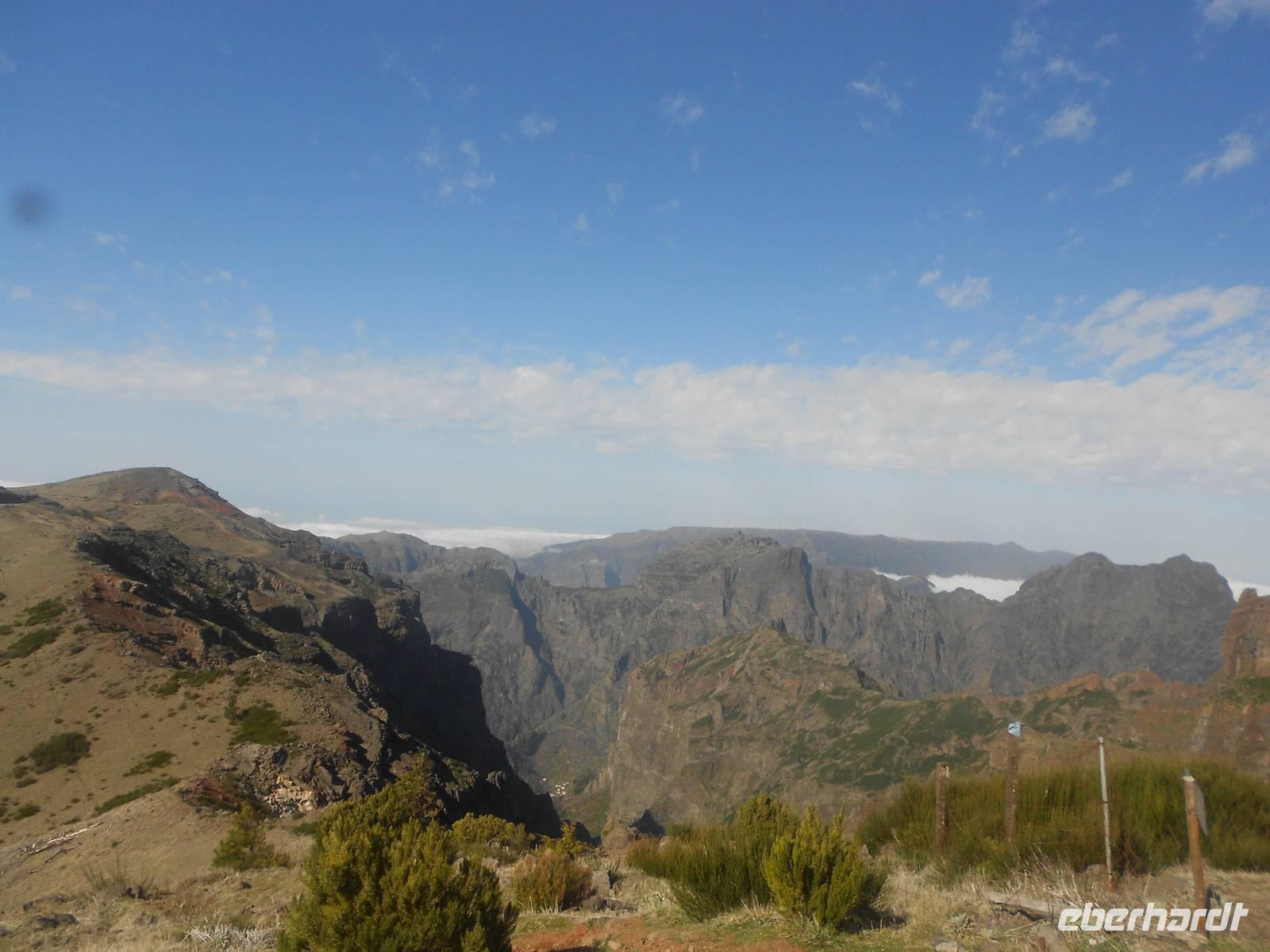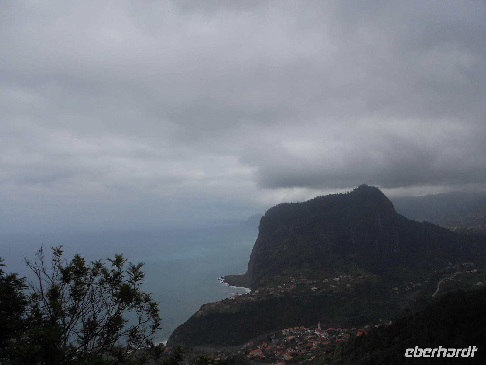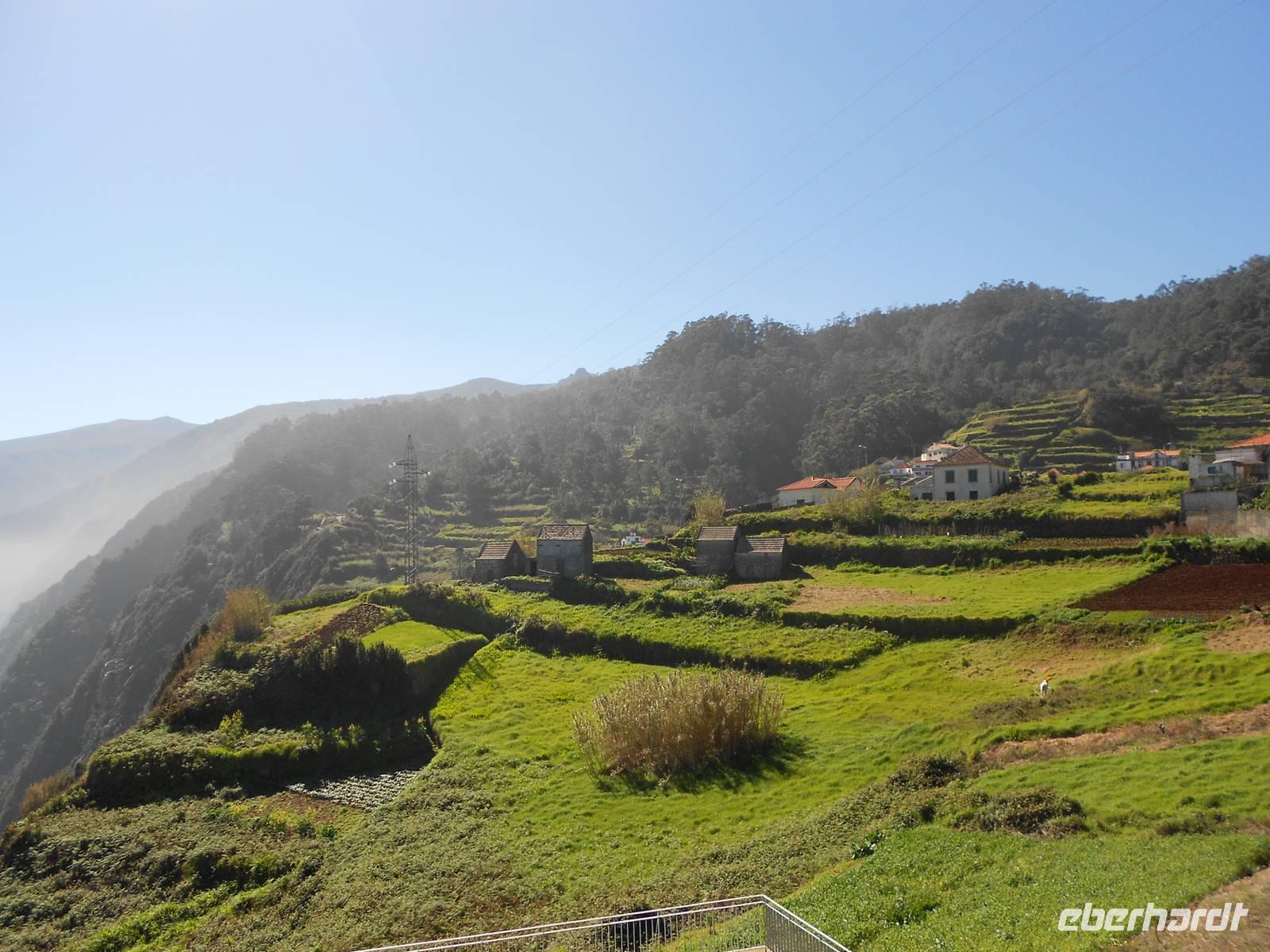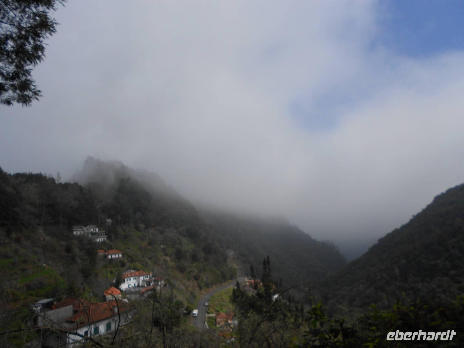 Nach einem ausgiebigen Frühstück und einem spektakulären Sonnenaufgang holt uns Fátima um 09:00 Uhr am Hotel ab und mit unserem Busfahrer Albano, der uns diese Woche begleiten wird, fahren wir nach Camacha in eine Korbflechterei. Hier gibt es Körbe in allen Formen, Farben und Größen. Besonders beeindruckend sind die geflochtenen Tiere und das Modell des Schiffes, mit dem Madeira im 15. Jahrhundert von portugiesischen Seefahrern eingenommen wurde. Im Keller können wir den Korbflechtern bei der Arbeit zusehen. Wir fahren im Anschluss weiter durch das Paradiestal: Unmengen von Hortensien, Azaleen, Akazien, Pinien, Kamelien, Eukalyptus, Heidelbeeren und vieles mehr verwöhnen unsere Augen und lassen uns über die Größe der Pflanzen staunen. Die Fahrt führt uns bis zum dritthöchsten Berg Madeiras, dem Pico do Arieiro. Mit 1412 m über dem Meeresspiegel genießen wir den Blick auf die Wolken unter uns und die karge Landschaft des Gebirges, die so unterschiedlich vom Rest der Flora Madeiras ist. Danach fahren wir wieder bergab und bewundern, nicht zum letzten Mal, die Fahrtkünste unseres Fahrers Albano, der den Bus sicher durch enge Kurven und sogar vorbei an entgegenkommenden Bussen und Autos, lenkt. In Ribeiro Frio sehen wir uns die Forellenzucht an, bevor wir eine kleine Levada-Wanderung starten, die uns zum Aussichtspunkt Balcoes führt. Doch schon der Nebel auf dem Weg verrät uns, dass wir nichts sehen werden. Davon lassen wir uns die Laune jedoch nicht verderben, das gehört eben dazu. Nach der kleinen und leichten Wanderung, die uns bereits einen ersten Eindruck über die einzigartigen Levadas verschafft, fahren wir nach Santana, das für seine strohgedeckten Häuser bekannt ist. Nach einer Mittagspause mit Brot, Wein und madeirischer Tomaten- oder Weizensuppe erkundet jeder nach Belieben das kleine Dorf. Einige Gäste greifen sogleich auf dem kleinen Markt zu uns kaufen regionales Obst, wie den berühmten Zuckerapfel, Maracujas oder Erdbeeren. Die Weiterfahrt führt uns vorbei an Zuckerrohrplantagen (Fátima erzählt uns, dass auf Madeira kein Zucker mehr hergestellt wird, sondern nur noch Zuckerrohrschnaps und Zuckersirup), Bananenstauden, Papaya- und Avocadobäumen, Strelitzien und terrassenförmigen Feldern. Oberhalb von Machico machen wir eine Pause und können von hier aus die berühmte kurze Start- und Landebahn des Flughafens bewundern. Am Nachmittag treffen wir im Hotel ein, bevor wir uns zu unserem Spezialitätenessen im Café Central aufmachen, bei dem uns die bekannten und wirklich schmackhaften Espetatas serviert werden, die am Tisch erst von den Spießen auf den Teller gebracht werden. Dazu gibt es Salat, frittieren Mais und als Dessert gegrillte Ananas. Besonders anrührend an diesem Abend ist eine große einheimische Familie am Nebentisch, die ihre Großmutter mit einem lauten Geburtstagsständchen und herzlichen Umarmungen zu Tränen rührt.