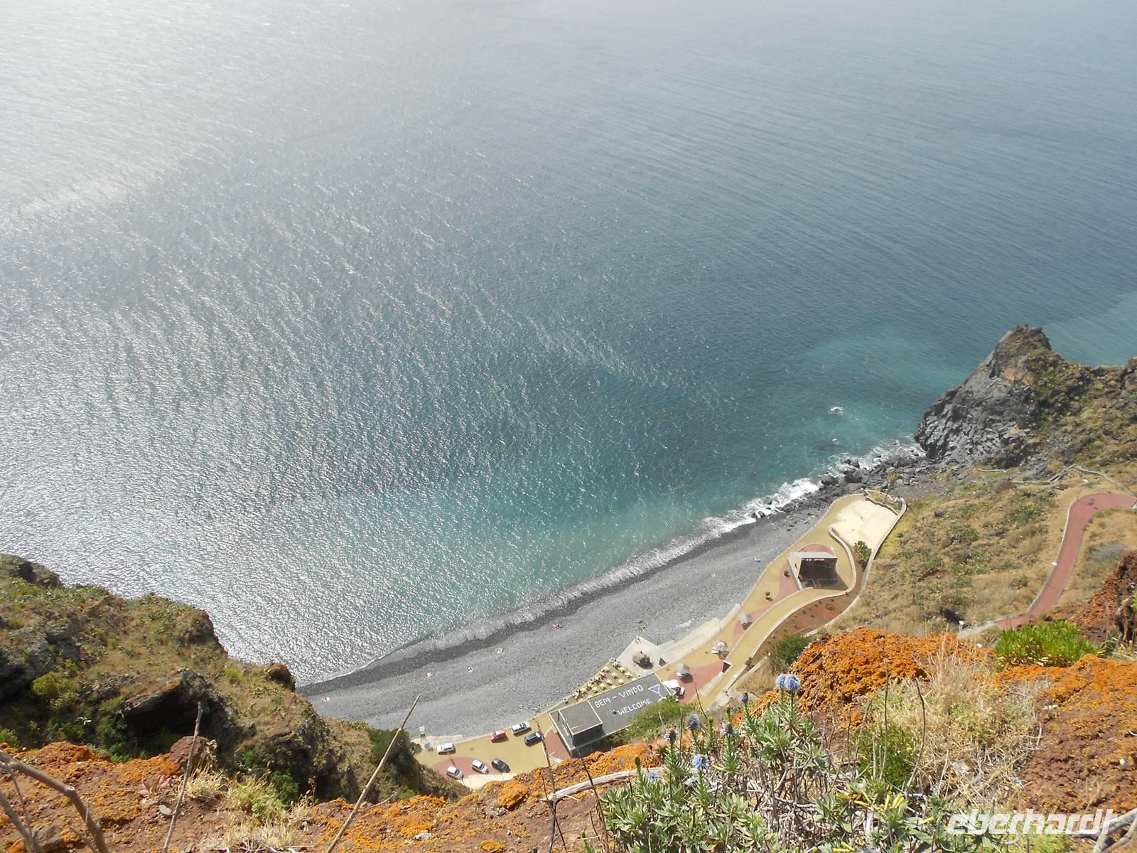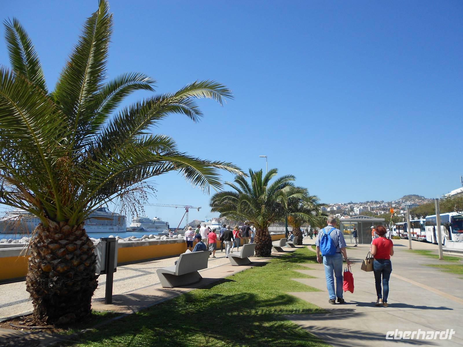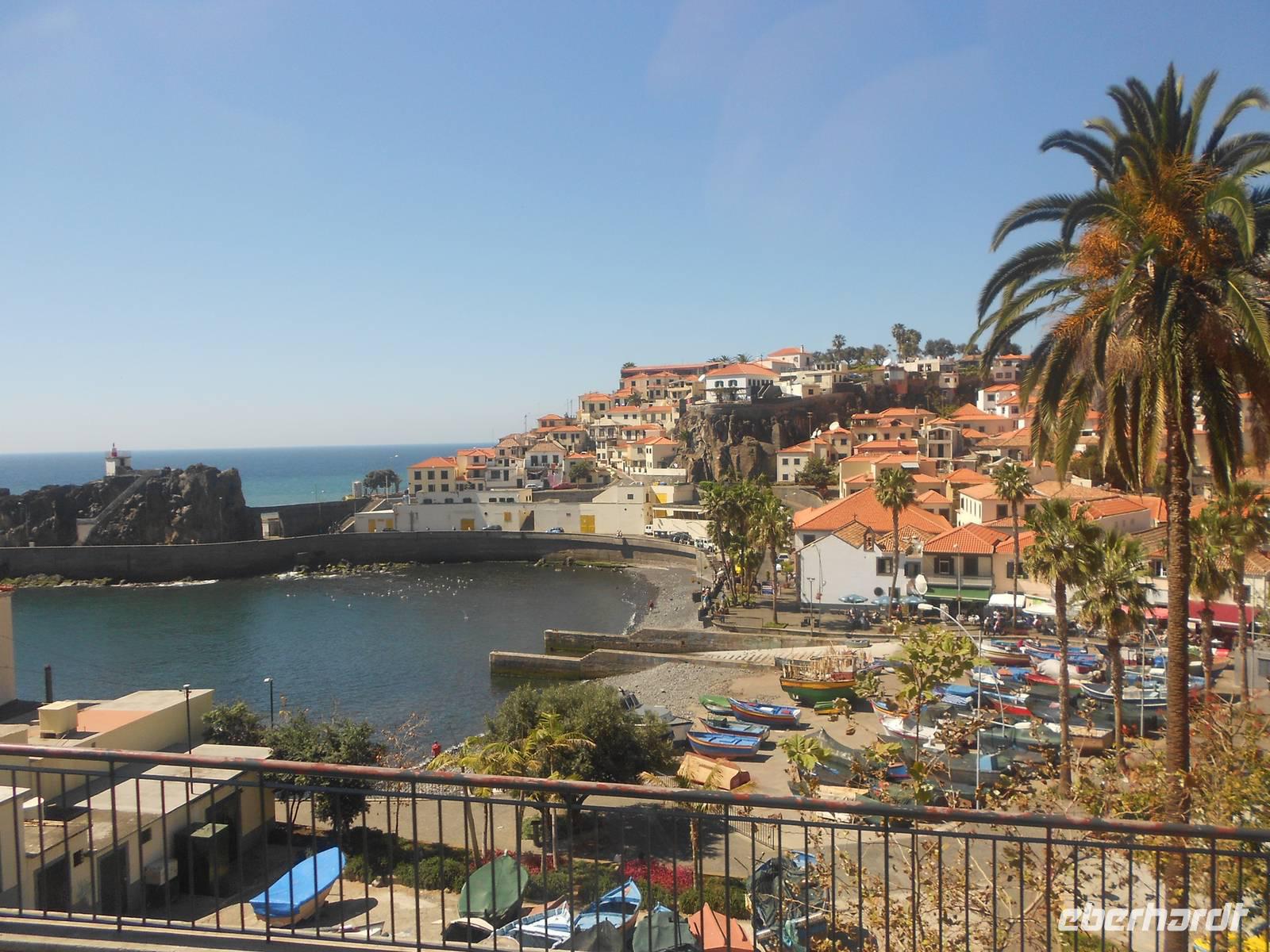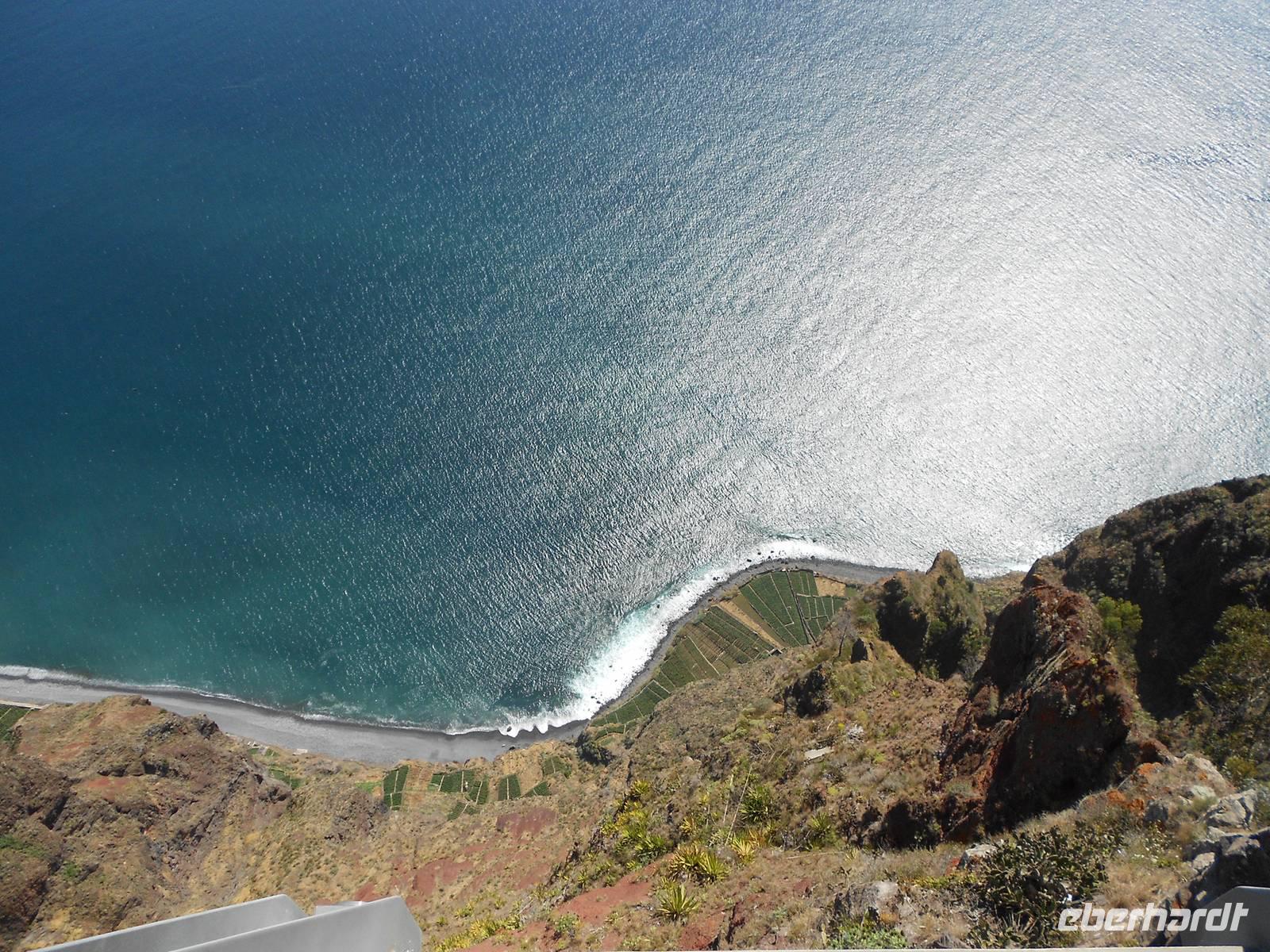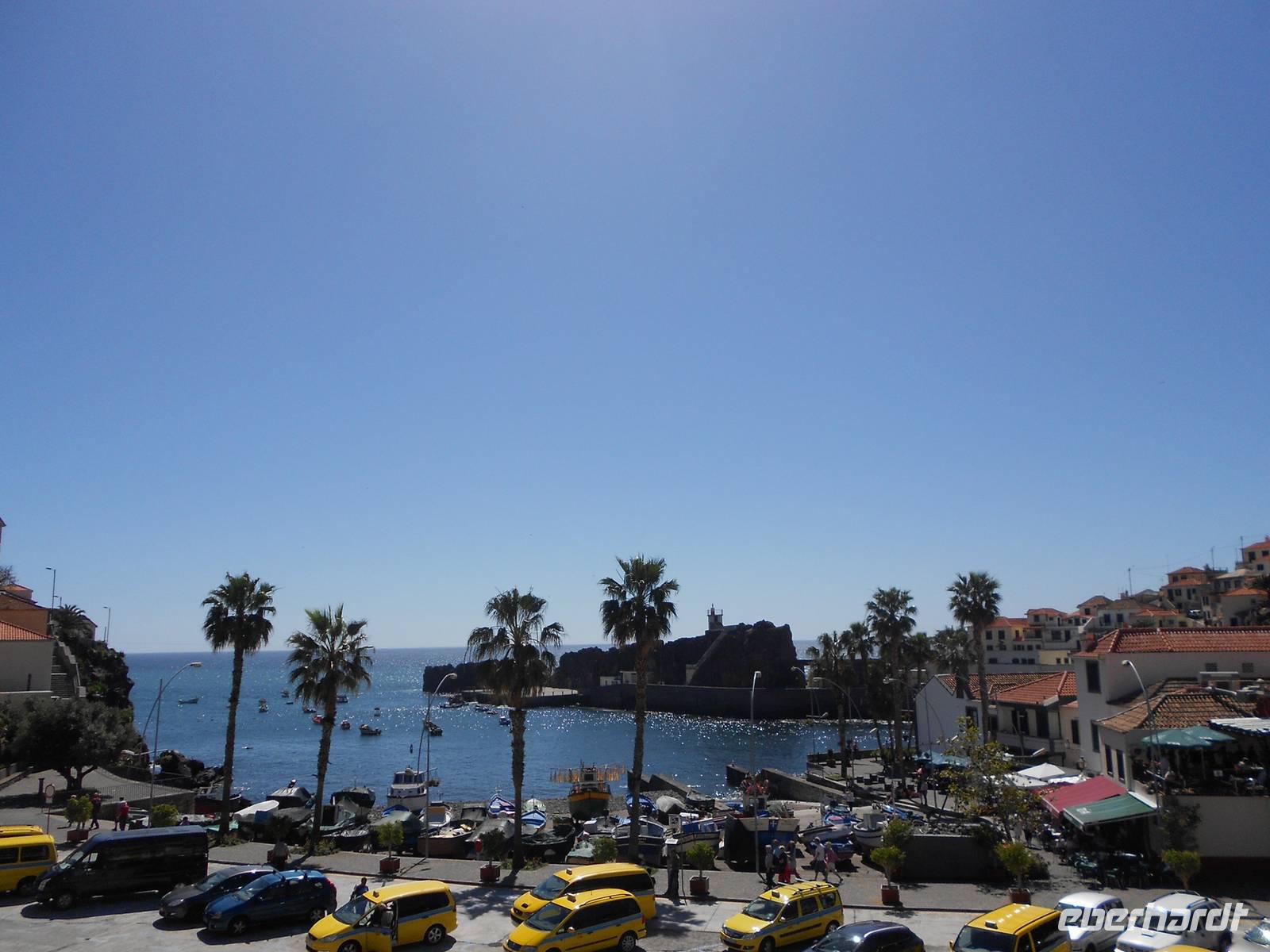 Heute führt uns der Weg erneut in Richtung der Hauptstadt Funchal, nämlich in den Botanischen Garten. Berühmt ist hier vor allem das Mosaik aus grünen und magentafarbenen Pflanzen in der Mitte des Parks. Hier erklärt uns Fátima erneut viel über die einheimischen und importierten Bäume und Blumen, deren Farbenpracht, Vielfalt und Größe uns immer wieder zum Staunen bringen. Wir haben Glück, dass wir so früh da sind, denn im Hafen liegen drei neue Kreuzfahrtschiffe an und während wir im Café die Sonne genießen, bewegen sich riesige Gruppen an Touristen durch den Garten. Wir fahren im Anschluss nach Funchal, wo sich deutlich mehr Verkehr und Trubel abspielen. Erster Stopp ist die Markthalle, in der wir Blumen, Obst, Gemüse und nicht zuletzt den Fischmarkt bestaunen. Bei einer Verkostung von verschiedenen Früchten, über die uns Fátima viel zu erzählen weiß, kommen einige Gäste auf den Geschmack und kaufen für unterwegs oder zuhaus noch weitere Spezialitäten ein. Auf dem Fischmarkt beeindrucken uns vor allem die riesigen Stücke von Thunfisch und der berühmte Degenfisch, der besser schmeckt als er aussieht. Wir schlendern weiter durch eine Gasse, in der sich Künstler mit der Gestaltung von Türen verewigt haben und laufen in Richtung Hafen, wo wir die Kreuzfahrtschiffe sehen. Das Schiff Santa Maria, ein Nachbau des Kolumbus-Schiffes, mit dem er 1492 in Richtung Karibik aufbrach und das heute Rundfahrten vor der Küste Madeiras anbietet, ist leider heute nicht zu sehen. Die Fahrt an der Küste entlang führt uns in das kleine Fischerdorf Camara do Lobos, in dem sich Winston Churchill durch seine Gemälde verewigt hat und machen eine Mittagspause. Wie genießen die Sonne, die das Meer zum Glänzen bringt und fahren zur höchsten Steilküste Europas, Cabo Girao. Dieser Ausblick ist nichts für Ängstliche; 580 m fällt die Küste steil ab und wer den Nervenkitzel liebt, betritt die gläserne Plattform. Allen anderen genügt auch der grandiose Blick auf die Küste und das Wasser. Als letzten Höhepunkt erwartet uns heute noch der Besuch eines Weingutes, das den bekannten Madeirawein herstellt. Wir genehmigen und ein kleinen Glas und probieren dazu den Honigkuchen. Gestärkt besteigen wir eine Anhöhe, über die sich ein weiterer toller Blick über die Landschaft bietet. Am Abend essen wir erneut in Klenk´s Café.
