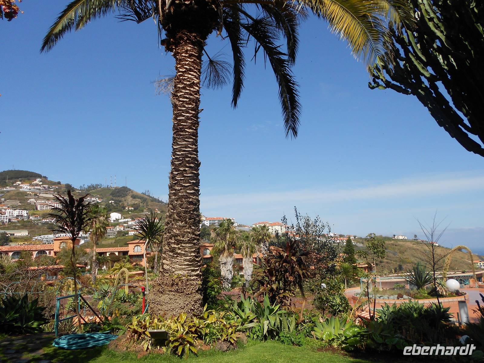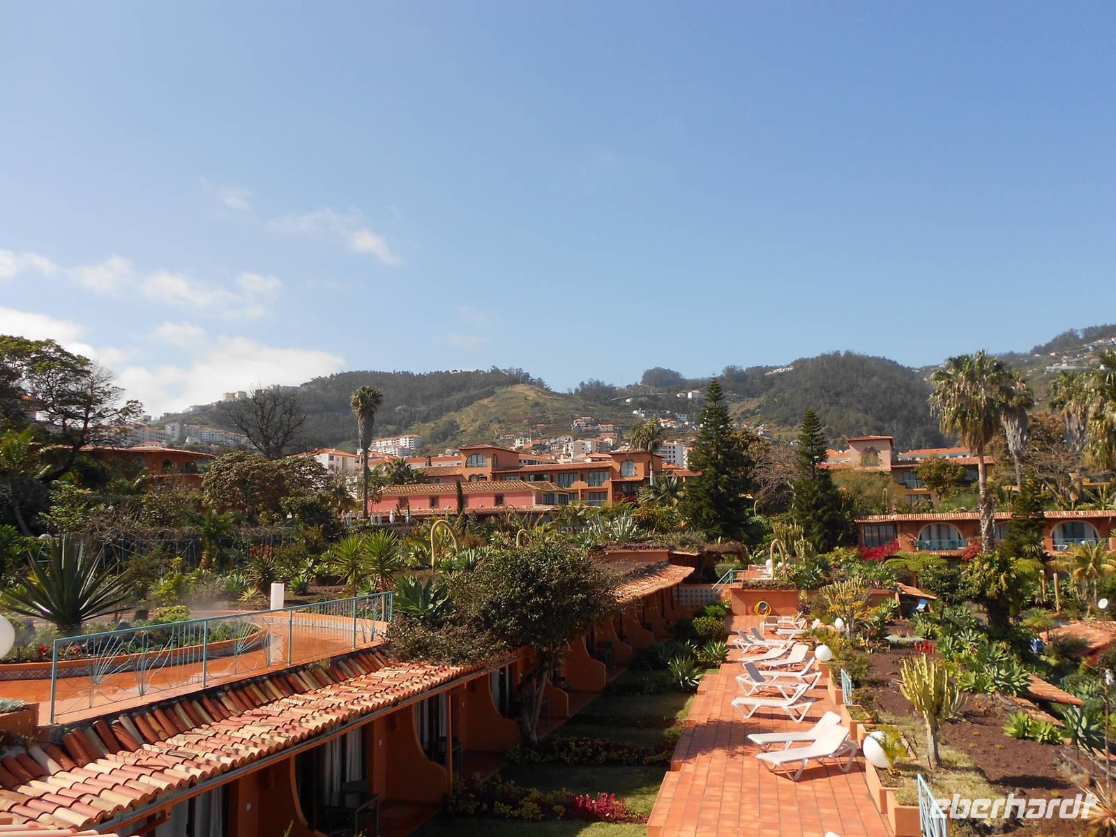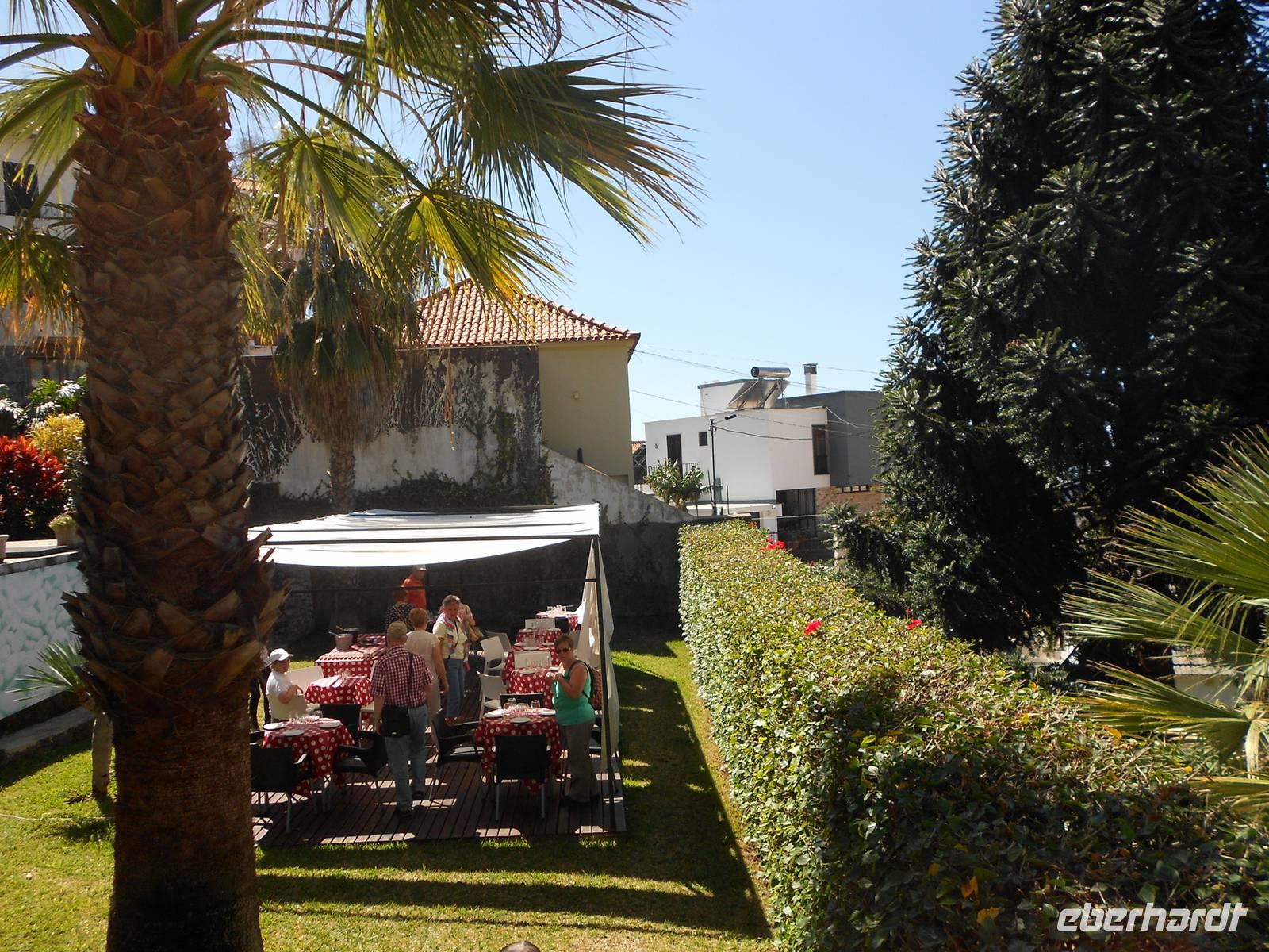 Wir starten sehr früh am Morgen in Richtung Leipzig Flughafen. Die meisten Gäste werden gegen 2:00 Uhr in der Früh von Zuhaus abgeholt und mit leichtem Schneeregen und im Dunkeln geht es zum Flughafen. Pünktlich noch vor 4:00 Uhr trifft sich die Gruppe und checkt gemeinsam ein. Die Gruppengröße beträgt 22 Personen und eine Reisebegleitung, eine Dame aus Stuttgart wird später am Nachmittag zu uns stoßen. Um diese Zeit ist noch nichts am Flughafen los, sodass der Check-In schnell und problemlos abläuft. Um 06:10 startet der Condor-Flieger mit Direktflug nach Funchal, Madeira. Noch vor der geplanten Ankunftszeit steigen wir um 09:15 Uhr Ortszeit (Madeira -1h) aus dem Flieger und genießen die frühlingswarme Brise und das schöne Wetter. Am Ausgang empfängt uns schon Fátima, unsere örtliche Reiseleiterin. Gemeinsam fahren wir mit dem Bus zum Hotel Quinta Splendida nach Canico. Unsere GSR-Gäste werden separat in ihr Hotel Rocamar in Canico de Baixo gefahren. Auf der Fahrt genießen wir alle die herrlichen Temperaturen, die Sonne und die bezaubernde Landschaft der Insel. Da der Check-In im Hotel erst am Nachmittag möglich ist, organisiert Fátima ein Begrüßungstreffen, bei dem jedem Gast ein Glas Madeirawein gereicht und die Planung der Woche besprochen wird. Am Nachmittag erkundet jeder individuell die tolle Hotelanlage, an die sich ein botanischer Garten anschließt. Um 18:45 Uhr treffen wir uns und gehen gemeinsam zum ersten Abendessen in das Restaurant A Lareira. Dort wartet ein Menü mit madeirischen Spezialitäten auf uns: frisches Brot mit Knoblauchbutter, Schweinefleisch Azeitonas, Fleisch oder Fisch und als Nachtisch hausgemachtes Tiramisu oder Obstsalat. Der gute Service und der hervorragende Wein tragen zu einer heiteren Stimmung der Gäste bei und schnell entwickelt sich eine tolle Gruppendynamik.