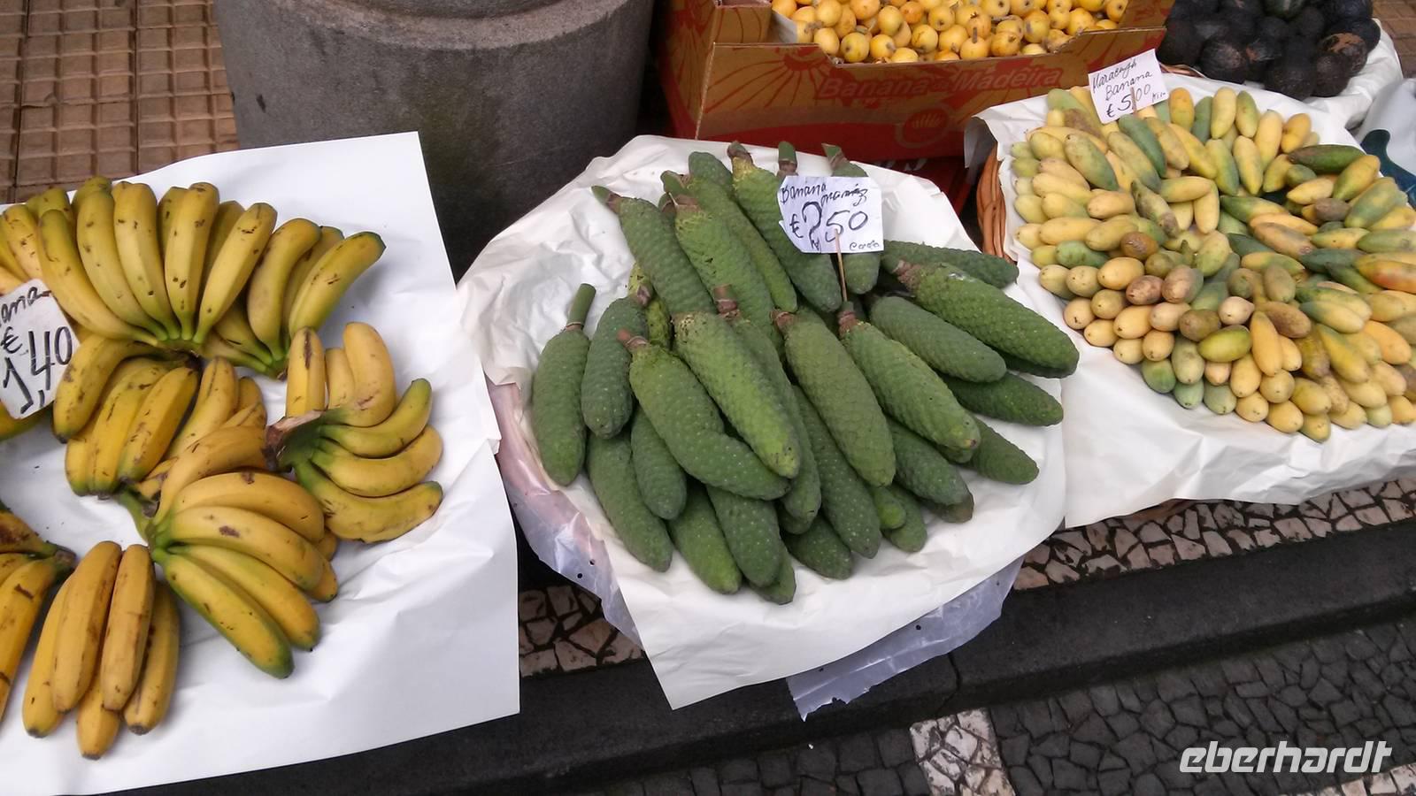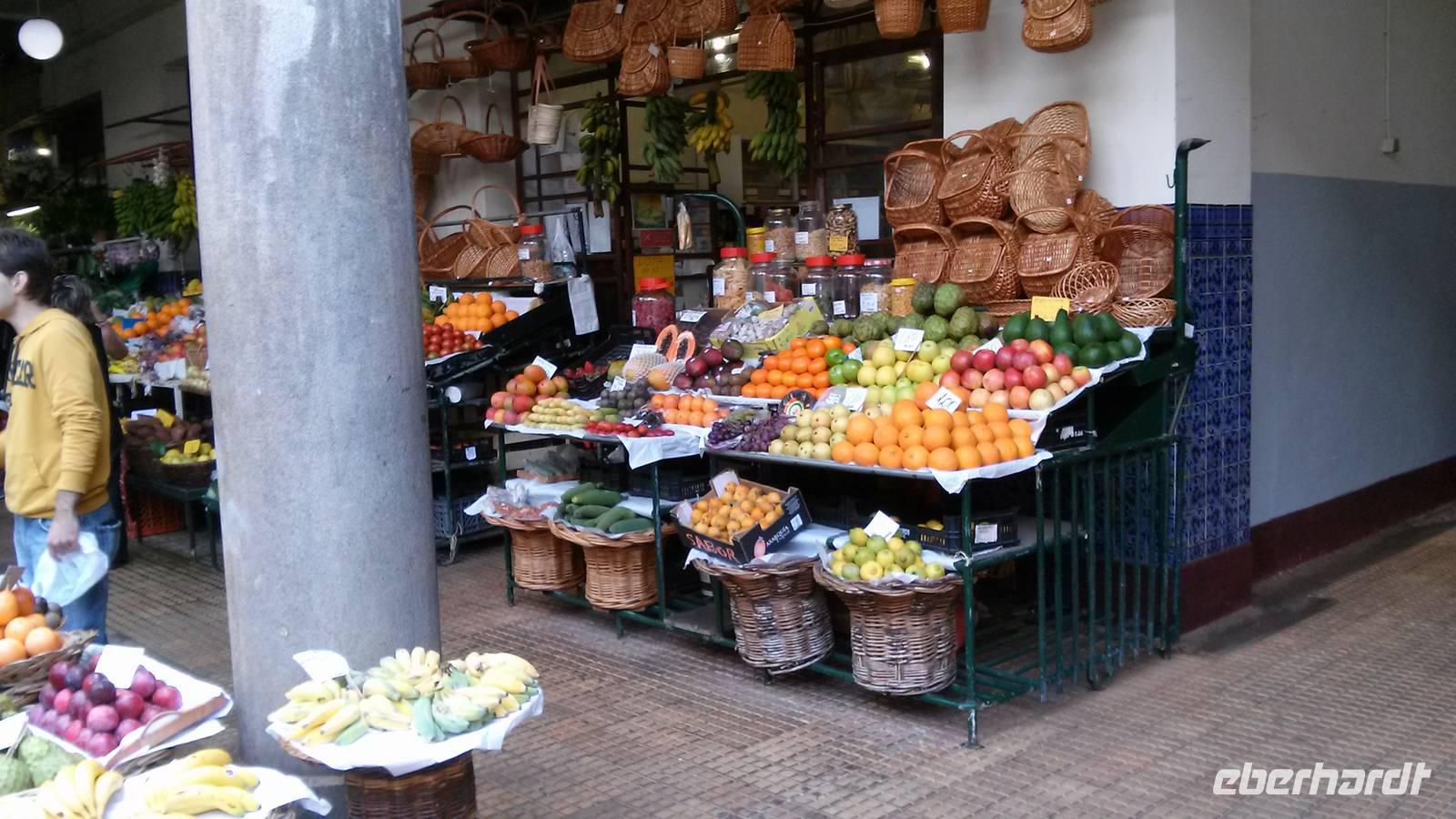 In Funchal selbst besuchten wir den "Mercado dos lavradores", den Bauernmarkt. Wobei hier nicht nur eine Halle mit den Erzeugnissen der Landwirtschaft existiert, sondern auch, etwas abgetrennt, eine Halle mit den Erzeugnissen der Fischerei, wo aber heute nicht viel los war. Neben Maracuja und den auch hier bekannten Früchten und Gemüsen gab es auch so exotische Früchte wie Cherimoya ('Felsenbirne') oder die Frucht des Philodendron.