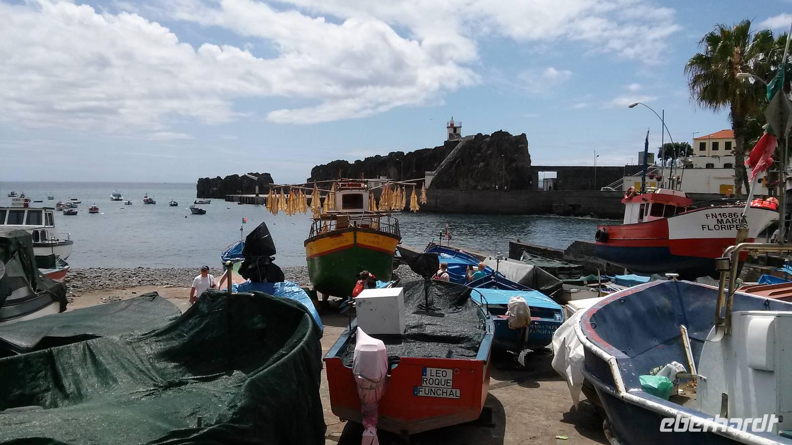 Im Anschluss fuhren wir durch Funchal nach Câmara dos Lobos, einem durch eine schützend ins Meer hineinragende Basaltwand wildromantischen Fischerhafen, wo tatsächlich noch die Fischer auf den Bänken sitzen und sich unterhalten. Sie fahren Nachts raus, abends, gegen 23:00. Der Name des Ortes verweist darauf, dass die ersten Siedler hier auf Robbenbänke stießen. Lobo von lateinisch Lupus, 'Wolf', ist auch der Seelöwe. Câmara wird wohl auf die kammerartige Ausgestaltung der Naturbucht zurückzuführen sein.