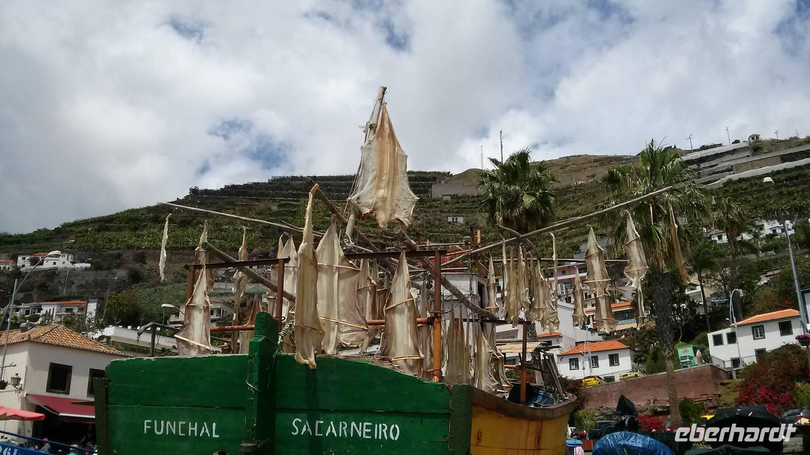 Wie extra für uns, stand im Hafen, auf Land gezogen auch ein Fischerboot, in/an dem Fisch zum Trocknen aufgehangen war.