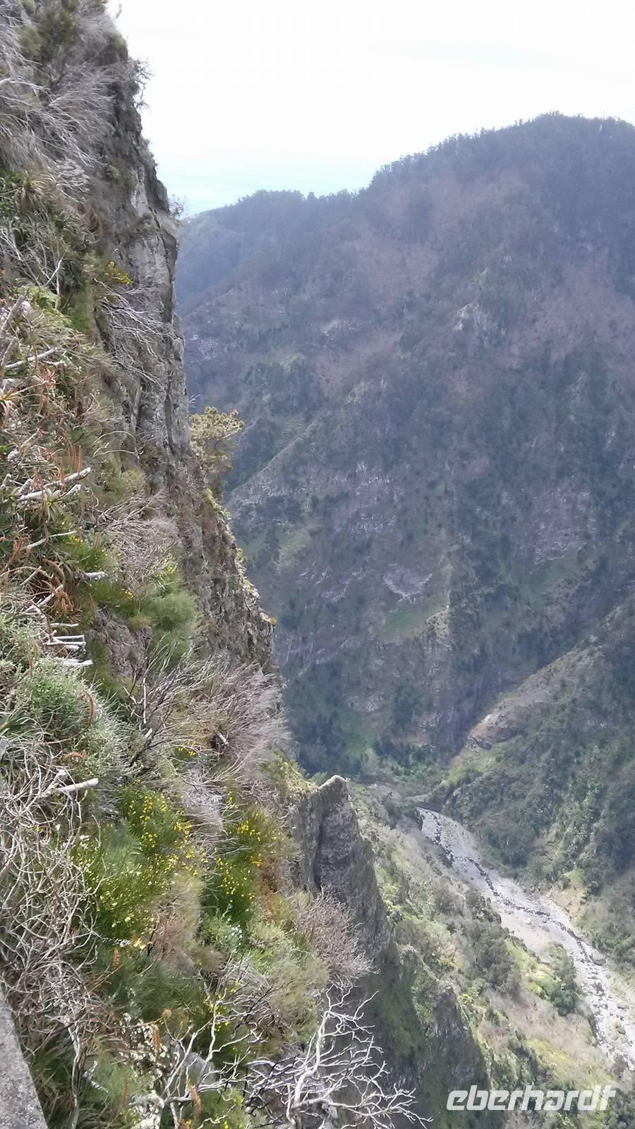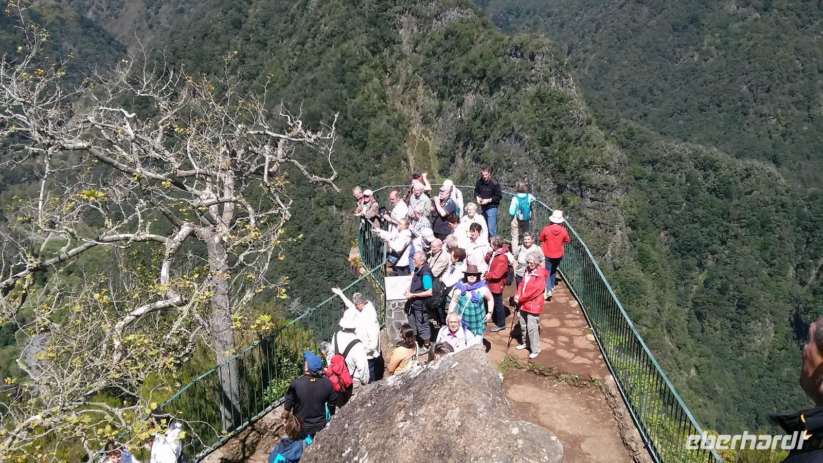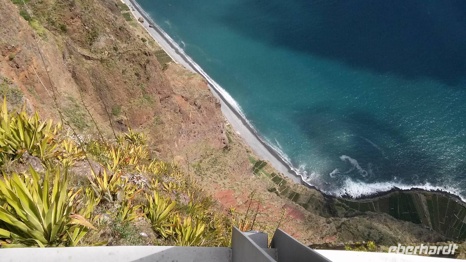 Höhepunkt des Tages war - sowohl im Erlebnis als auch geographisch gesehen - aber sicher die 580 m hohe Klippe am Cabo de Girão (Kap der Umkehr). Ähnlich wie beim berühmten Skywalk am Grand Canyon gibt es hier einen Balkon mit gläsernen Boden. Das Meer der Klippe ist an ihrem Fuß sofort mehrere hundert Meter tief. Für Bauern hat man dort einen Fahrstuhl gebaut, um die Terrassen, die auch hier angelegt worden sind, in einer besser vertretbaren Zeit als bisher zu erreichen. Neben Armutsauswanderung hat Madeira die meisten menschlichen Verluste wohl durch Abstürze von Klippen zu verschmerzen gehabt.