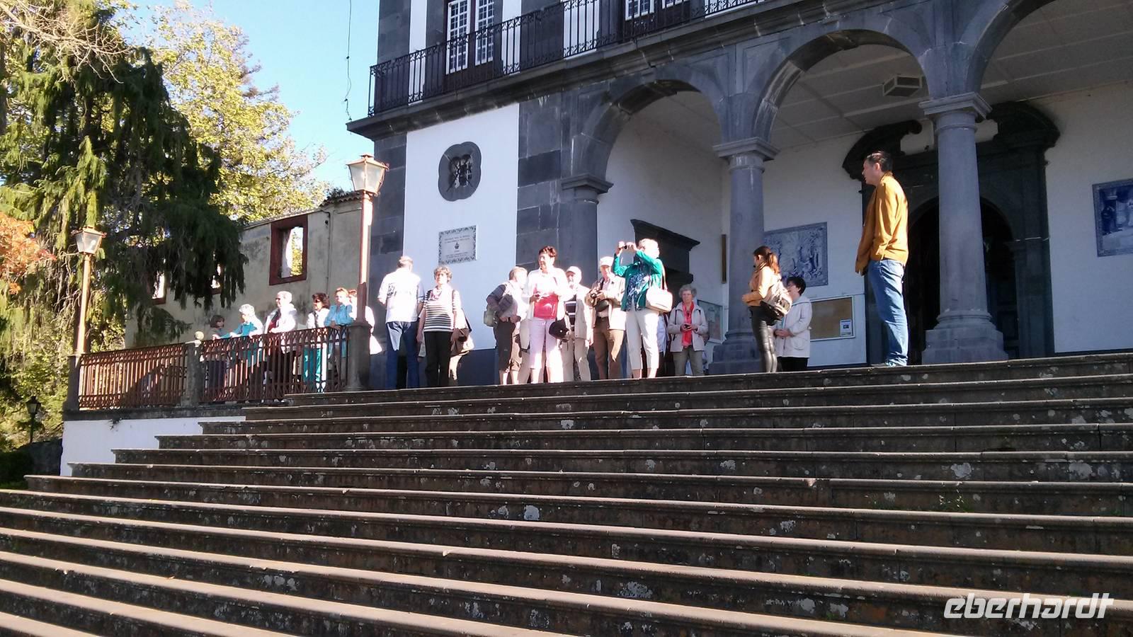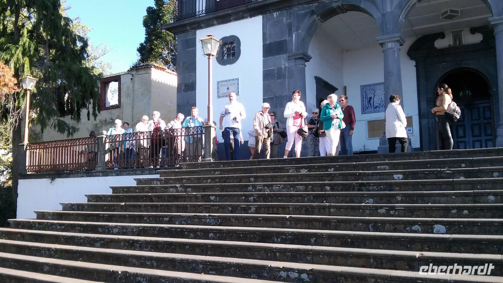 Zunächst pilgerten wir zur Wallfahrtskirche in Monte. Obwohl im Hafen sowohl die Aida als auch ein amerikanisches Kreuzfahrtsschiff lagen und die Reedereien ihre Gäste bei ihren Kurzvisiten auf Madeira gerne nach Monte schaffen, hatten wir die Kirche als Gruppe für einen Augenblick für uns alleine, konnten uns die Kirche und die Marienfigur ansehen.