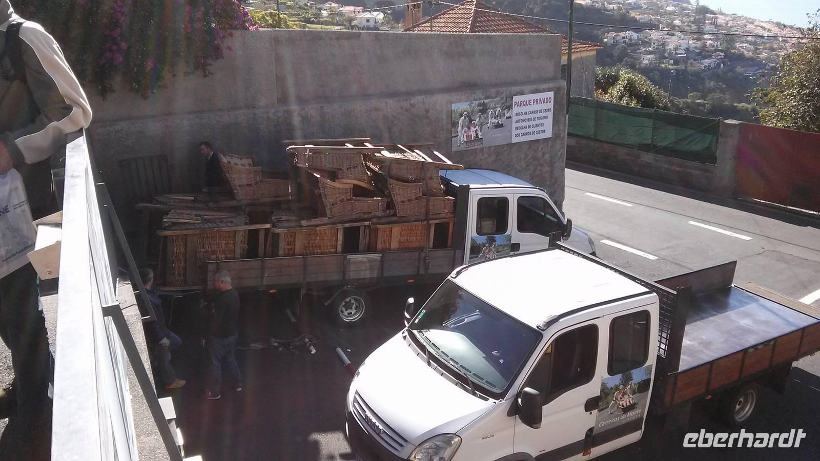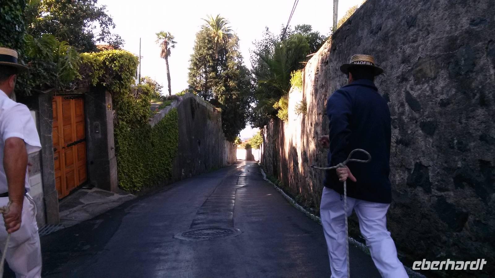 Bald aber wurden wir dann doch von einer anderen Reisegruppe gestört und wir beeilten uns, die Kirche zu verlassen, um im Korbschlitten (Carrinhos de Cesto) den Berg herunterzufahren. Jeweils zwei Herren mit mit Reifengummi besohlten Stiefeln geben dem Korbschlitten, den notwendigen Antrieb und aufgrund des Gefälles können die auf Holzkufen über den Asphalt gleitenden „kleinen Karren" dabei eine Geschwindigkeit von gut 50 km/h aufbauen. Mit einer solchen Geschwindigkeit unbehelmt in einem Weidenkorb auf eine Mauer zuzurasen ist... ...interessant...