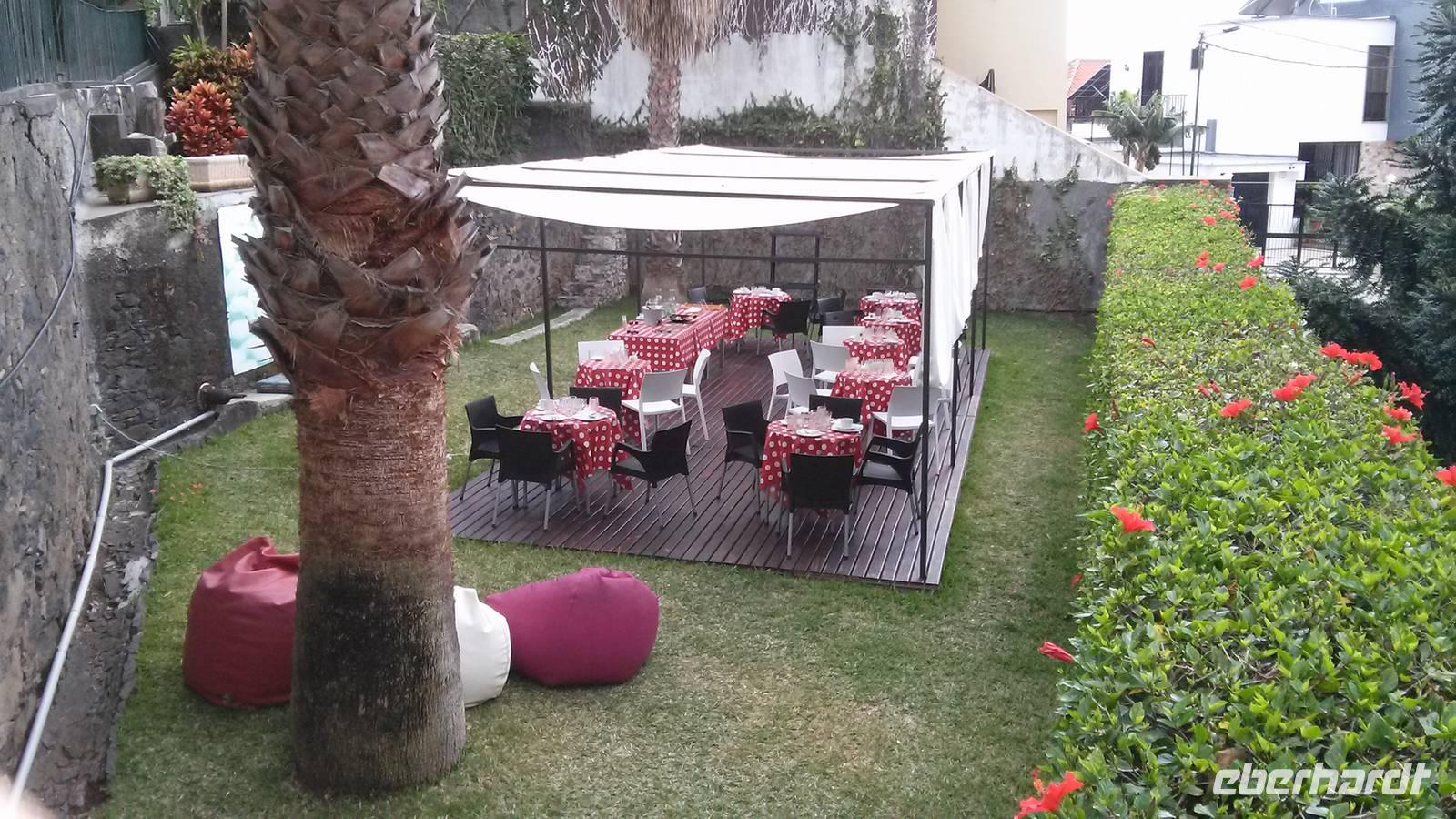 Maria Joãos Villa liegt in einem Stadtteil von Funchal, der mal von einer gehobenen bürgerlichen oder vielleicht auch adeligen Schicht bewohnt wurde, es stehen dort noch viele Villen, die an der Grenze zwischen Garten und Straße über einen zwar geschlossenen aber dennoch luftigen Pavillion verfügen. Auch Maria Joãos Villa verfügt über einen solchen, den sie aber als Lädchen für ihre Schokoladenprodukte gebraucht.