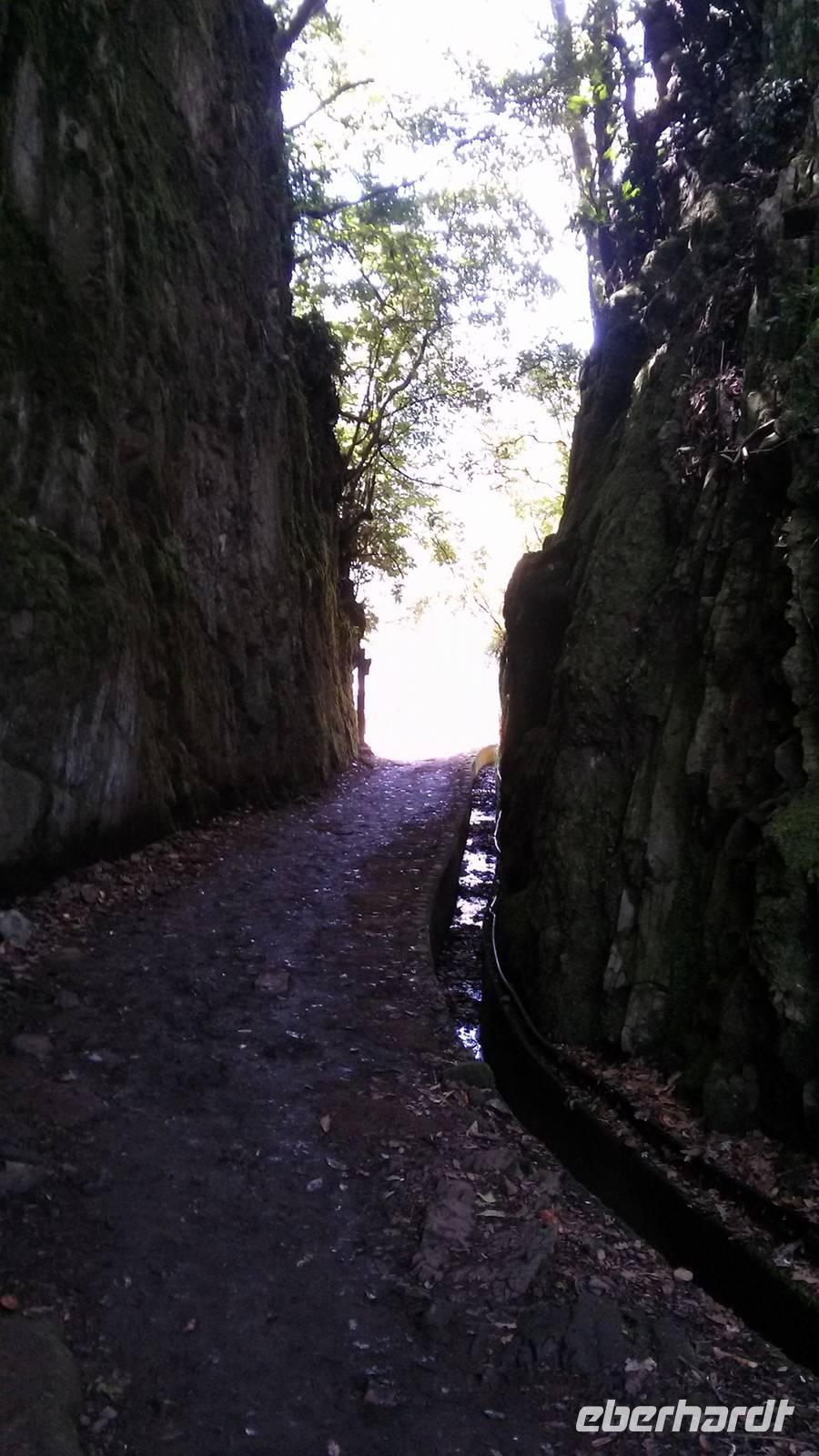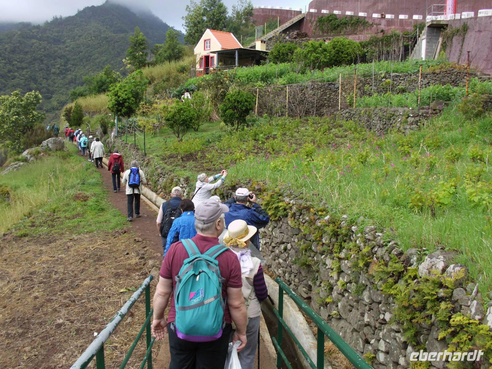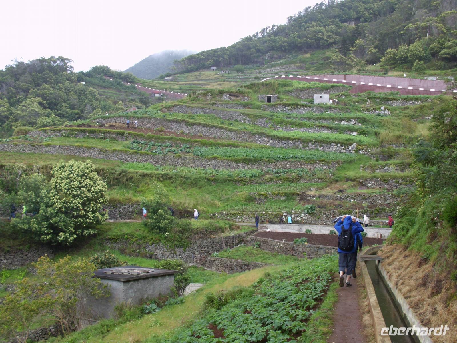 Für den Samstag war eine erste Levadawanderung oberhalb der Landungsbucht von Machico anberaumt. Zwischen Akazienwald und Terrassen ging es immer entlang der kleinen Levada dos Maroços. Levadas sind Aquädukte, welche angelegt wurden, um den Terrassenfeldbau auf Madeira zu ermöglichen. Sie werden aus Quellen und Wasserreservoirs gespeist und enden irgendwann im Meer. Dabei werden sie mit kaum merklichem Gefälle, so, dass das Wasser langsam fließt, den Hang entlang geführt. Gepflegt werden sie von den sogenannten Levadeiros, das sind i.d.R. einzeln arbeitende Männer, häufig begleitet von einem Hund. Sie sind im Auftrag der Regierung der Autonomie (~ „Bundesland") Madeira für Instandhaltung und Säuberung der Kanäle verantwortlich, müssen bei Überflutungsgefahr aber auch Schleusen öffnen, um so Schlimmeres zu verhindern.