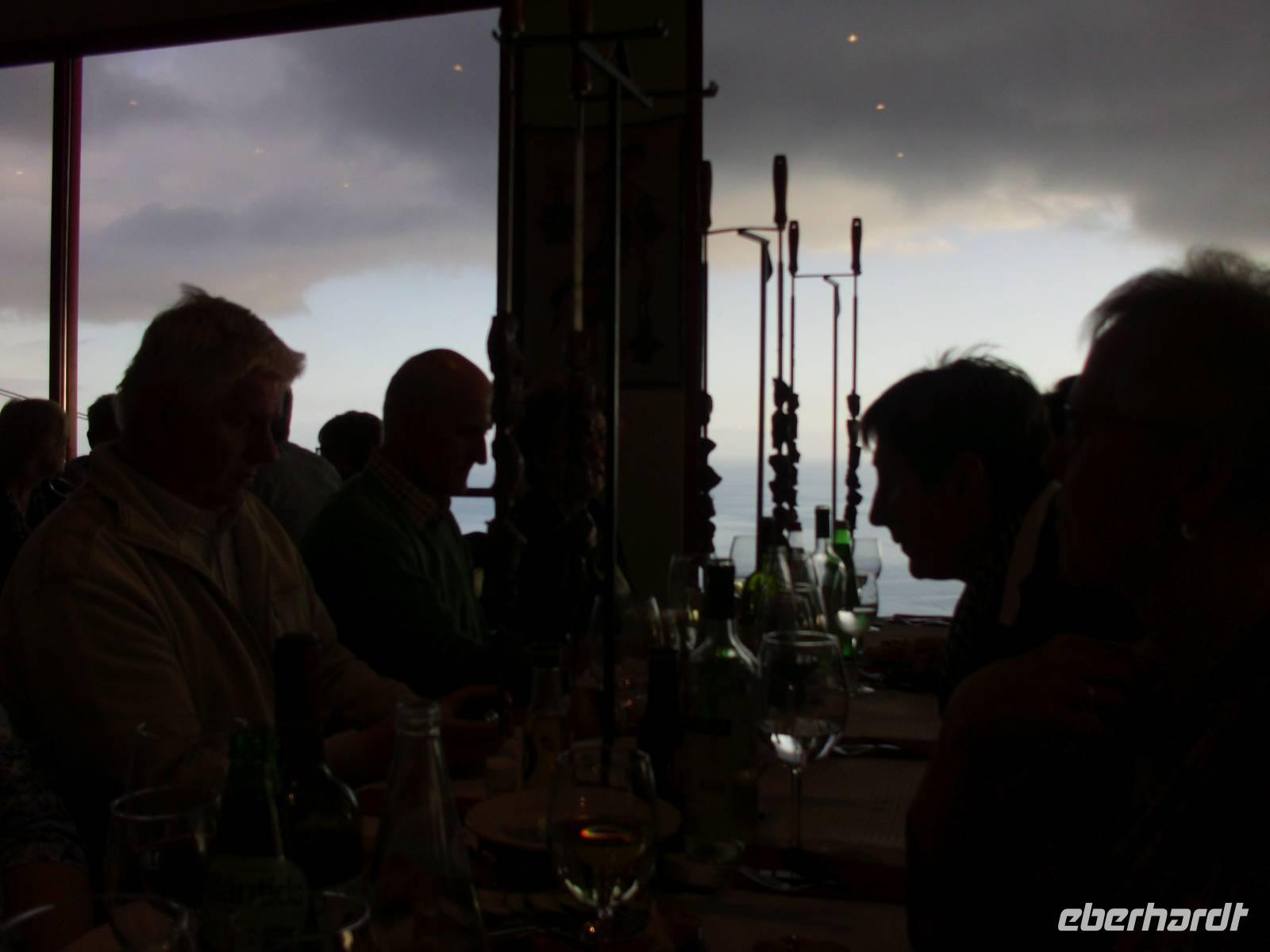 Abends im Restaurant Planka gab es für eine Truppe von zwanzig Personen Espetadas, begleitet von Gemüse, Pommes und fritierter Polenta. Das Planka liegt über Funchal und man genießt hier einen wunderschönen Blick auf die Stadt. Die Espetada hört sich zwar fast an, wie Espada, aber es handelt sich hierbei um einen Fleischspieß. Das Fleisch wird in Knoblauch, Weißwein und Lorbeerblättern eingelegt und dann am Spieß gegrillt. Die Namensähnlichkeit ist aber kein Zufall: Der Degenfisch heißt Espada, wie der Degen, und die Espetada ist auf einem degenartigen Spieß aufgespießt.