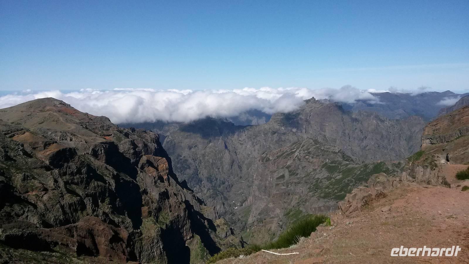 Von diesem Pass schauten wir in beide Richtungen, denn an der Boca de Encumeada kann man, theoretisch wenigstens, sowohl die Nord- als auch die Südküste sehen. Die Wellenbewegungen im Süden waren schwach im Nebel zu erkennen, der Norden aber versank leider im Wolkendunst.