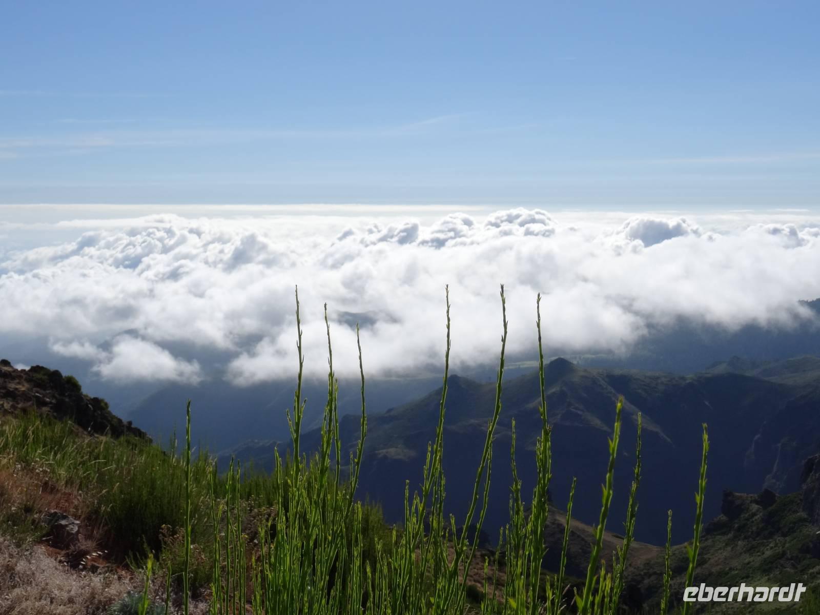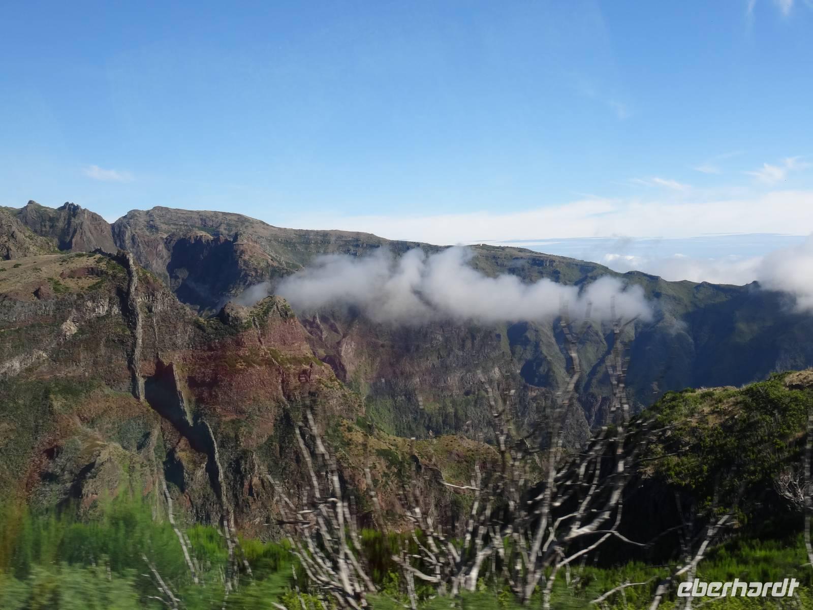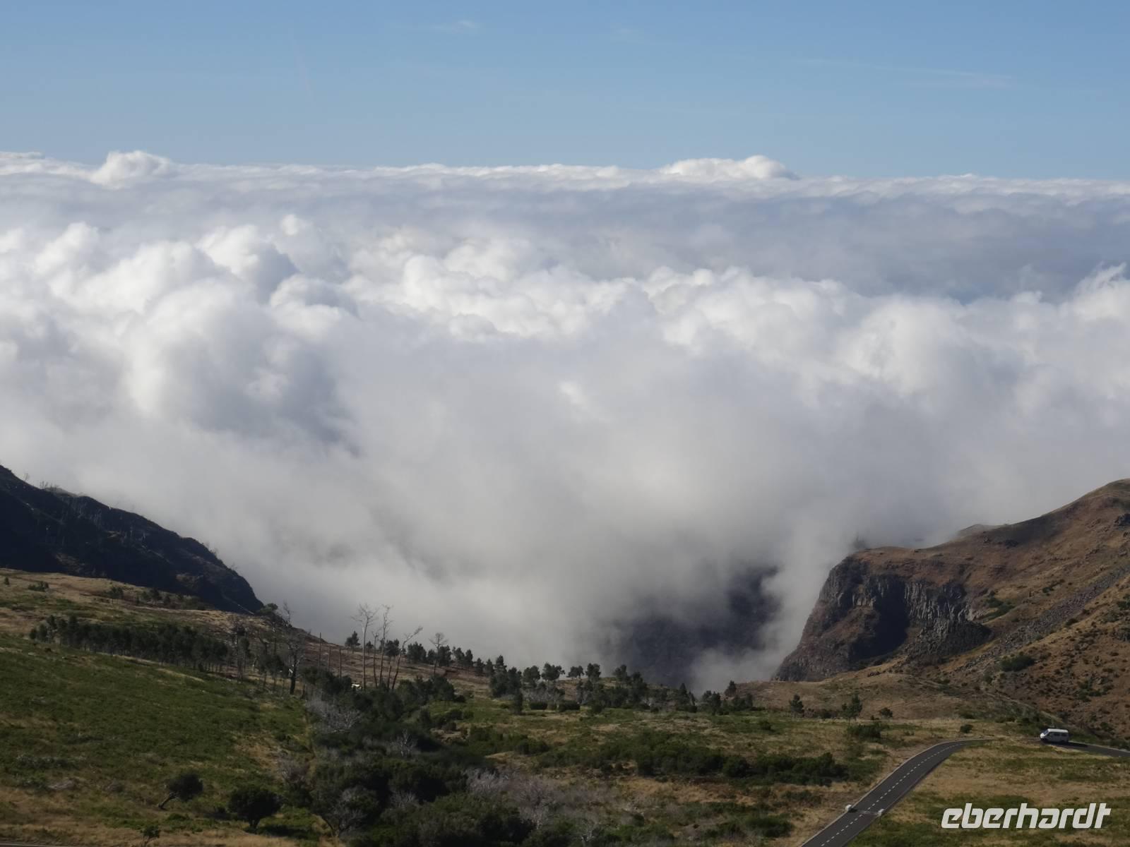 Entlang der süd-westlichen Küste vorbei an Porta do Sol, einen Wasserfall auf der alten Küstenstraße durchfahrend, ging es zur Hochebene "Paul da Serra" in 1500 Meter Höhe. Unzählige Waldstücke entdeckten wir auf der Fahrt hinauf. Hier wurde uns deutlich, warum man diese Insel "Madeira" nannte - schließlich heißt Madeira aus dem portugiesischen übersetzt - Holz. Überrascht waren wir auch, dass es fast keine Serpentinen gab. Es ging fast gerade bergauf. Überraschung Nummer Zwei - die Hochebene empfing uns mit Sonnenschein. Meistens ist sie nur im Nebel zu erahnen. Ja so ist das, wenn Engel reisen...