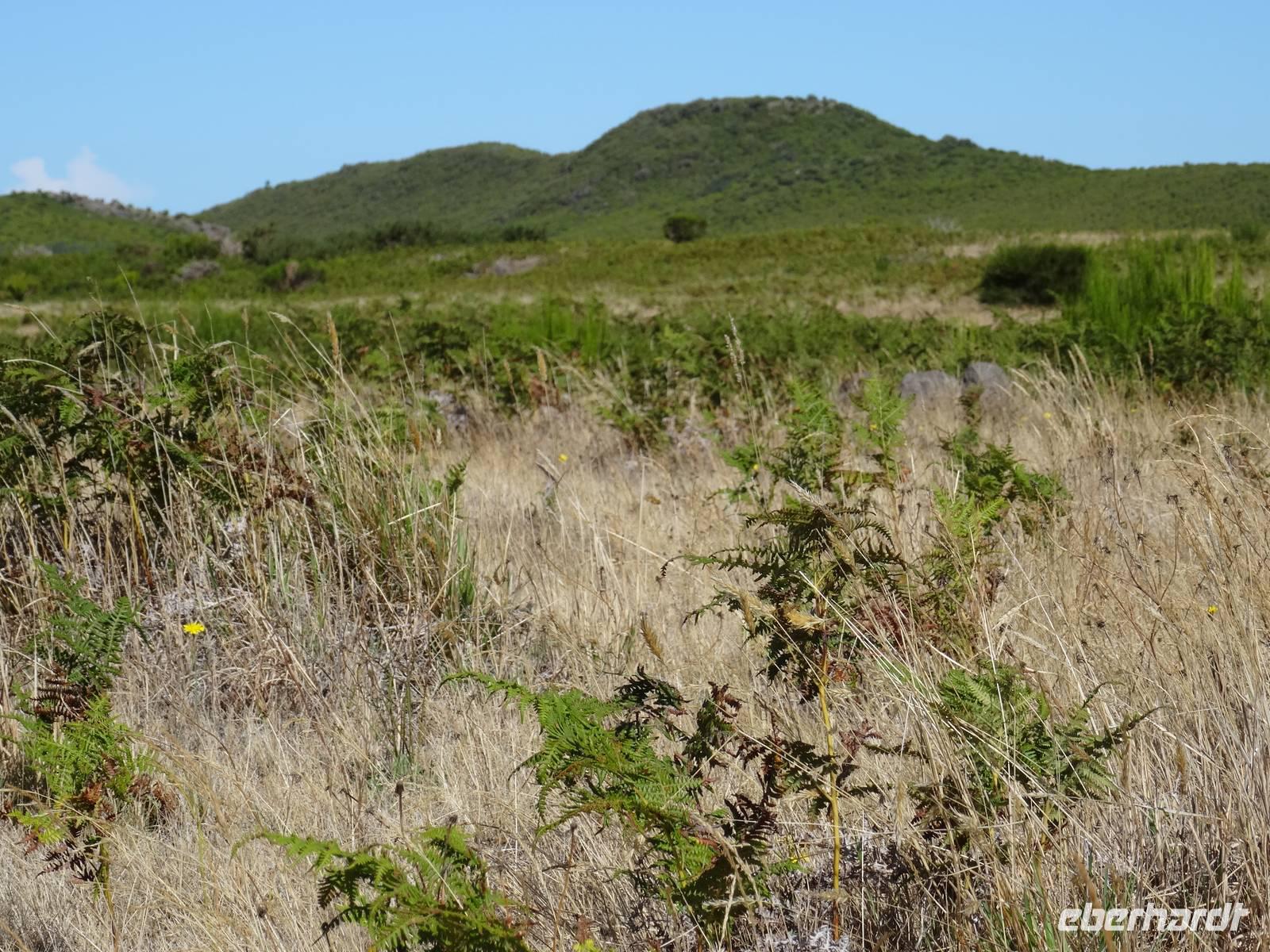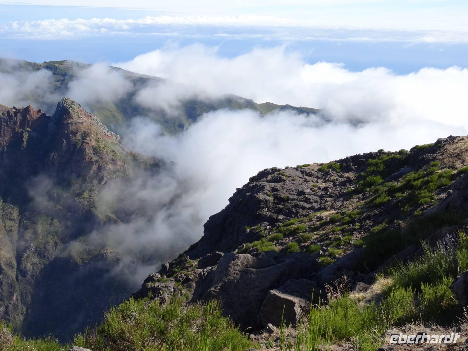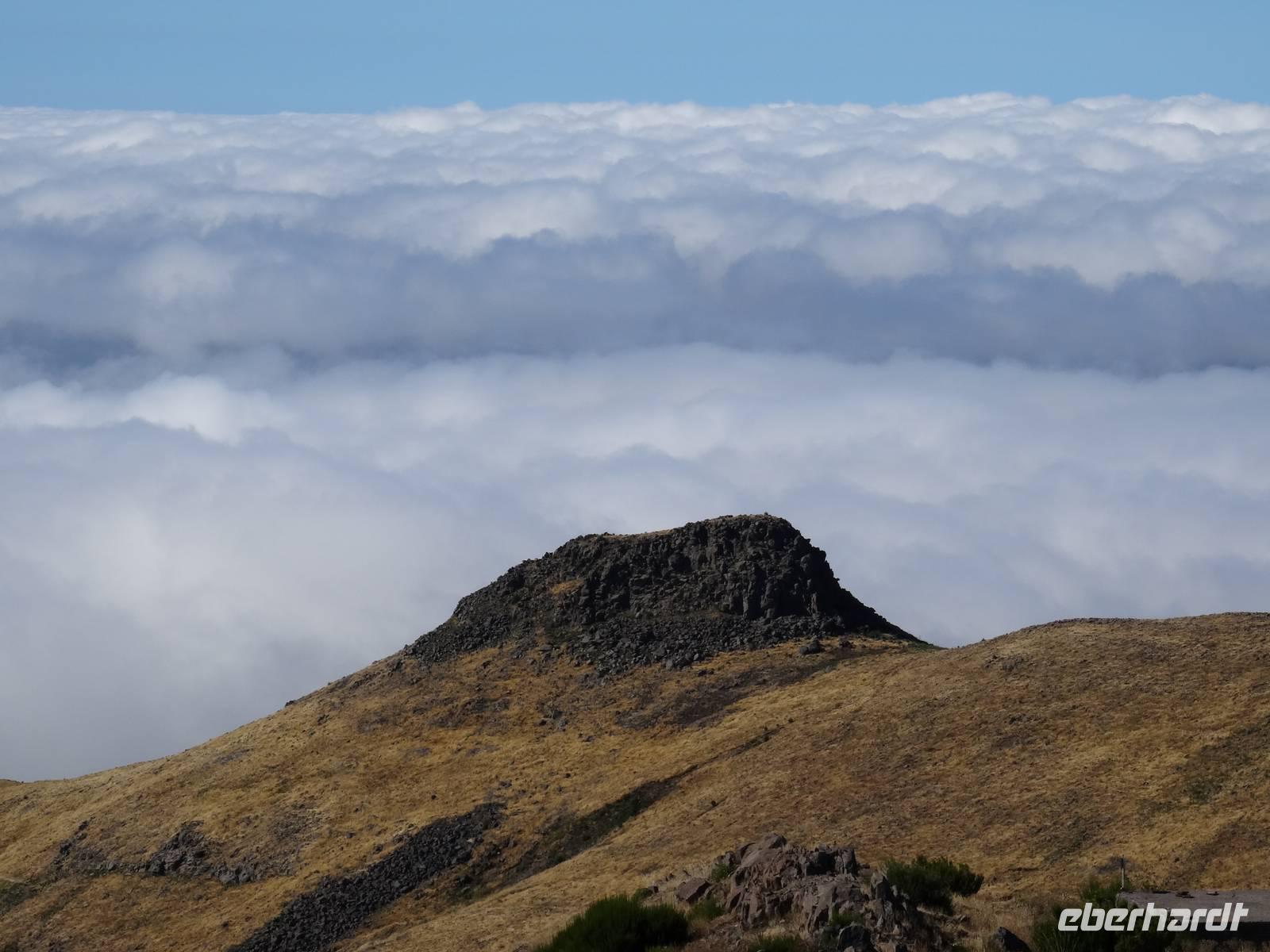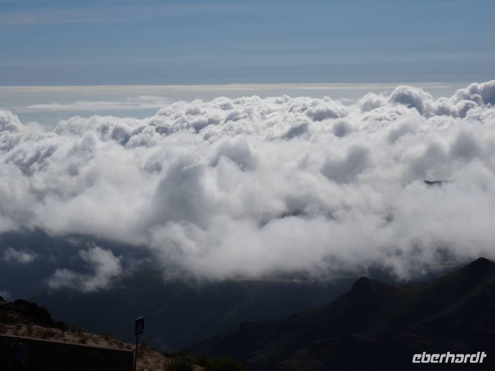 Entlang der süd-westlichen Küste vorbei an Porta do Sol, einen Wasserfall auf der alten Küstenstraße durchfahrend, ging es zur Hochebene "Paul da Serra" in 1500 Meter Höhe. Unzählige Waldstücke entdeckten wir auf der Fahrt hinauf. Hier wurde uns deutlich, warum man diese Insel "Madeira" nannte - schließlich heißt Madeira aus dem portugiesischen übersetzt - Holz. Überrascht waren wir auch, dass es fast keine Serpentinen gab. Es ging fast gerade bergauf. Überraschung Nummer Zwei - die Hochebene empfing uns mit Sonnenschein. Meistens ist sie nur im Nebel zu erahnen. Ja so ist das, wenn Engel reisen...