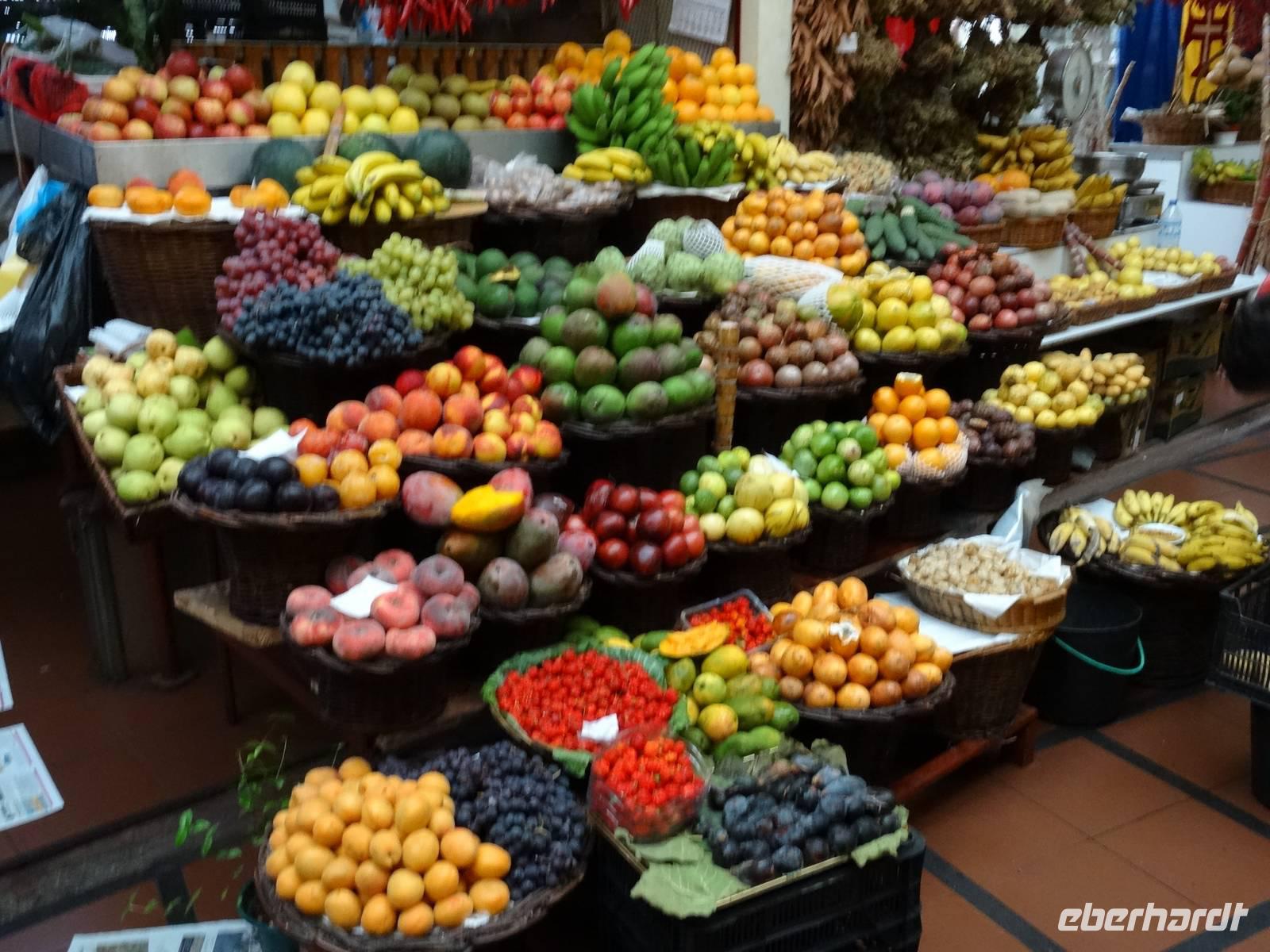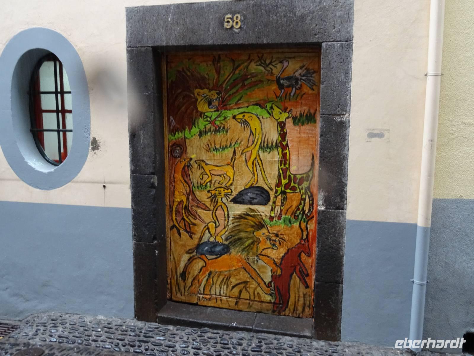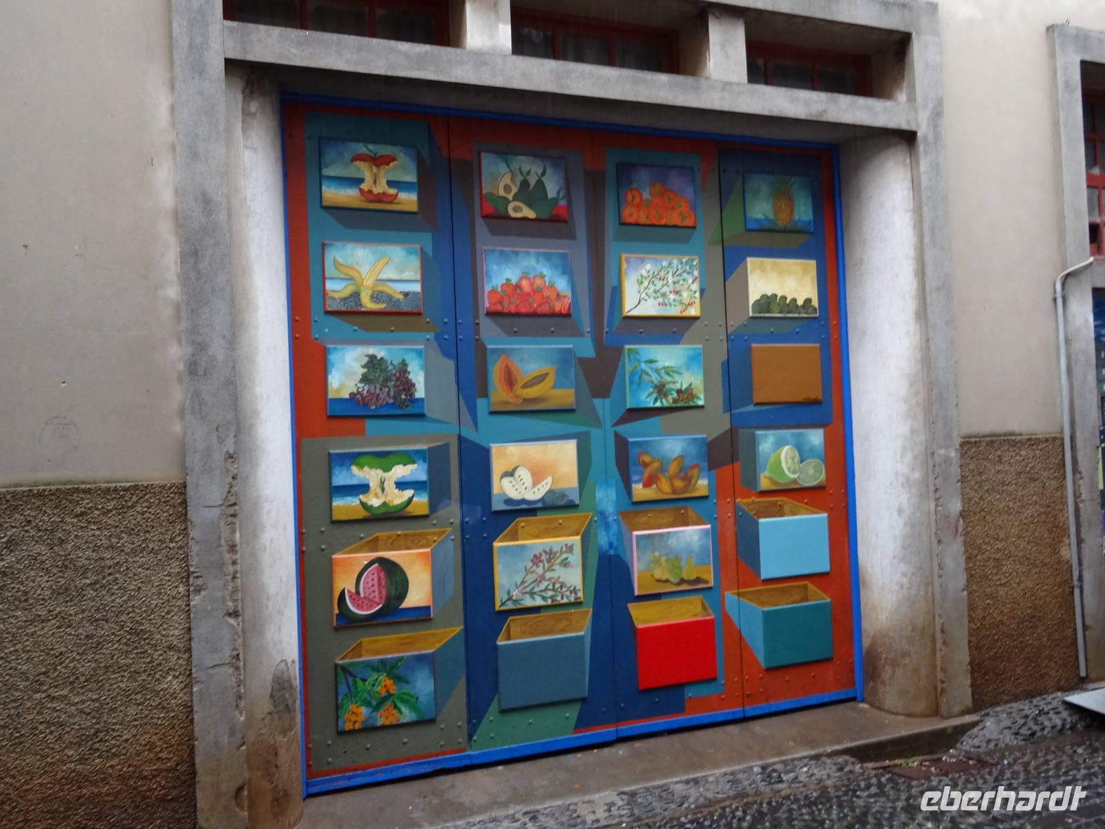 Auch bei unserem ersten Stopp in Funchal regnete es noch heftig und so mußten wir unseren kleinen Rundgang darauf beschränken, daß wir durch die älteste Straße in Funchal -die Rua da Santa Maria- mit ihren originellen Türen schnell in die große Markthalle zur Besichtigung flüchteten. Hier sahen wir dann den bekannten schwarzen Degenfisch in Natur, welcher nur Nachts gefangen und hier von den Fischern an "nur männliche Käufer" angeboten wird. Wir kosteten von den vielen Früchten Madeiras wie Papaya, Maracuja, süßen Bananen oder Anoa.