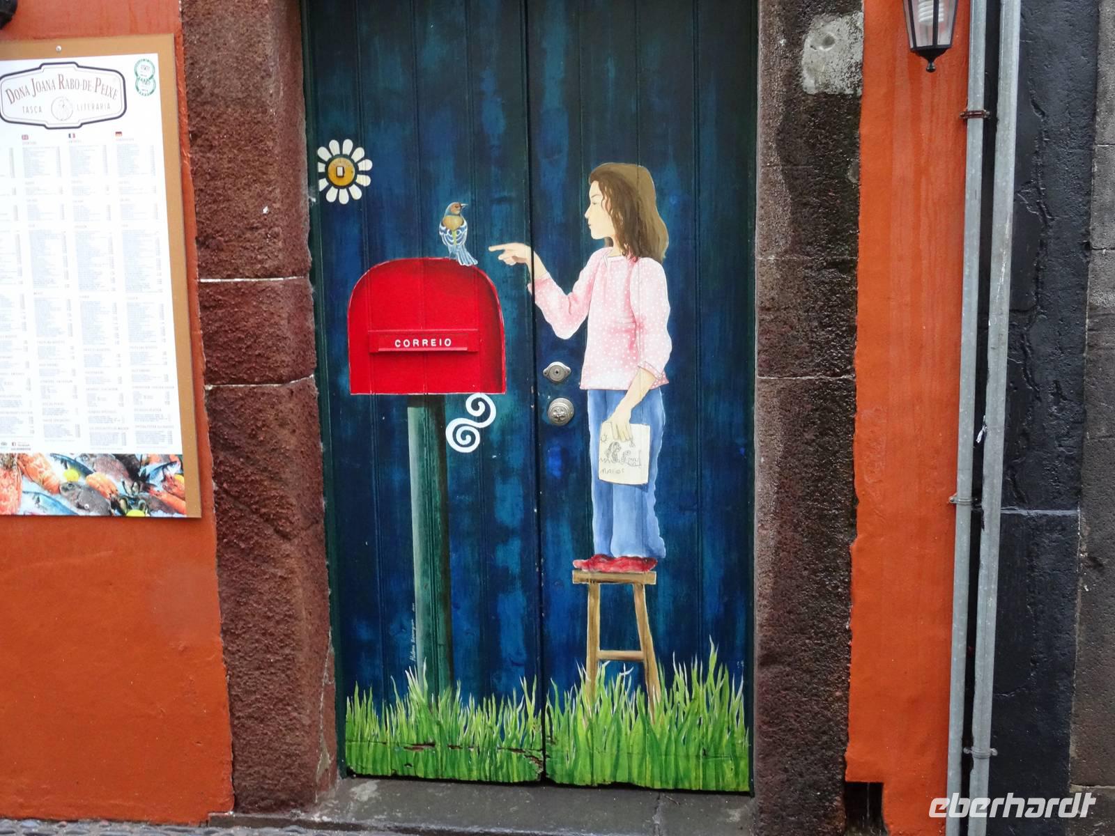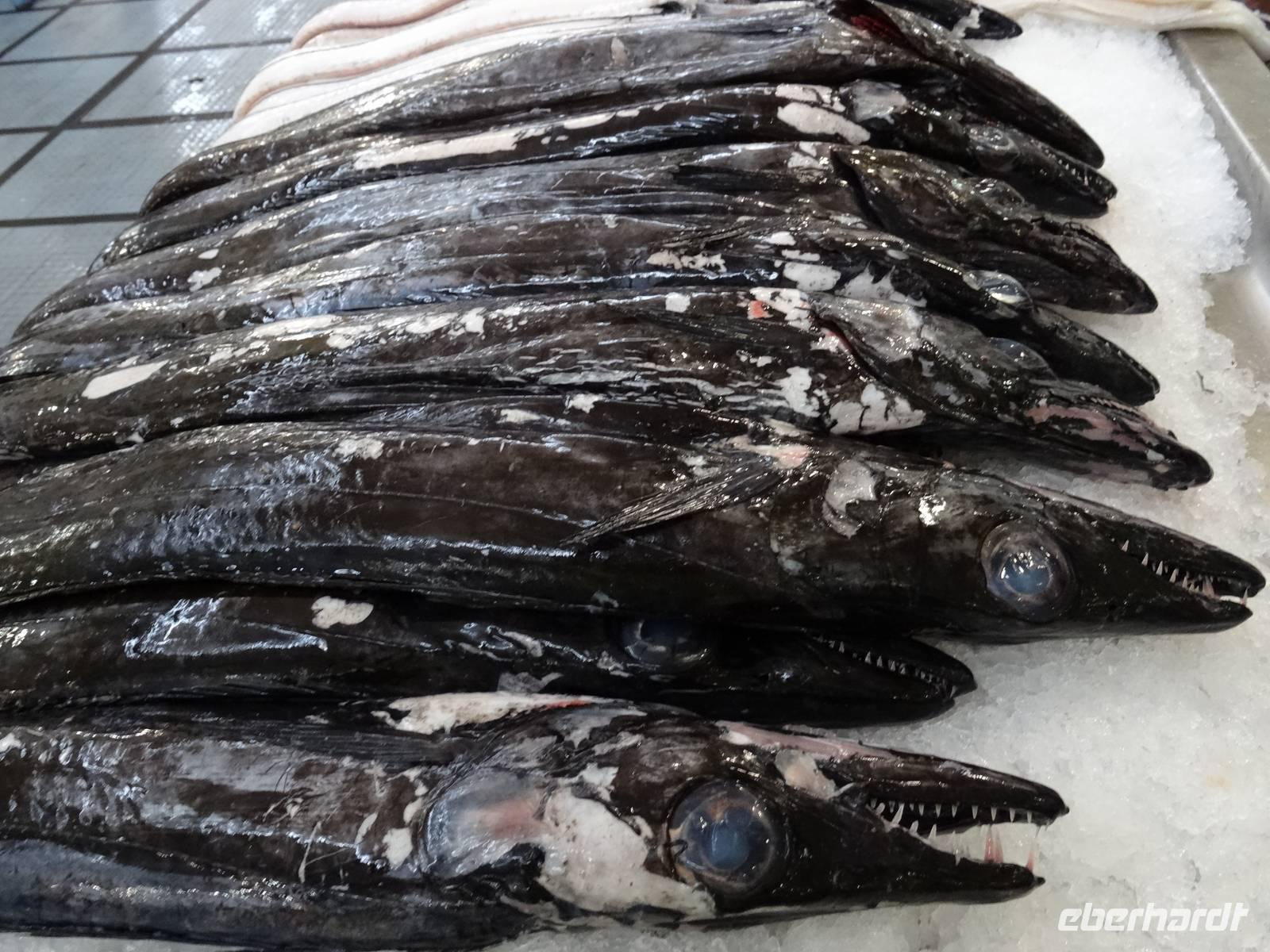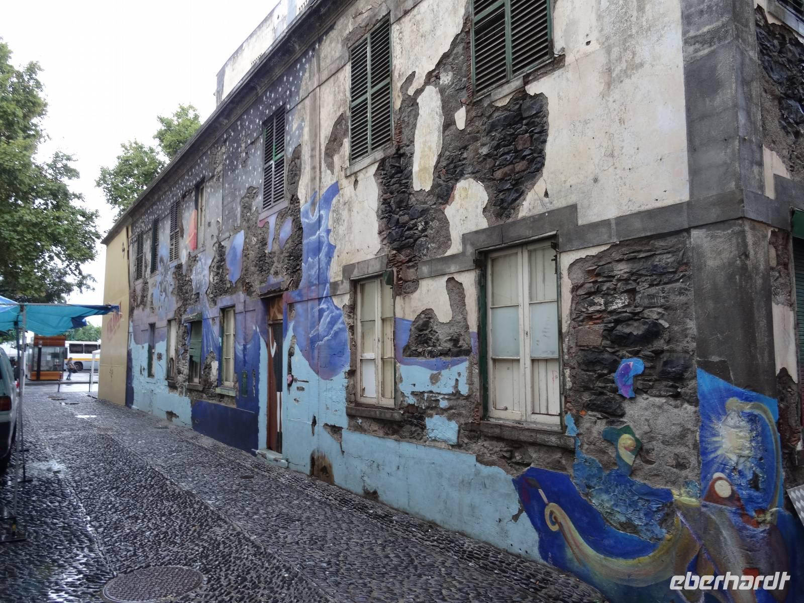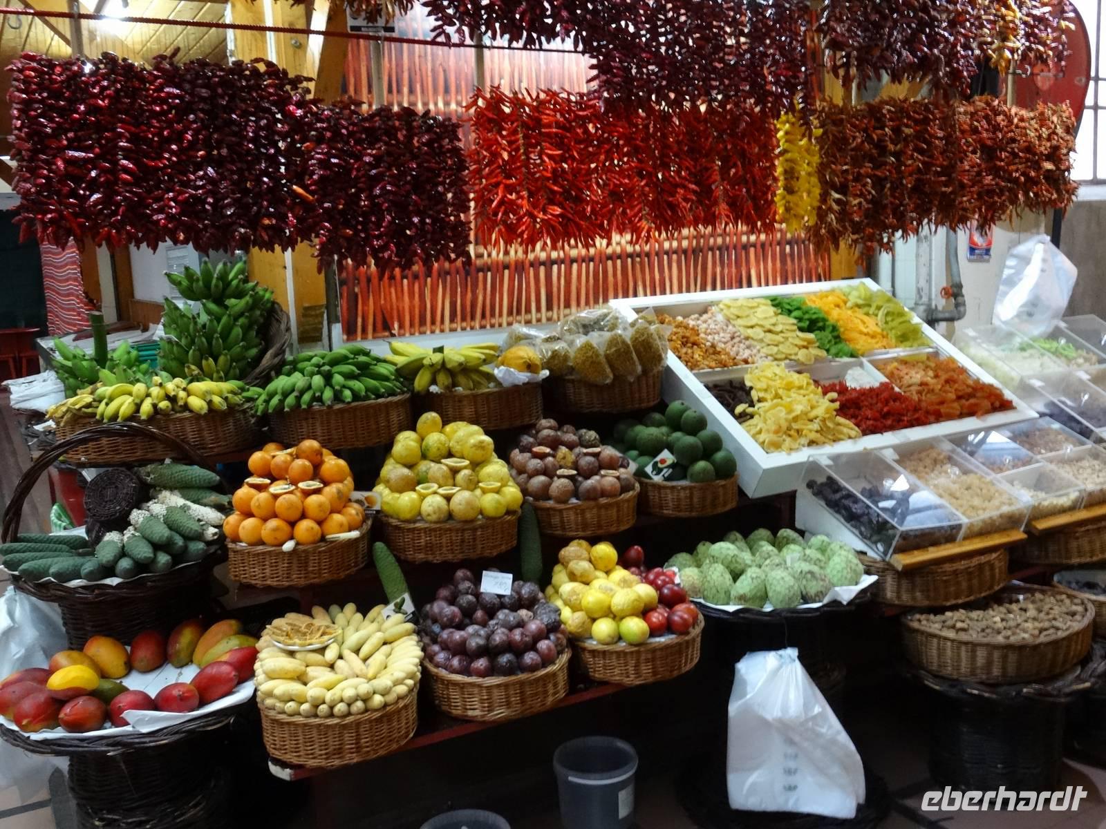 Auch bei unserem ersten Stopp in Funchal regnete es noch heftig und so mußten wir unseren kleinen Rundgang darauf beschränken, daß wir durch die älteste Straße in Funchal -die Rua da Santa Maria- mit ihren originellen Türen schnell in die große Markthalle zur Besichtigung flüchteten. Hier sahen wir dann den bekannten schwarzen Degenfisch in Natur, welcher nur Nachts gefangen und hier von den Fischern an "nur männliche Käufer" angeboten wird. Wir kosteten von den vielen Früchten Madeiras wie Papaya, Maracuja, süßen Bananen oder Anoa.