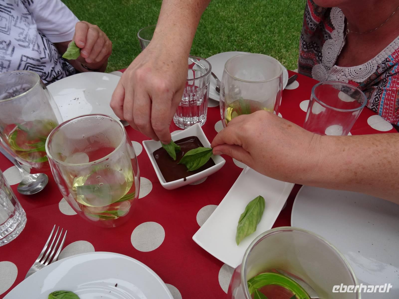 Danach erreichten wir den kleinen Kräutergarten von Maria. Wir probierten verschiedene, selbst hergestellte Schokoladen in Verbindung mit Whisky und Martini und Schokoladen-Fondue. Das war mehr als eine süße Verführung, der wir einfach nicht widerstehen konnten und wollten.