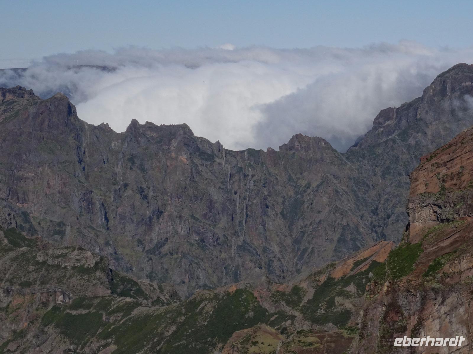Erster Stopp war Camacha zur Besichtigung einer Korbflechtwerkstatt. Wir bewunderten die flinken Hände der Arbeiter und bestaunten, was man alles aus Korb flechten kann. Bei herrlichem Sonnenschein fuhren wir weiter zum Gipfel des dritthöchsten Berges Madeiras - dem Pico de Areiro auf 1818 Meter Höhe. Von hier bot sich uns eine phantastische erste Aussicht auf das Nonnental und die Bergregion. Weiter ging es in das Naturschutzgebiet Ribeiro Frio(kalter Bach). Die Sonne war zwar verschwunden, doch der angekündigte Regen blieb aus. Also ideal mit einer Mini-Levada-Wanderung zum Aussichtspunkt "Balcoes" eine Trainingseinheit als Generalprobe fur unsere Levada-Wanderung am Dienstag zu absolvieren.