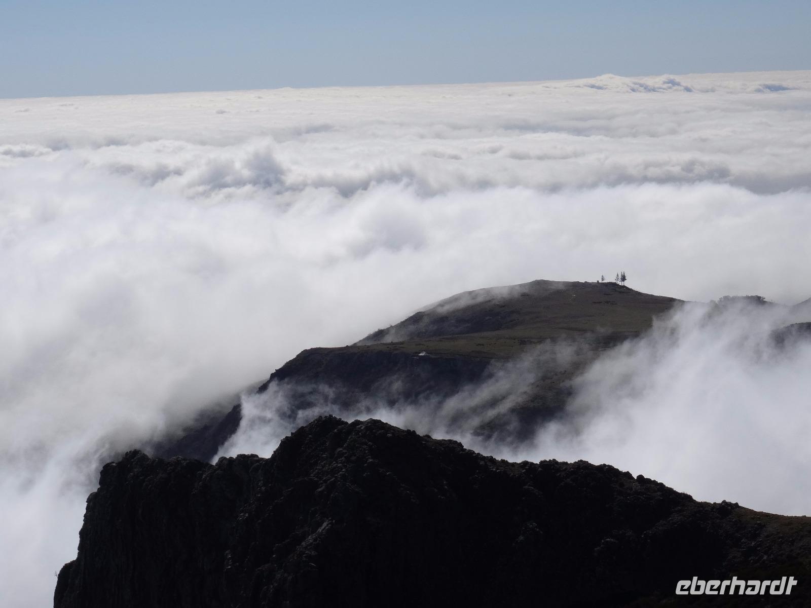Entlang der süd-westlichen Küste vorbei an Ponta do Sol, einen "Wasserfall" auf der alten Küstenstraße durchfahrend, ging es dann hinauf zur Hochebene "Paul da Serra" auf 1400 Meter. Unzählige Waldstücke entdeckten wir auf der Fahrt hinauf. Hier wurde uns deutlich, warum man diese Insel "Madeira" nannte - denn schließlich heißt Madeira aus dem portugiesischen übersetzt = Holz. Überraschend gab es keine Serpentinen, sondern es ging fast gerade bergauf, so dass wir in kurzer Zeit die Höhe erreichten. Leider zeigte sich die Hochebene - für sie charakteristisch - im Nebel und war deshalb nur zu erahnen.