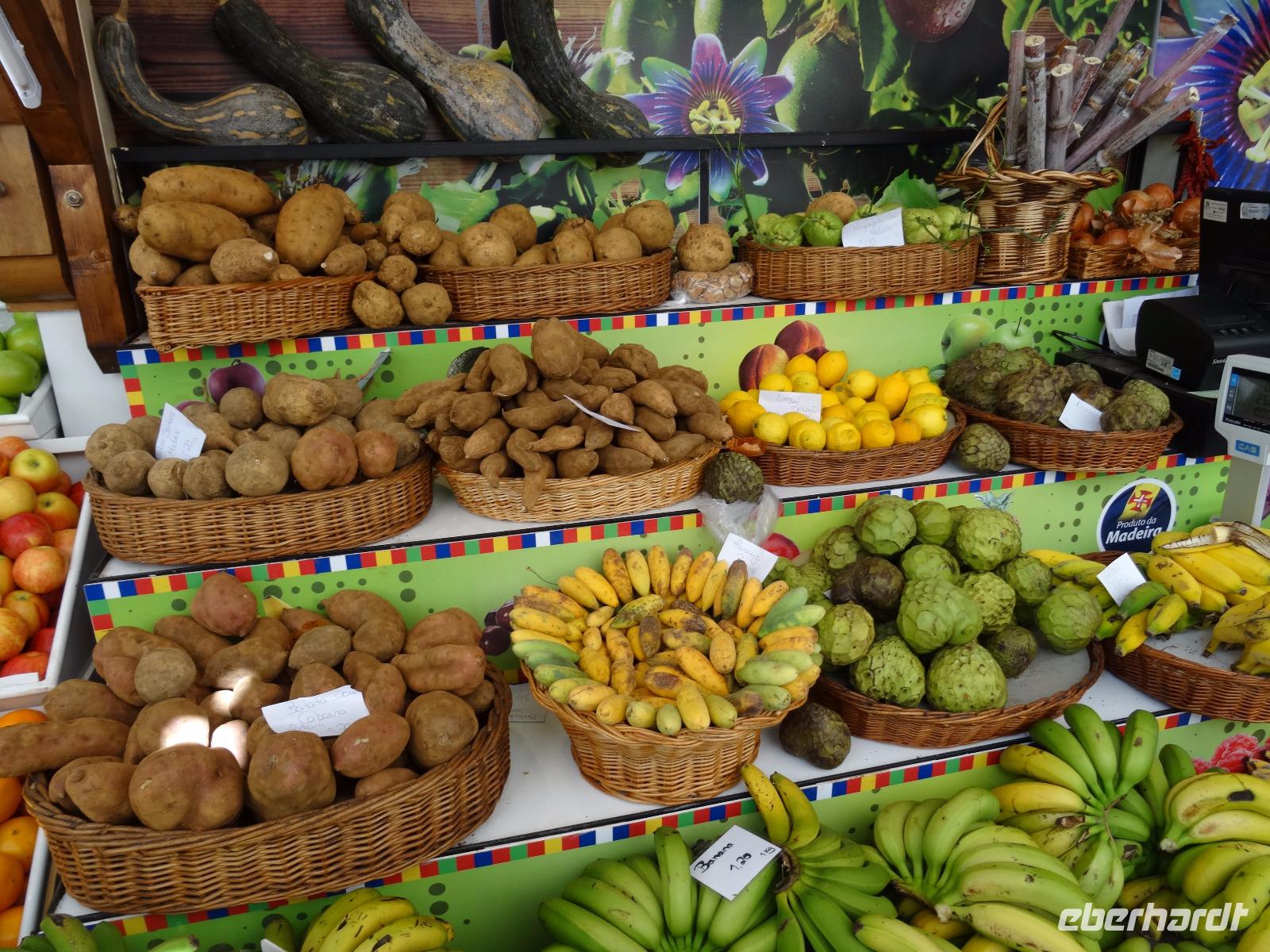 Danach fuhren wir in das Zentrum von Funchal und schon standen wir vor der großen Markthalle. Jetzt sahen wir endlich den bekannten schwarzen Degenfisch -Espada- in Natur, welcher nur Nachts gefangen und hier von den Fischern "nur männlichen Käufern" angeboten wird. Wir kosteten von den vielen Früchten Madeiras wie Papaya, Maracuja, süßen Bananen oder Anona.
