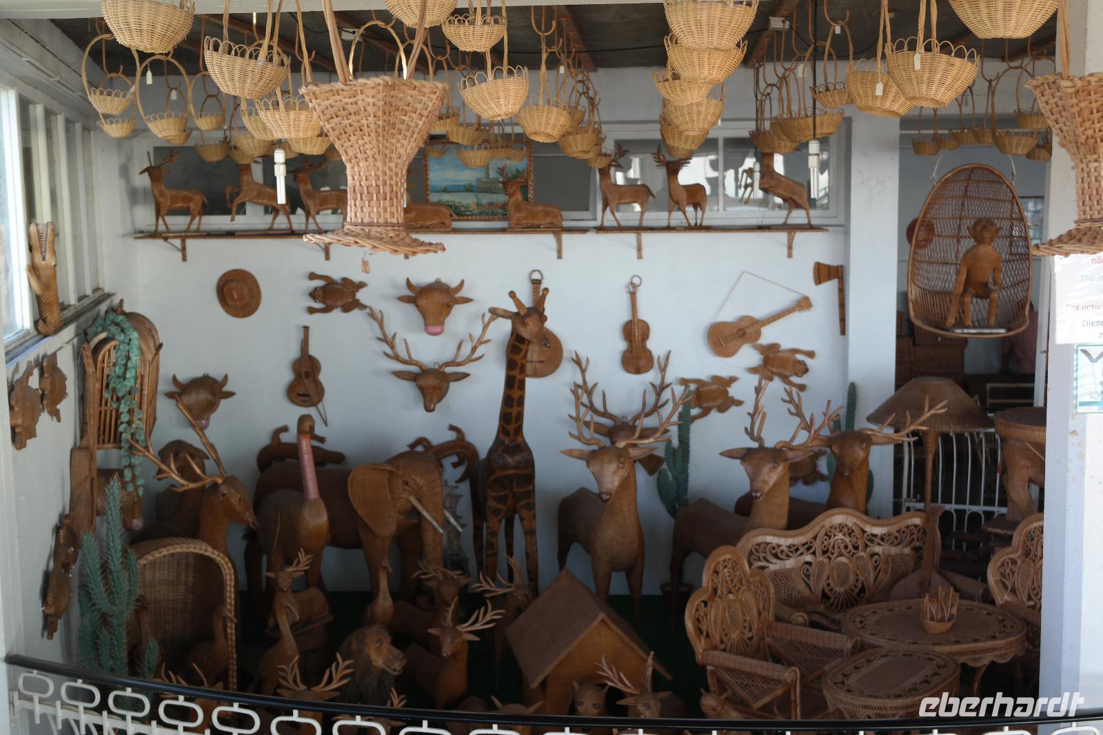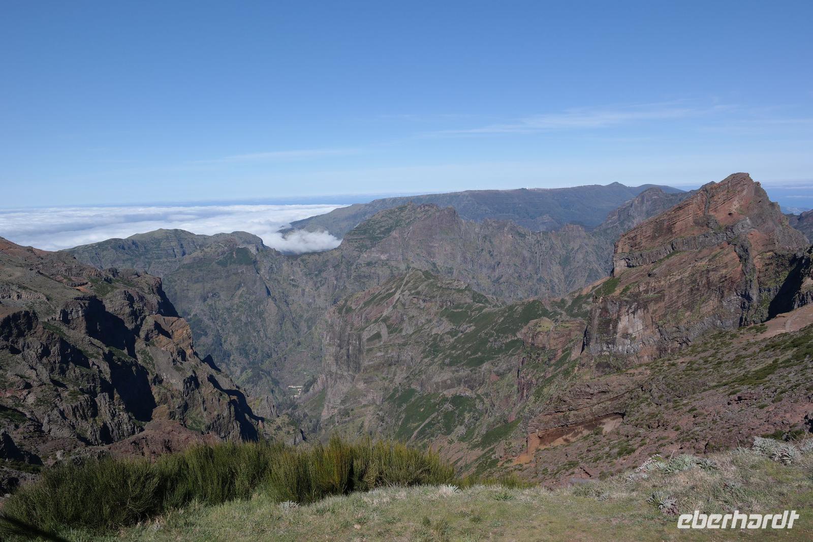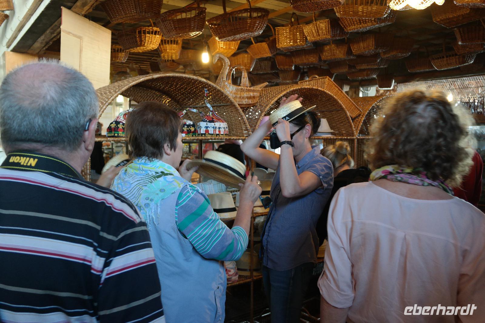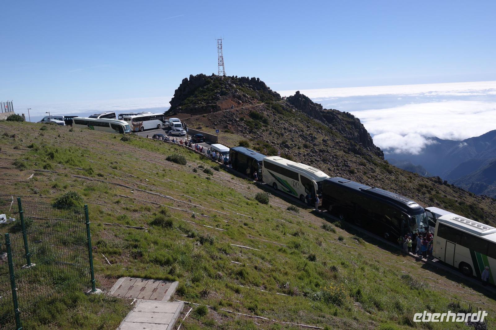 Heute hat „gefühlt" die ganze Insel den gleichen Ausflug gebucht: In der Korbflechter-Stadt Camacha finden wir keinen Parkplatz direkt vor der Korbmanufaktur. Dafür begleiten uns zahlreiche Busse vor-bei an Gingster, Mimosenfarnen und Lorbeerbäumen - unterwegs sehen wir auch Heidelbeer"bäume" (kein Witz - die Heidelbeeren werden im Stehen oder mit Leiter gepflückt) - hinauf zum Pico do Arieiro (1.862m). Wir haben einen wunderbaren Blick über die Insel und zu tun, den eigenen Bus wieder zu finden. Am „kalten Bach" (Ribeiro Frio) unternehmen wir einen kleinen Spaziergang durch den „Urwald" von Madeira. In Santana treffen wir die gleichen Gruppen wieder, die wir zuvor schon getroffen hatten. Madeira hat nur ca. ¼ Million Einwohner, aber bis zu 1,5 Millionen Touristen pro Jahr.