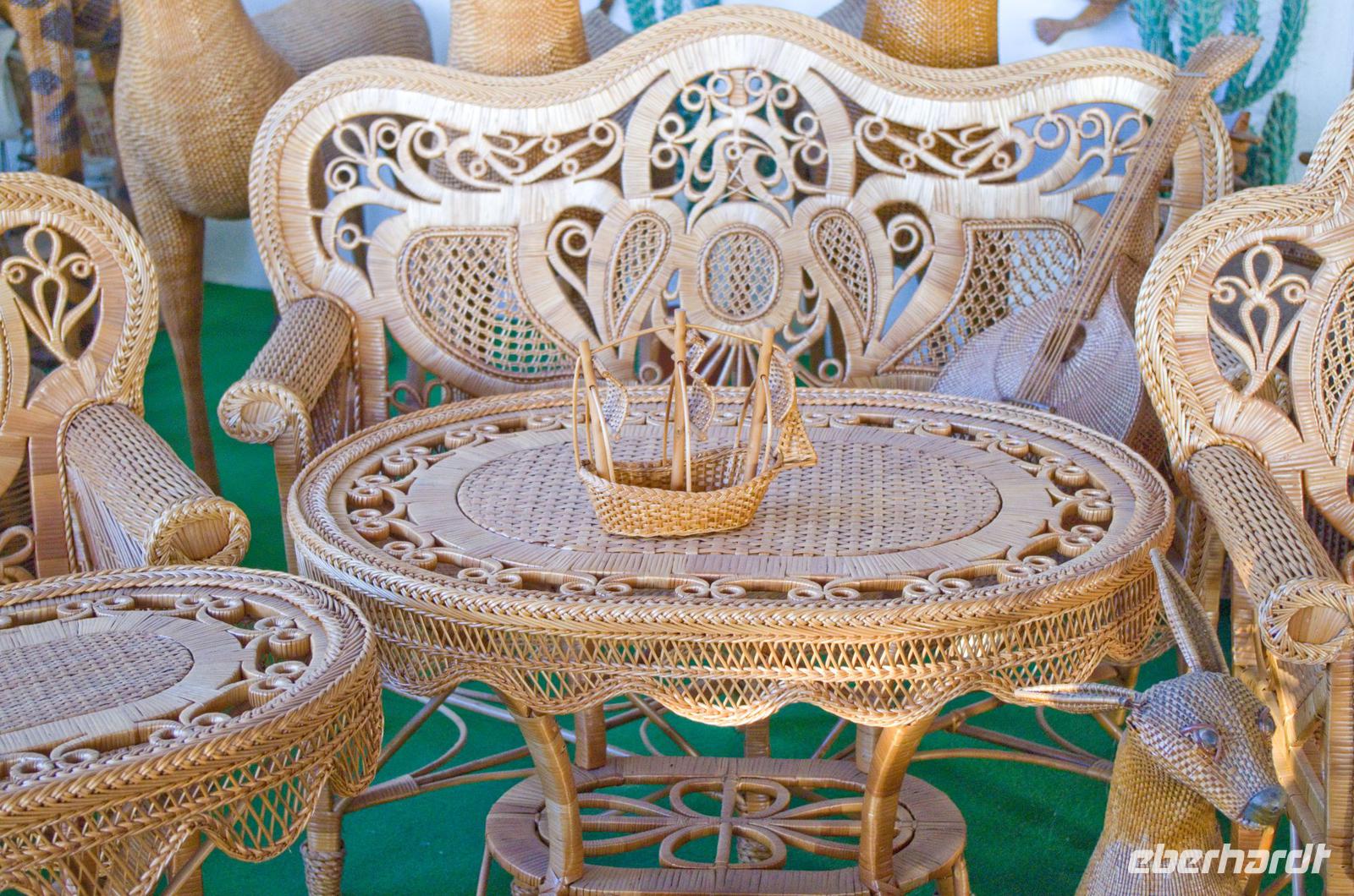 Zunächst führt unsere Fahrt nach Camacha und wir erleben dort die lebendige Tradition der Korbflechterei, die hier vor allem durch Männer ausgeführt wird. In den Werkstätten schauen wir den Korbflechtern bei ihrer Arbeit zu und bewundern ihr handwerkliches Geschick: Elefanten, Strauße, Frösche - ja sogar ganze Segelboote stellen sie neben Gebrauchsgegenständen wie Stühlen, Regale und Körbe her.