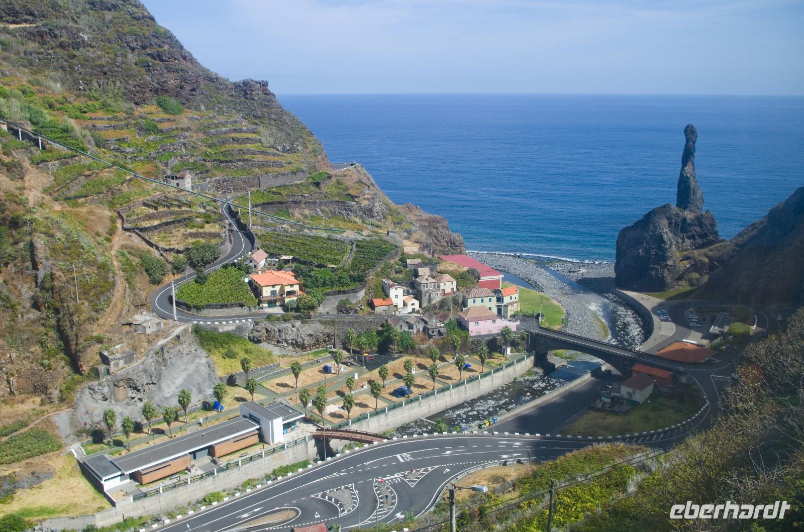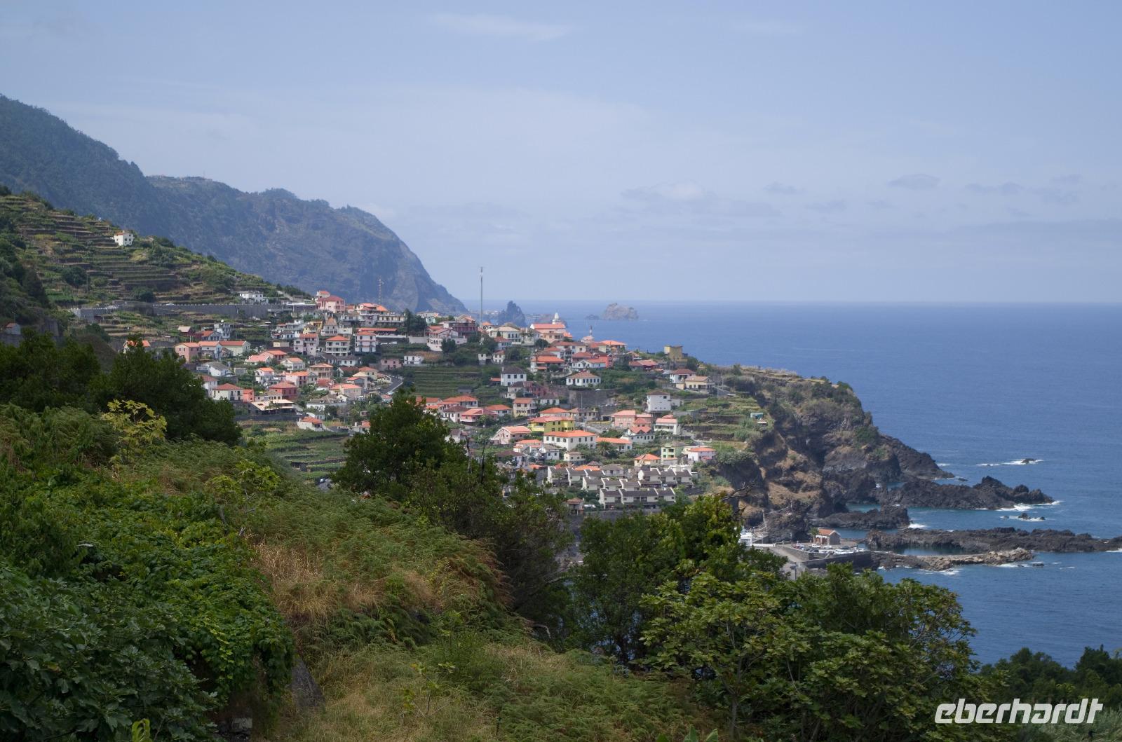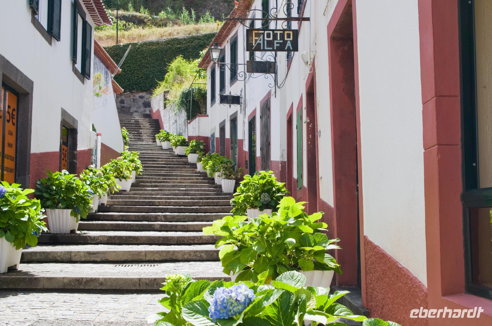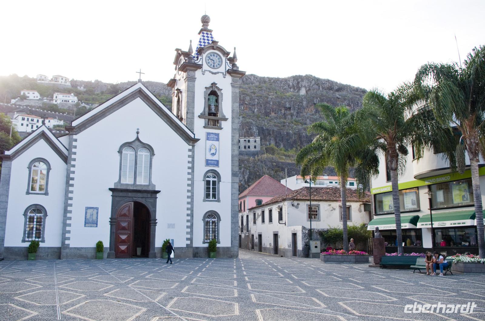 Von Seixal aus fahren wir weiter in Richtung Sao Vicente. Nun zieht sich die Steilküste ein Stück weit vom Meer zurück und öffnet sich zu einem breiten Tal, durch das der Rio do Sao Vicente fließt. Wir biegen in das Tal ein und nach ein paar hundert Metern erreichen wir den idyllischen Ort Sao Vicente. Helena führt uns zur schönen Kirche Igreja do Sao Vicente, deren Besuch sich allein wegen der vergoldeten Holzschnitzereien und Azulejos im Kirchenraum lohnt. Die den Kirchplatz umgebenen Häuser wirken fast wie von einer Postkarte entnommen - sauber und weiß gestrichen erstrahlen sie im Sonnenlicht und sind mit Blumen und Verzierungen geschmückt. Wir verabschieden uns von der Nordküste bei einem Bummel durch das pittoreske Örtchen Sao Vicente.