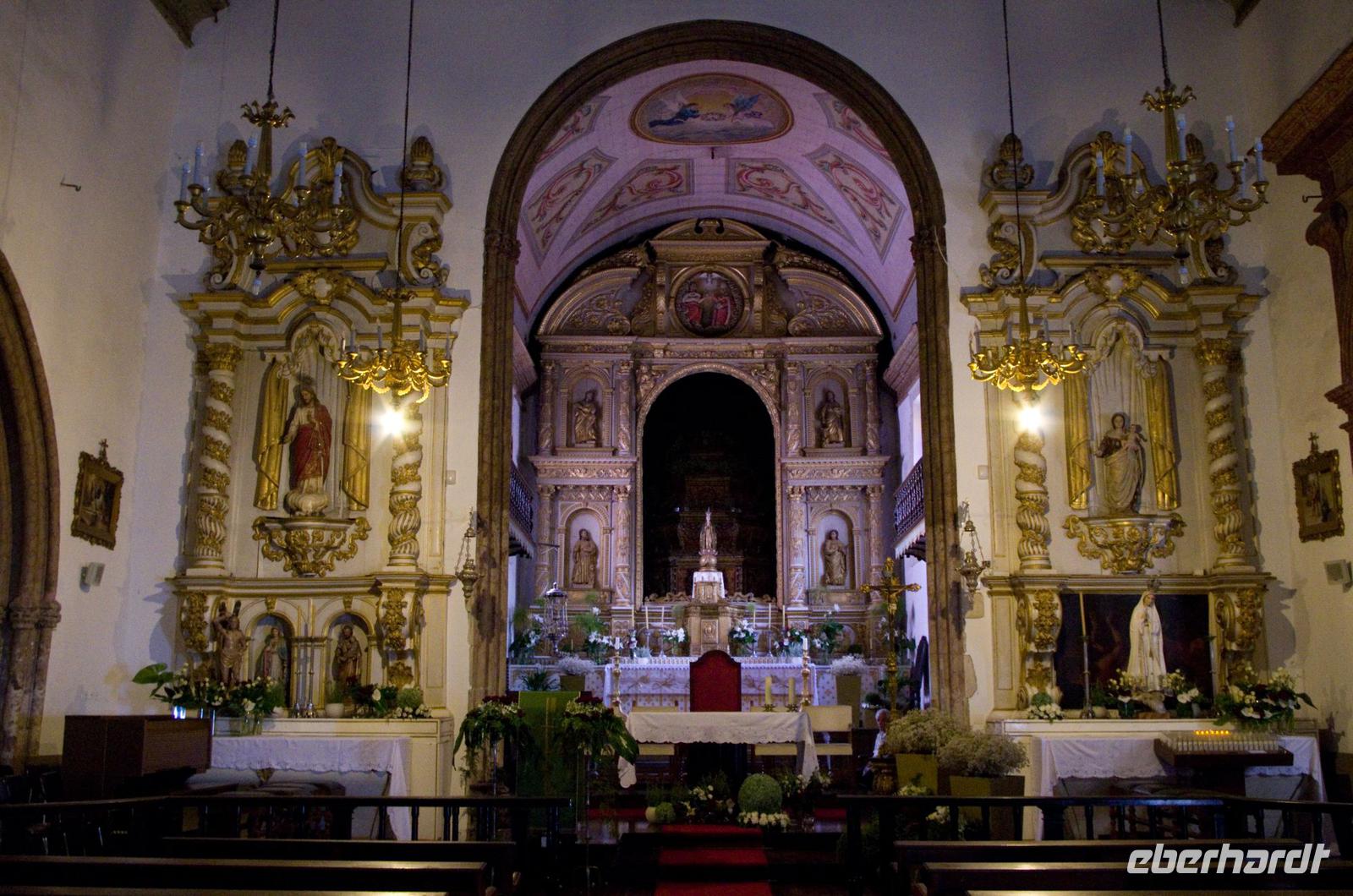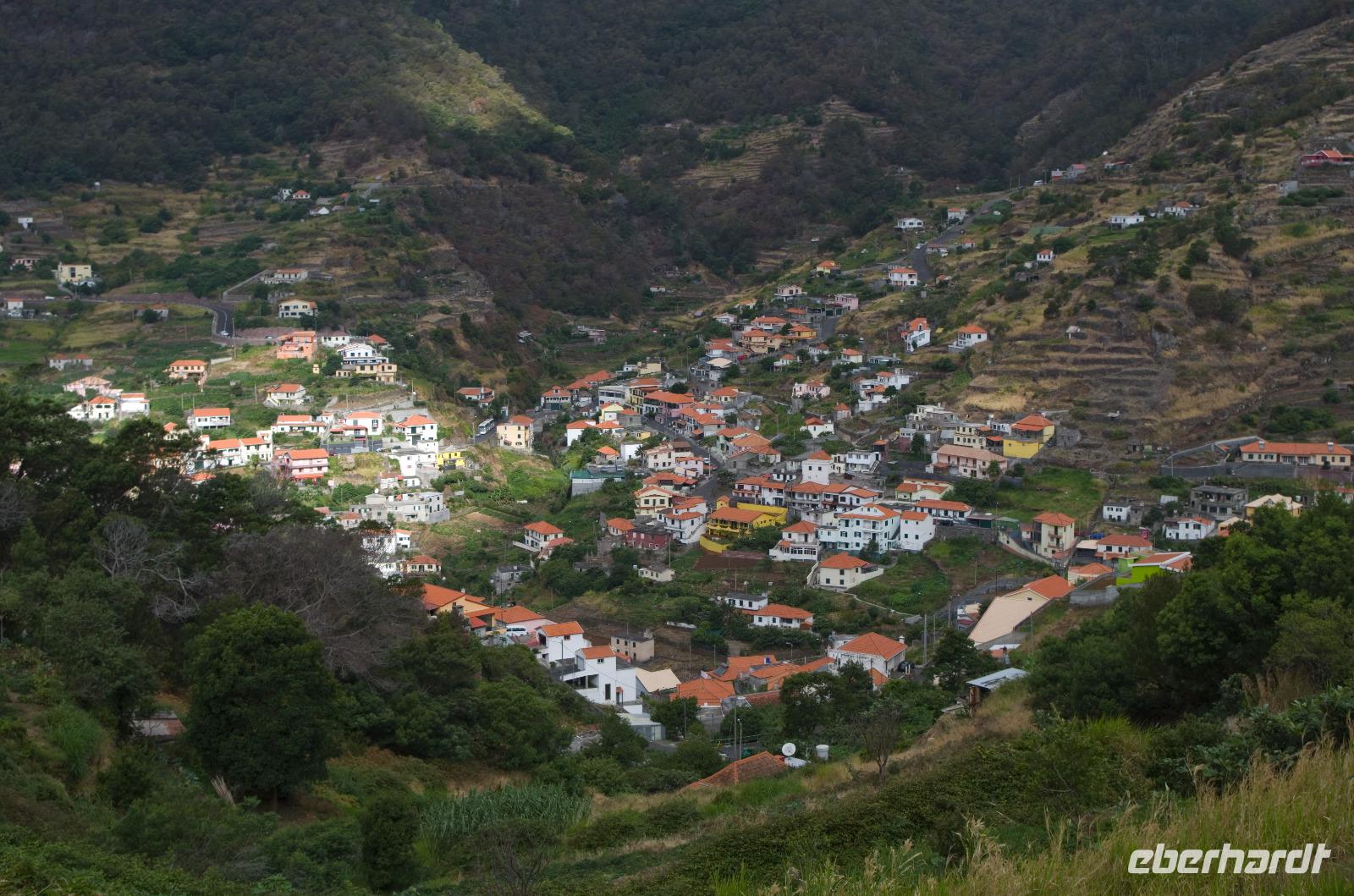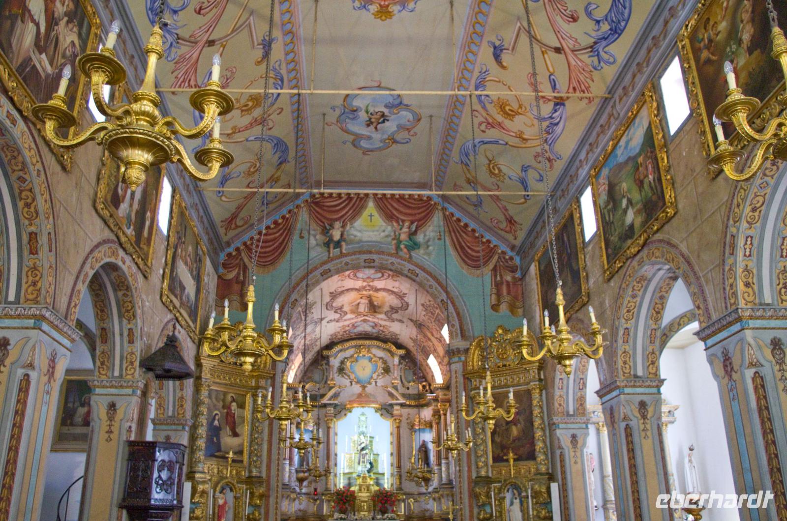 Von Seixal aus fahren wir weiter in Richtung Sao Vicente. Nun zieht sich die Steilküste ein Stück weit vom Meer zurück und öffnet sich zu einem breiten Tal, durch das der Rio do Sao Vicente fließt. Wir biegen in das Tal ein und nach ein paar hundert Metern erreichen wir den idyllischen Ort Sao Vicente. Helena führt uns zur schönen Kirche Igreja do Sao Vicente, deren Besuch sich allein wegen der vergoldeten Holzschnitzereien und Azulejos im Kirchenraum lohnt. Die den Kirchplatz umgebenen Häuser wirken fast wie von einer Postkarte entnommen - sauber und weiß gestrichen erstrahlen sie im Sonnenlicht und sind mit Blumen und Verzierungen geschmückt. Wir verabschieden uns von der Nordküste bei einem Bummel durch das pittoreske Örtchen Sao Vicente.