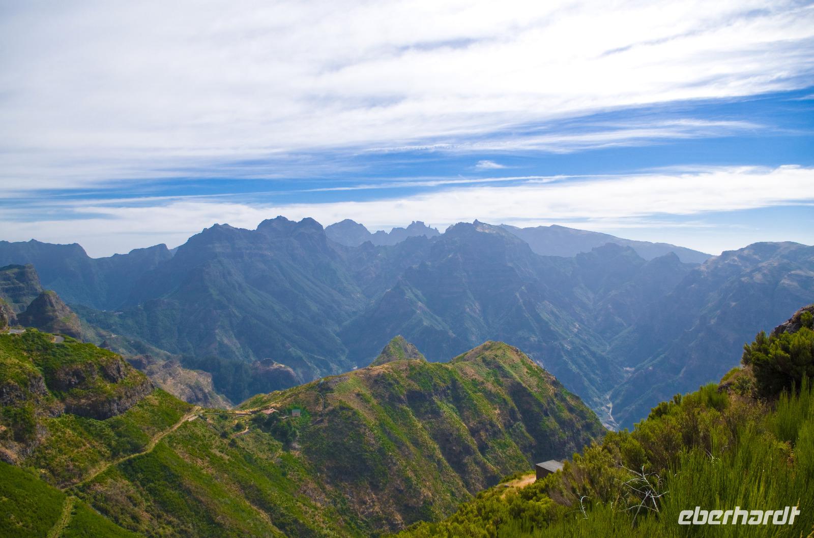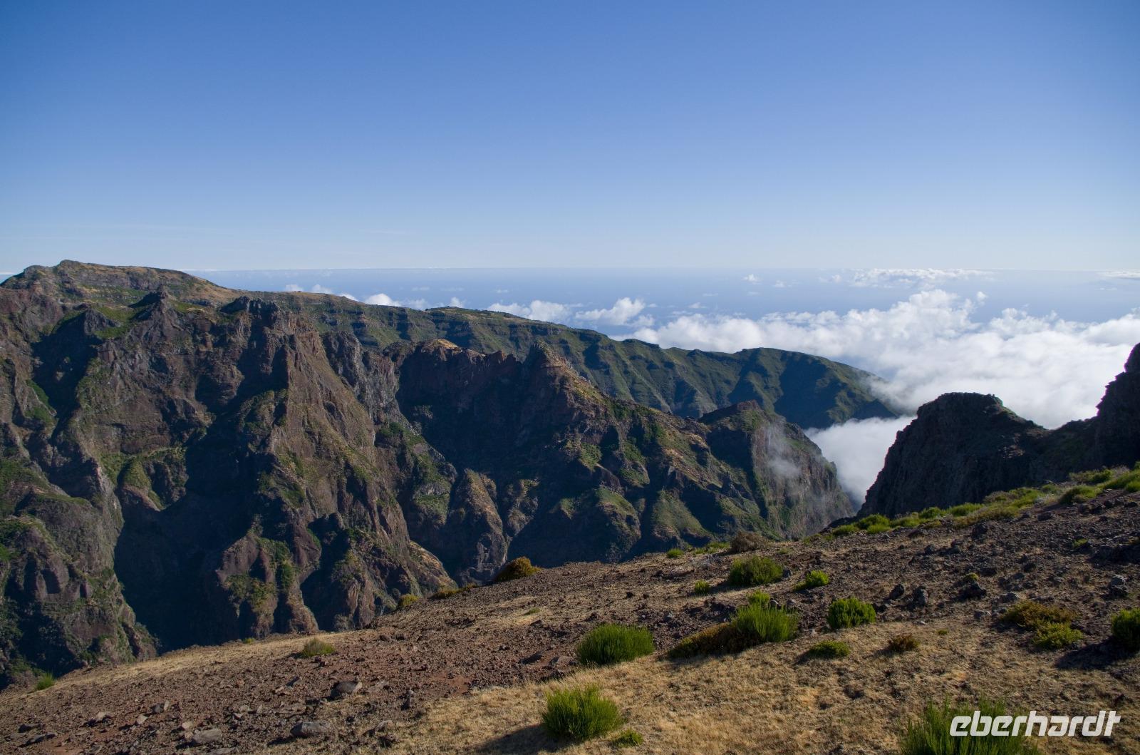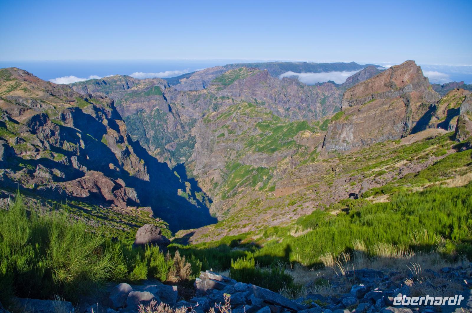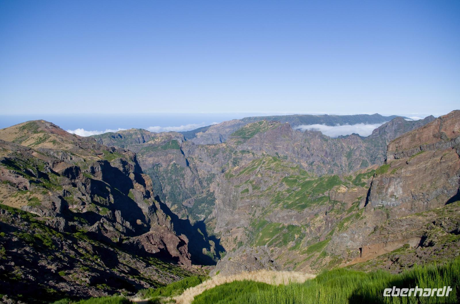 Weiter geht unsere Fahrt durch Wälder und Naturreservate nach Pico de Areiro, dem zweithöchsten Berg Madeiras. Helena steckt uns mit ihrer Begeisterung für das tolle Wetter an, denn wir haben eine ungetrübte Aussicht über die ganze Insel bei strahlendem Sonnenschein. So sehen wir auch schon heute aus der Ferne unsere Ziele der nächsten Tage: die Hochebene Paul de Serra, das Nonnental und die Nordküste Madeiras.