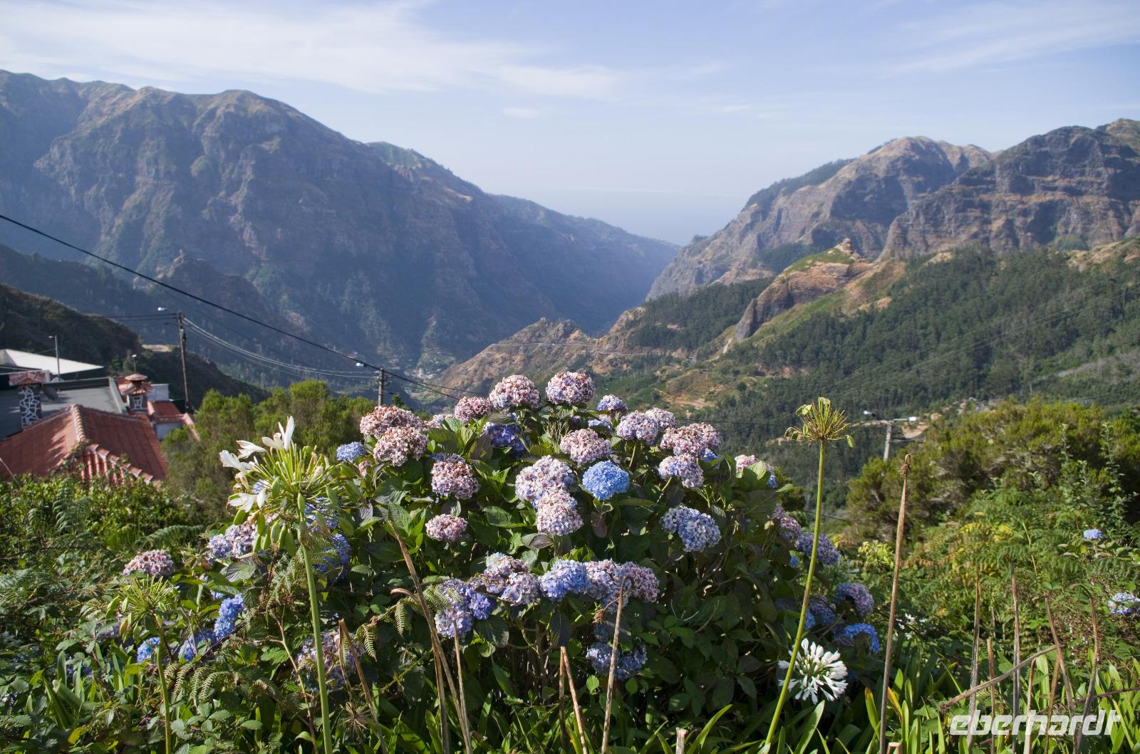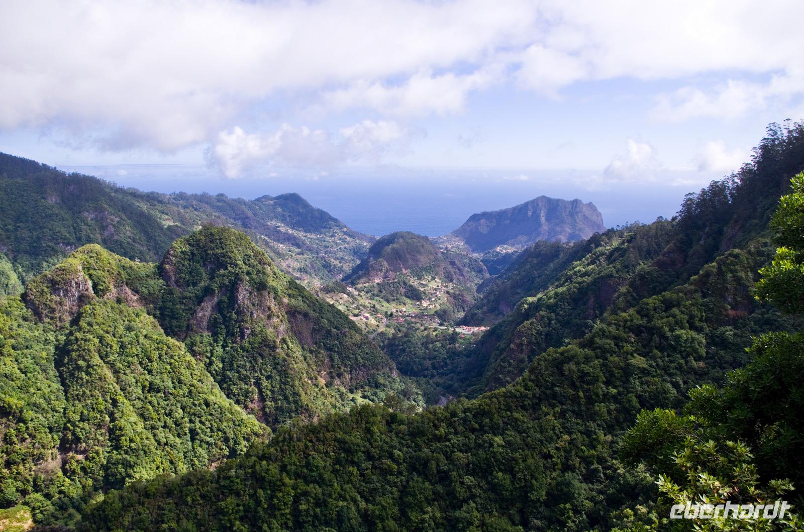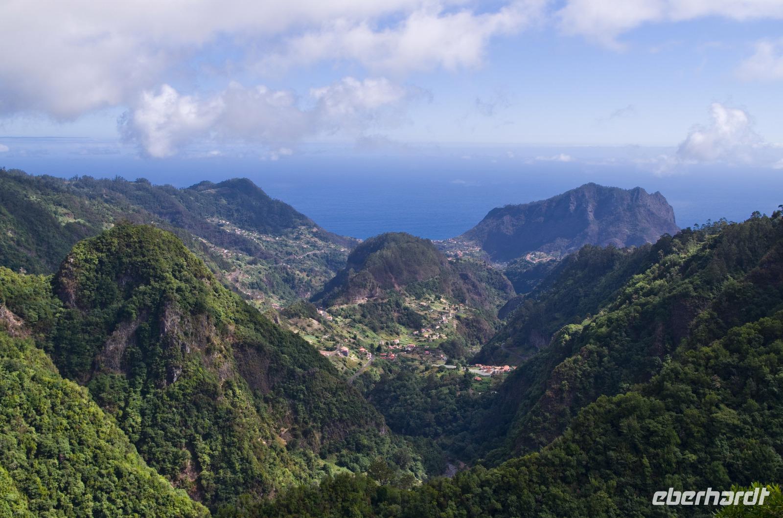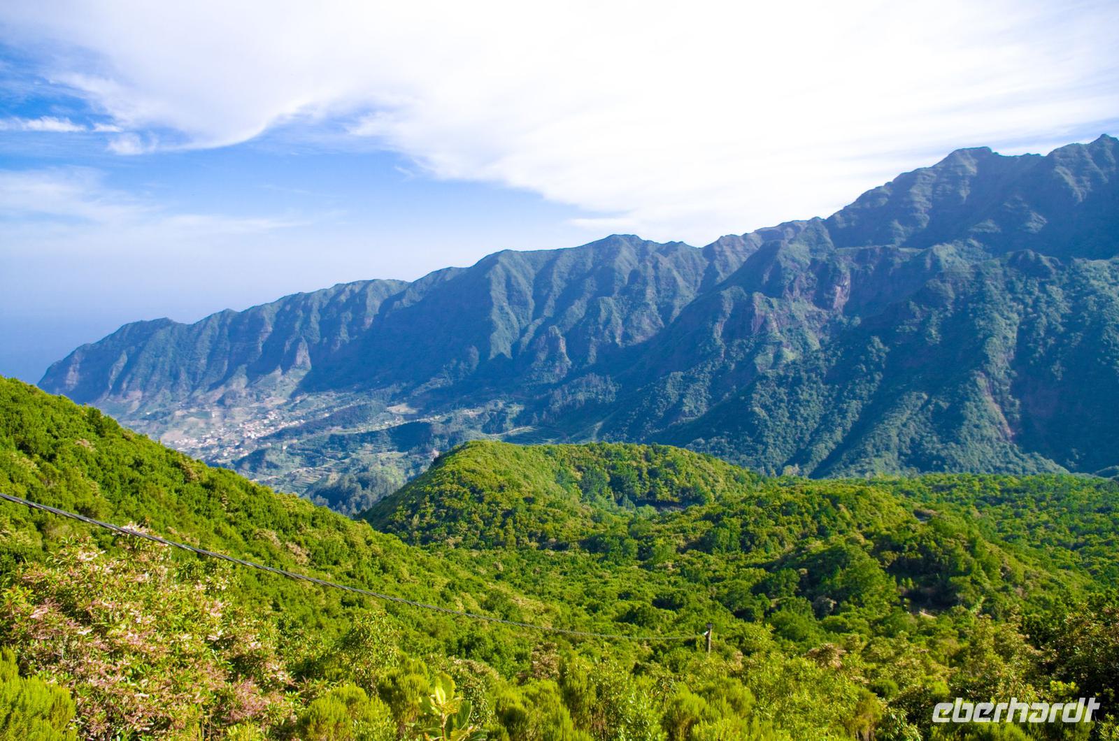 Dem Taleinschnitt der Ribeira Brava, dem die Verbindungsstraße nach Sao Vicente folgt, teilt Madeira in einen schroffen östlichen und einen sanfteren westlichen Bereich. Auf dieser Straße fahren wir hinauf in die Berge zum Encumeada Pass. Wer schwindelfrei ist, hat vom Busfenster aus einen atemberaubenden Blick in das Tal entlang der Straße. Petrus ist uns wieder wohl gesonnen und so genießen wir auf dem Pass einen ungetrübten Blick über die Insel bis hinüber zum Pico do Arieiro, den wir am ersten Tag besuchten und zum Pico Ruivo, dem höchsten Berg Madeiras. Dieser Ort wird auch der Nabel Madeiras genannt.