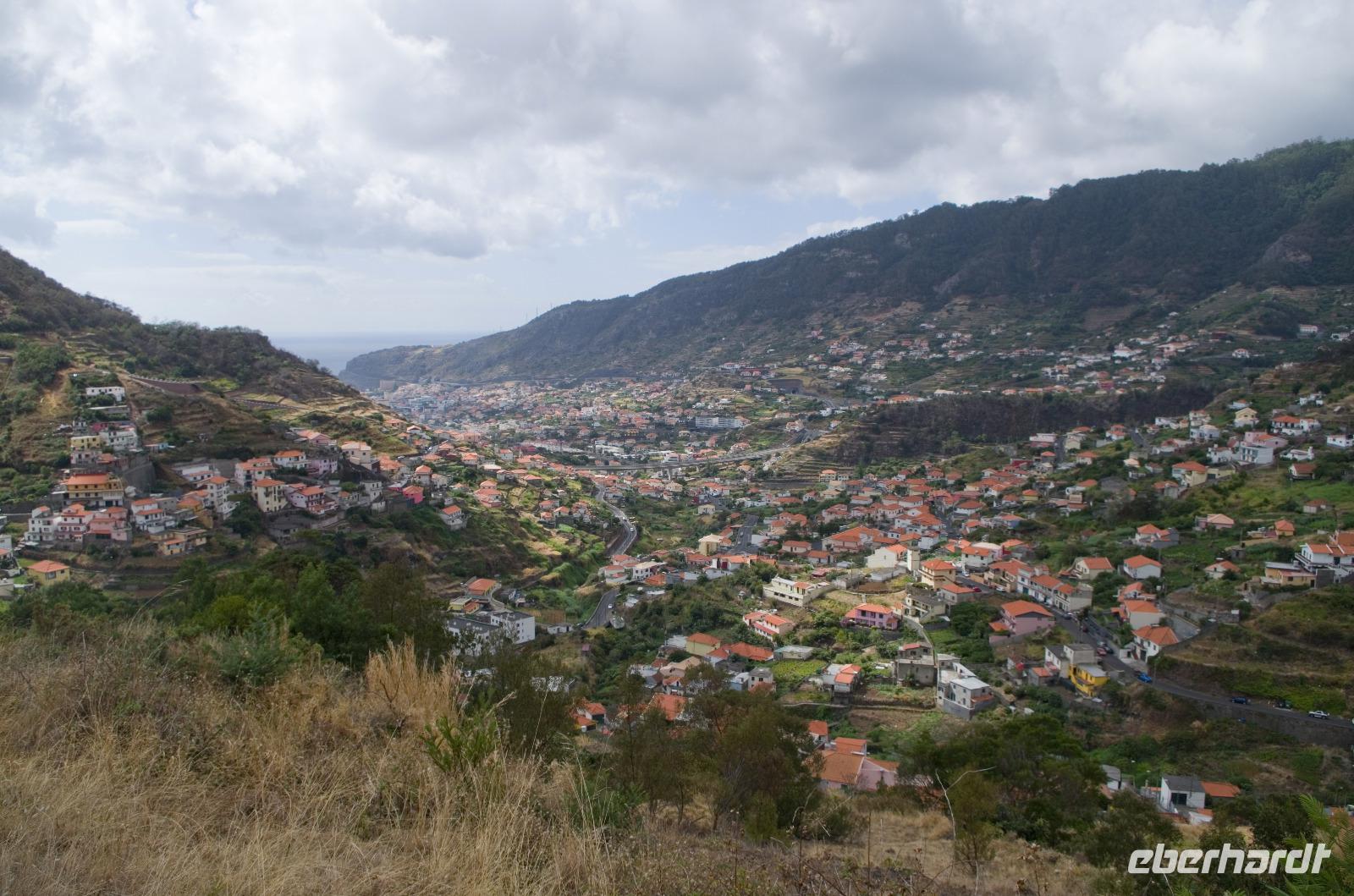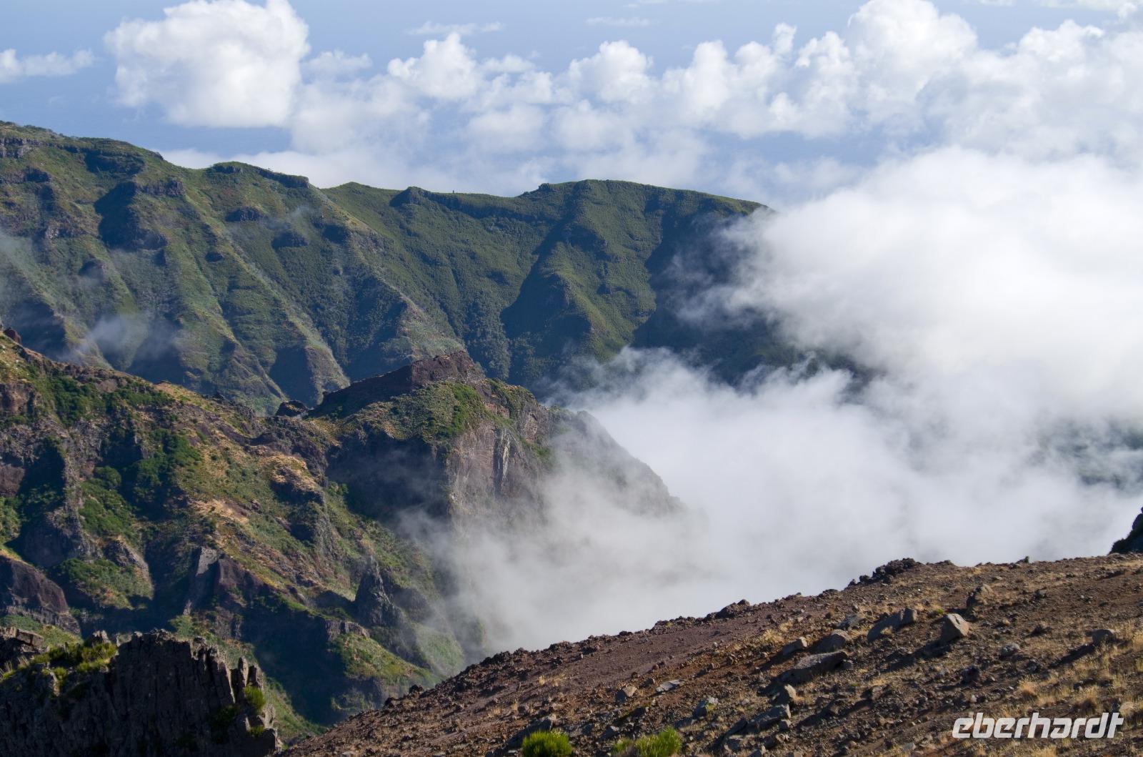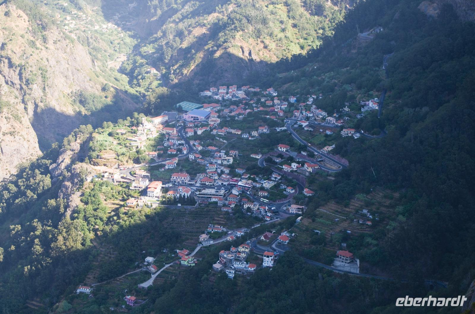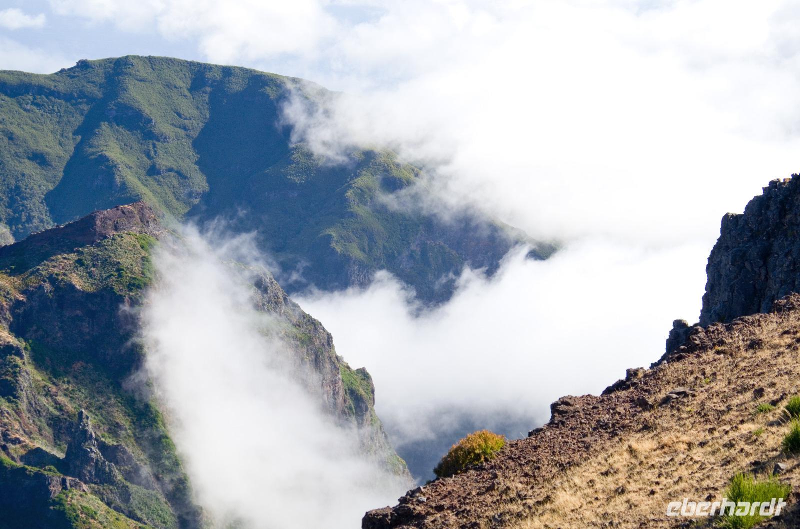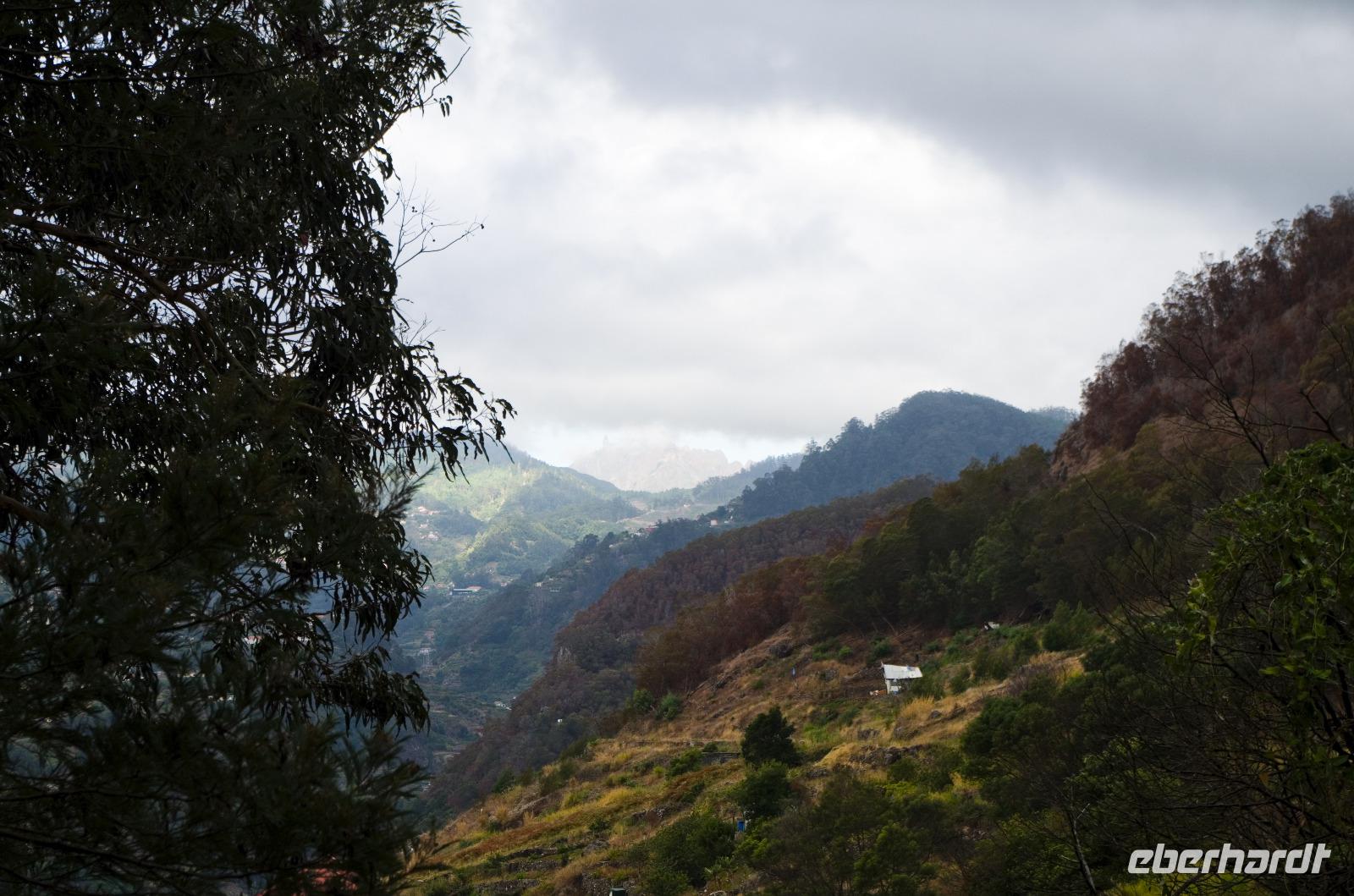 Dem Taleinschnitt der Ribeira Brava, dem die Verbindungsstraße nach Sao Vicente folgt, teilt Madeira in einen schroffen östlichen und einen sanfteren westlichen Bereich. Auf dieser Straße fahren wir hinauf in die Berge zum Encumeada Pass. Wer schwindelfrei ist, hat vom Busfenster aus einen atemberaubenden Blick in das Tal entlang der Straße. Petrus ist uns wieder wohl gesonnen und so genießen wir auf dem Pass einen ungetrübten Blick über die Insel bis hinüber zum Pico do Arieiro, den wir am ersten Tag besuchten und zum Pico Ruivo, dem höchsten Berg Madeiras. Dieser Ort wird auch der Nabel Madeiras genannt.