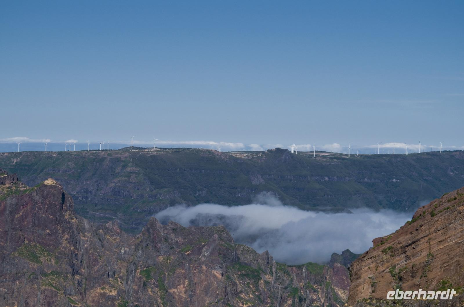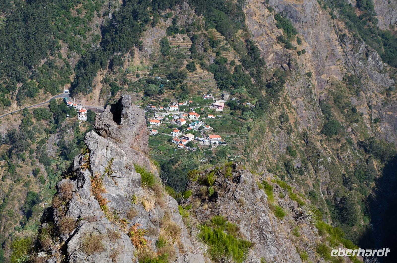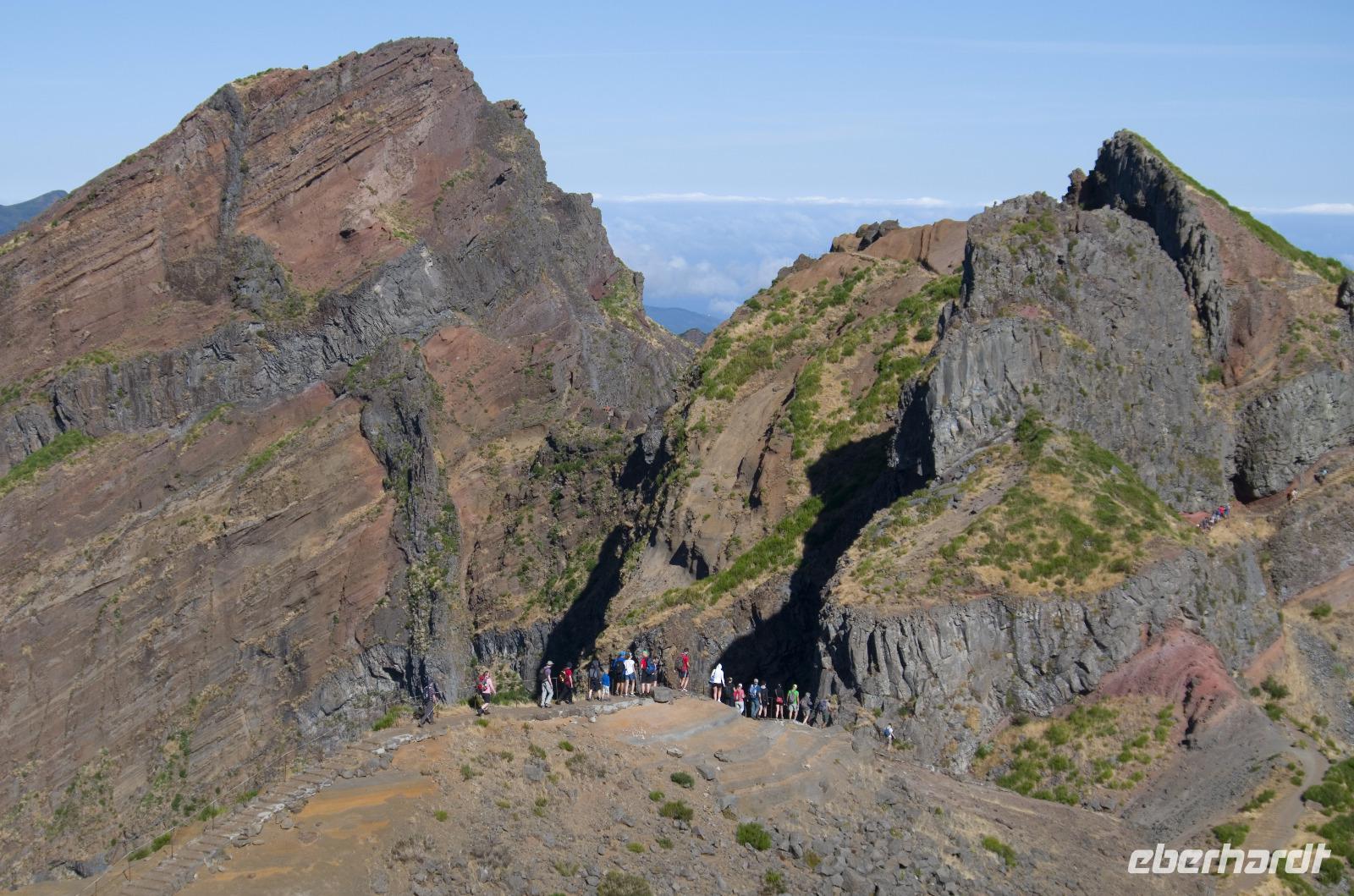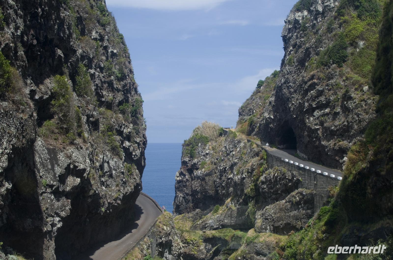 Dem Taleinschnitt der Ribeira Brava, dem die Verbindungsstraße nach Sao Vicente folgt, teilt Madeira in einen schroffen östlichen und einen sanfteren westlichen Bereich. Auf dieser Straße fahren wir hinauf in die Berge zum Encumeada Pass. Wer schwindelfrei ist, hat vom Busfenster aus einen atemberaubenden Blick in das Tal entlang der Straße. Petrus ist uns wieder wohl gesonnen und so genießen wir auf dem Pass einen ungetrübten Blick über die Insel bis hinüber zum Pico do Arieiro, den wir am ersten Tag besuchten und zum Pico Ruivo, dem höchsten Berg Madeiras. Dieser Ort wird auch der Nabel Madeiras genannt.