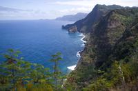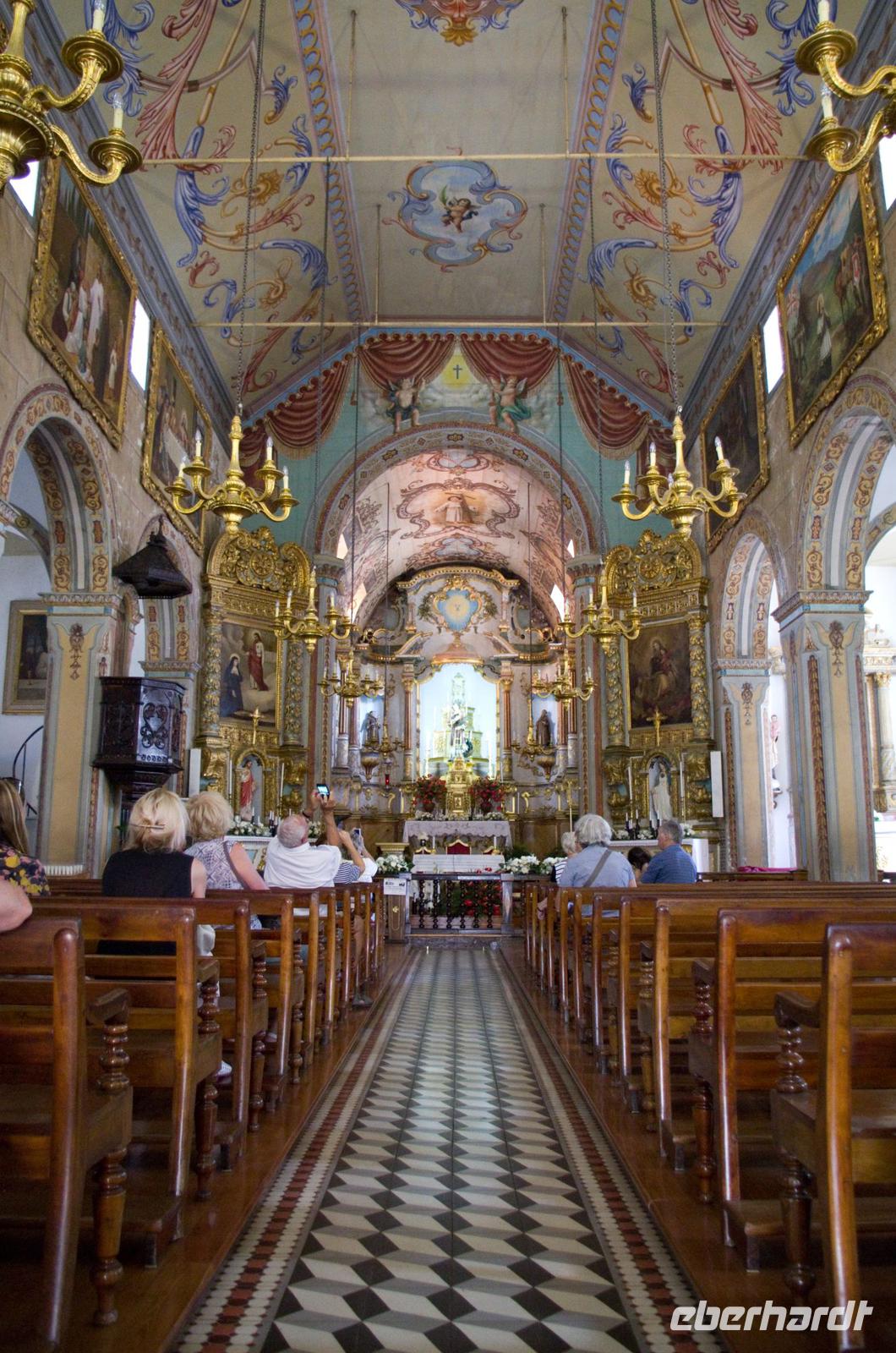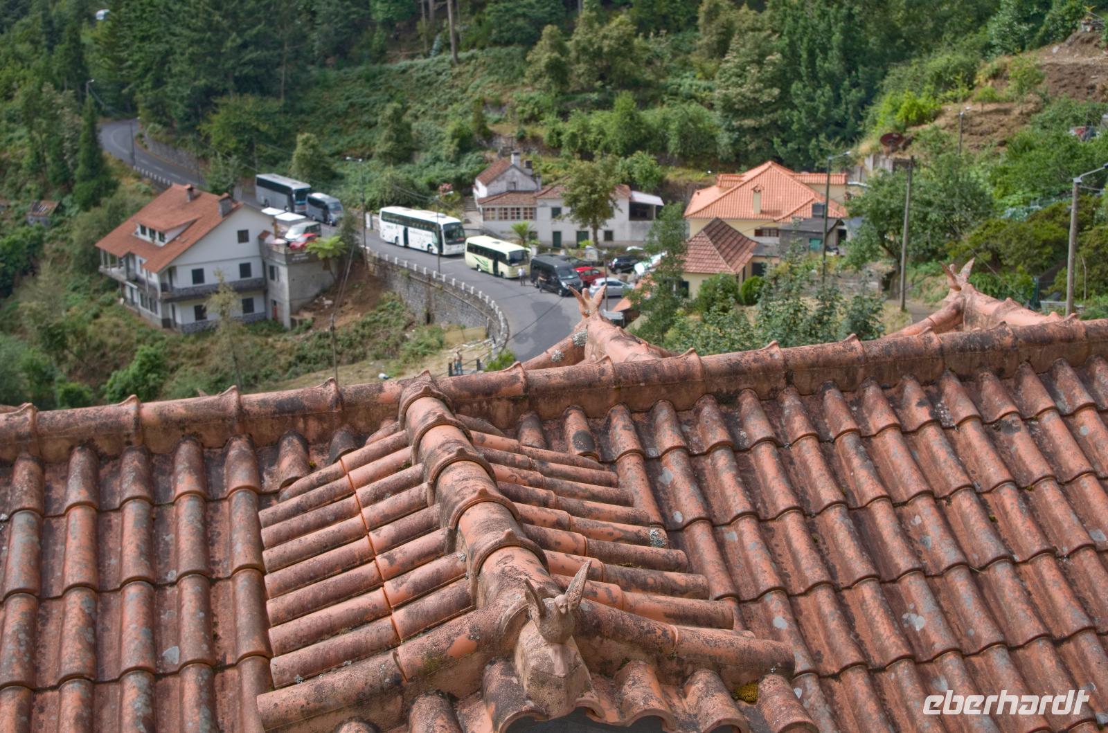 „Morgenstund hat Gold im Mund" sagt Helena und holt uns deshalb schon um 08.30 von der Quinta Splendida ab. Heute erkunden wir den Nordwesten Madeiras, doch unsere erste Station liegt noch an der Südküste, Ribeira Brava. Der Küstenort liegt am Ende eines tief eingeschnittenen, schmalen Tales und verdankt seinen Namen der Lage an der Mündung eines bei Regen wild (brava) fließenden Flusses (ribeira). Wir spazieren entlang des Ufers in die Stadt und besuchen den Kirchplatz mit dem hübschen Flusskieselmuster. Das Gotteshaus Sao Bento ist im 16. Jahrhundert im klassisch madeirensischen Sakralstil mit weißer Fassade und grauschwarzen Basalteinfassungen an Fenstern und Türen erbaut. Ein genussvoller Anblick - der schöne Kirchturm mit seiner von Kacheln im Schachbrettmuster geschmückten Spitze. Im Inneren sehen wir Azulejo Kachelmalerei an den Wänden und herrlich verzierte Barockaltäre. Besonders sind auch die Werke flämischer Meister an den Wänden. Diese kamen durch die intensiven Handelsbeziehungen zwischen Madeira und Antwerpen auf die Insel. Durch die noch ruhigen Gassen bummeln wir zurück zum Bus, bevor noch die anderen Touristenbusse die Stadt erreichen.