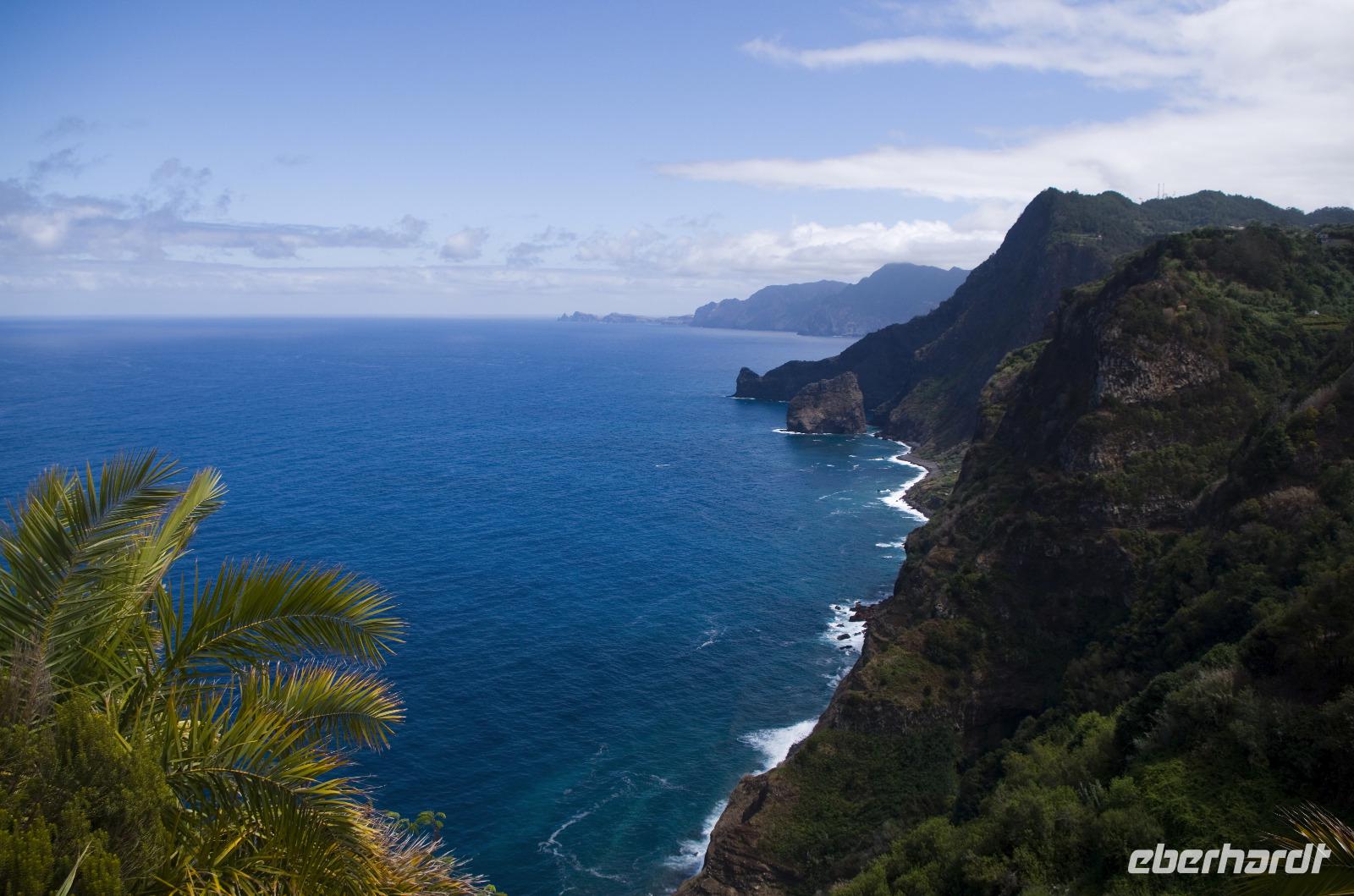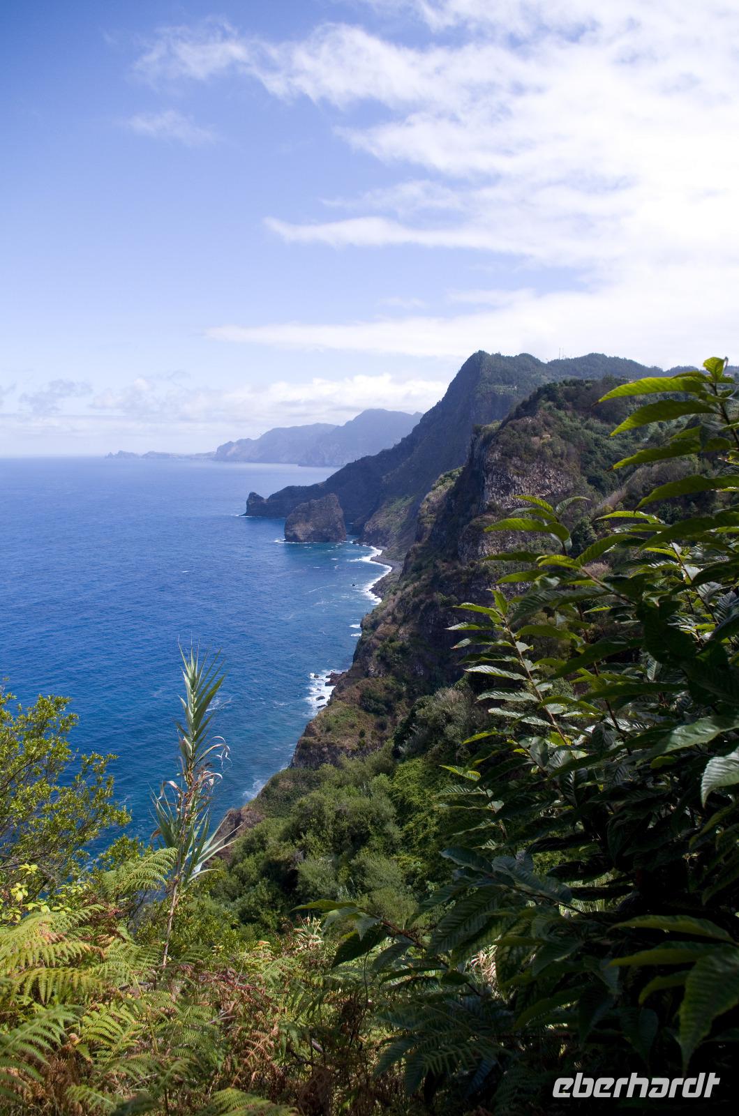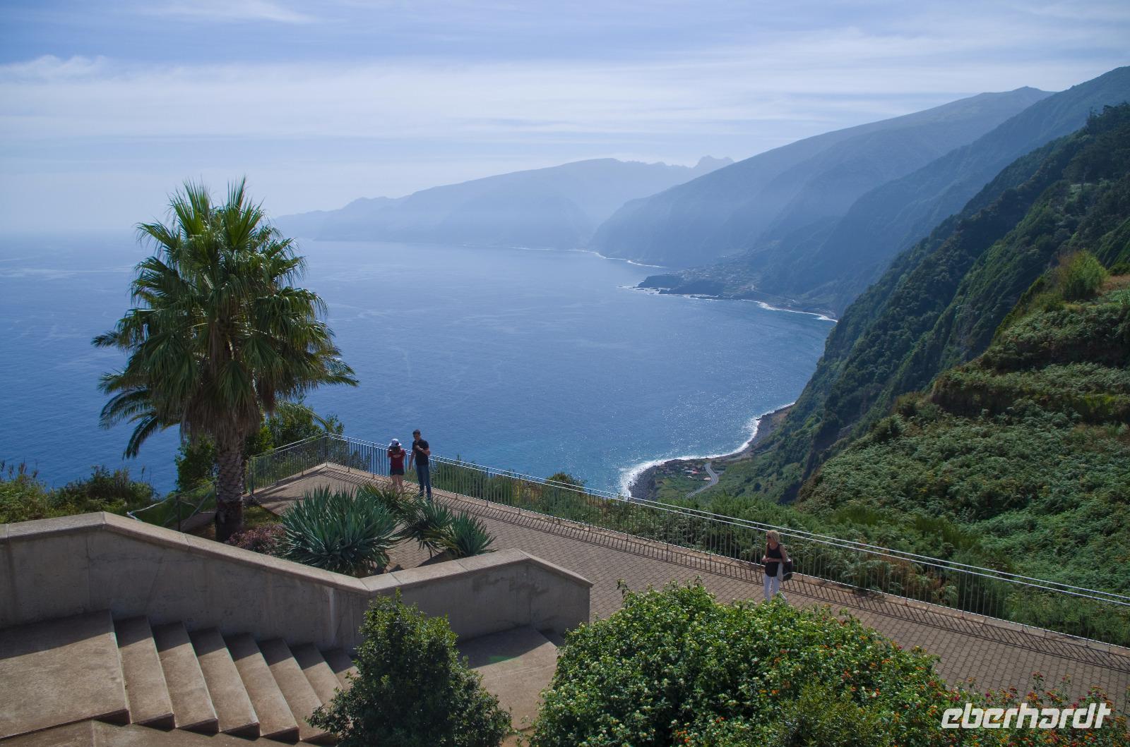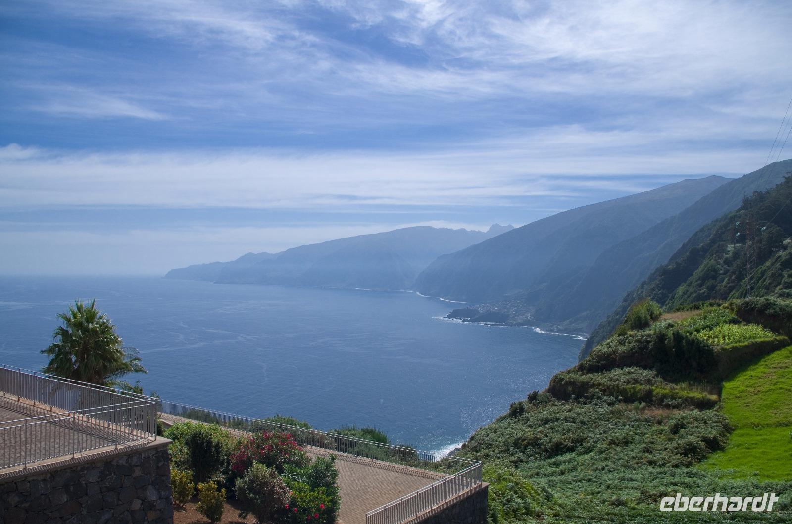Unser Weg nach Porto Moniz führt uns nun wieder von der Hochebene hinunter ins Tal. Bei einem Aussichtspunkt legen wir bei strahlendem Sonnenschein eine Fotopause ein, denn hier haben wir einen einmaligen Blick entlang der Nordküste über Seixal bis nach Sao Vicente.