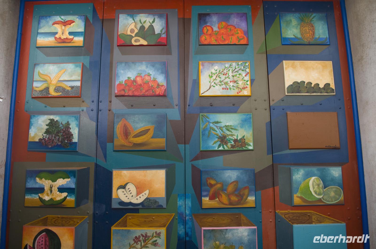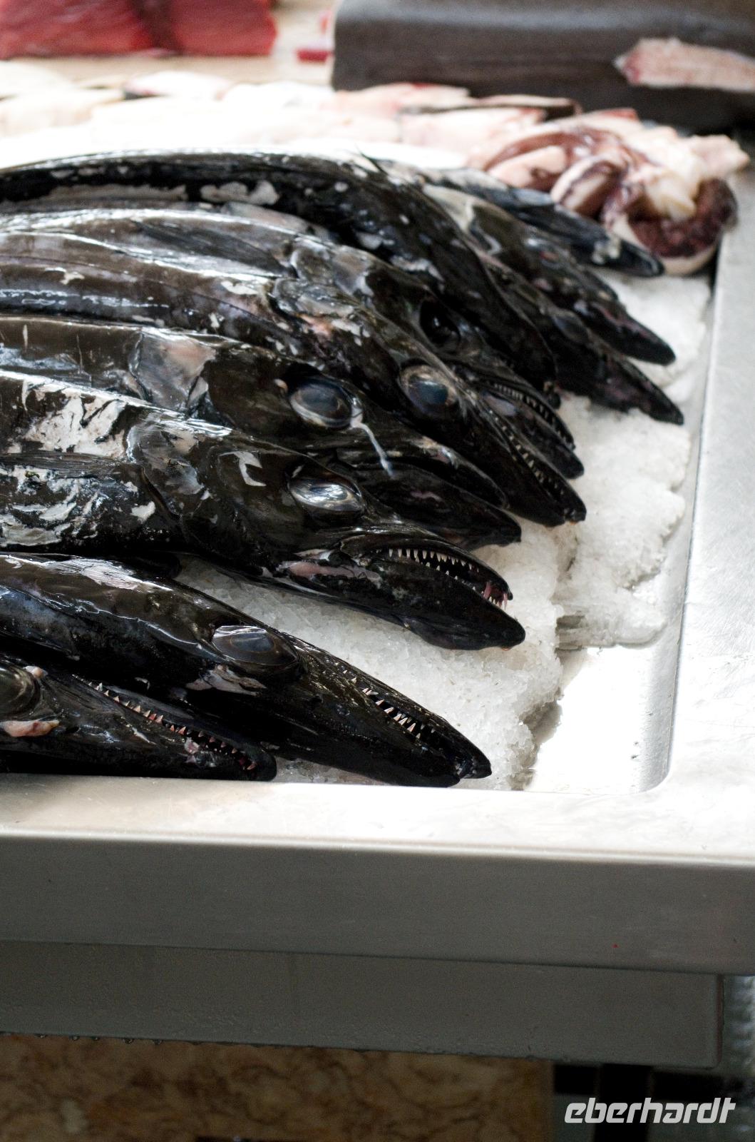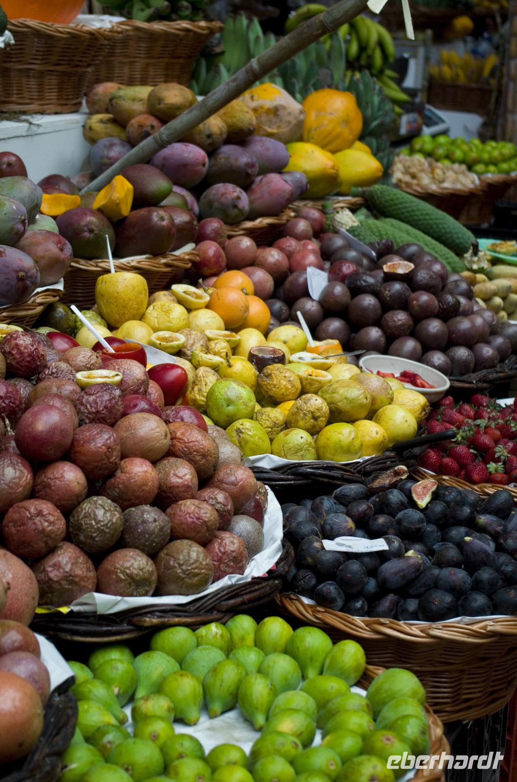 Unsere Fahrt durch Funchal führt uns vorbei am Haus des Präsidenten und dem Garten Santa Catarina bis hin zum Hafen, den wir einmal umrunden, und endet am Busbahnhof in der Altstadt. Bei unserem Altstadtbummel bewundern wir die bunten Türen der Häuser in den engen Gassen und können uns das rege Nachtleben hier lebhaft vorstellen. Viele haben sich besonders darauf gefreut - auf den Besuch der Markthalle. Es ist Samstag und heute bieten die Bauern der Region ihre Waren feil und wir dürfen sie verkosten. Die Fischhalle bietet einen kleinen Einblick in die Unterwasserwelt Madeiras und wir dürfen den berühmten schwarzen Degenfisch bestaunen. Hobbygärtner finden hier typische Pflanzen in Samen oder Knollenform für heimische Zuchtversuche.