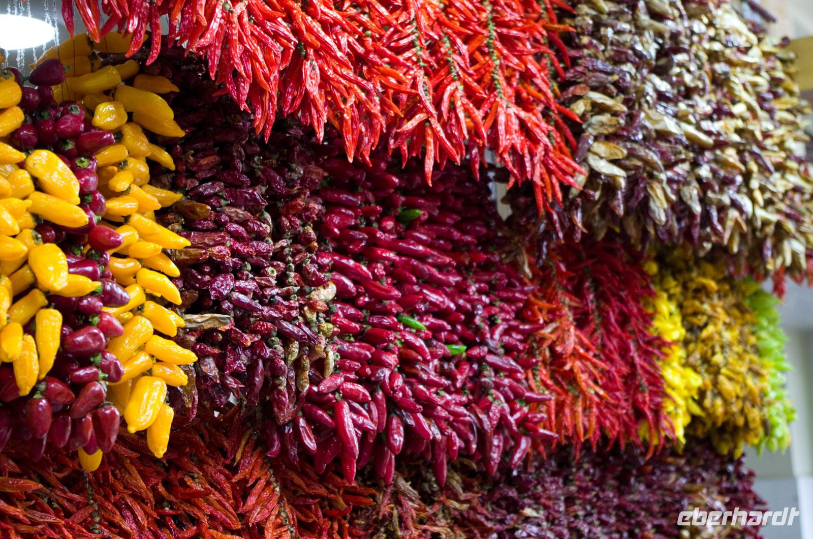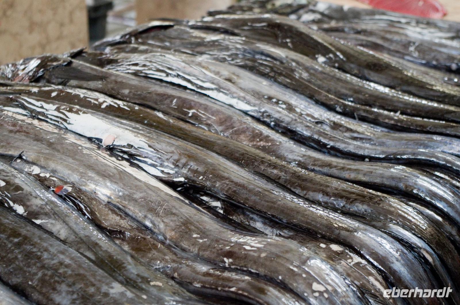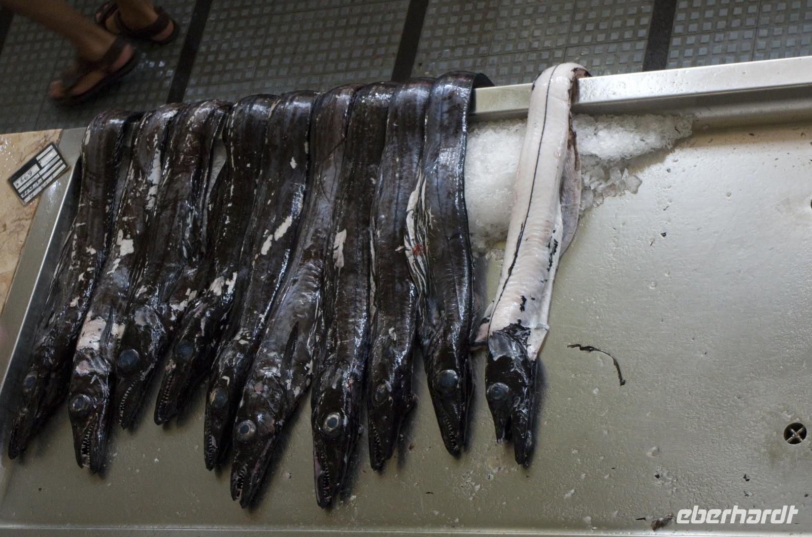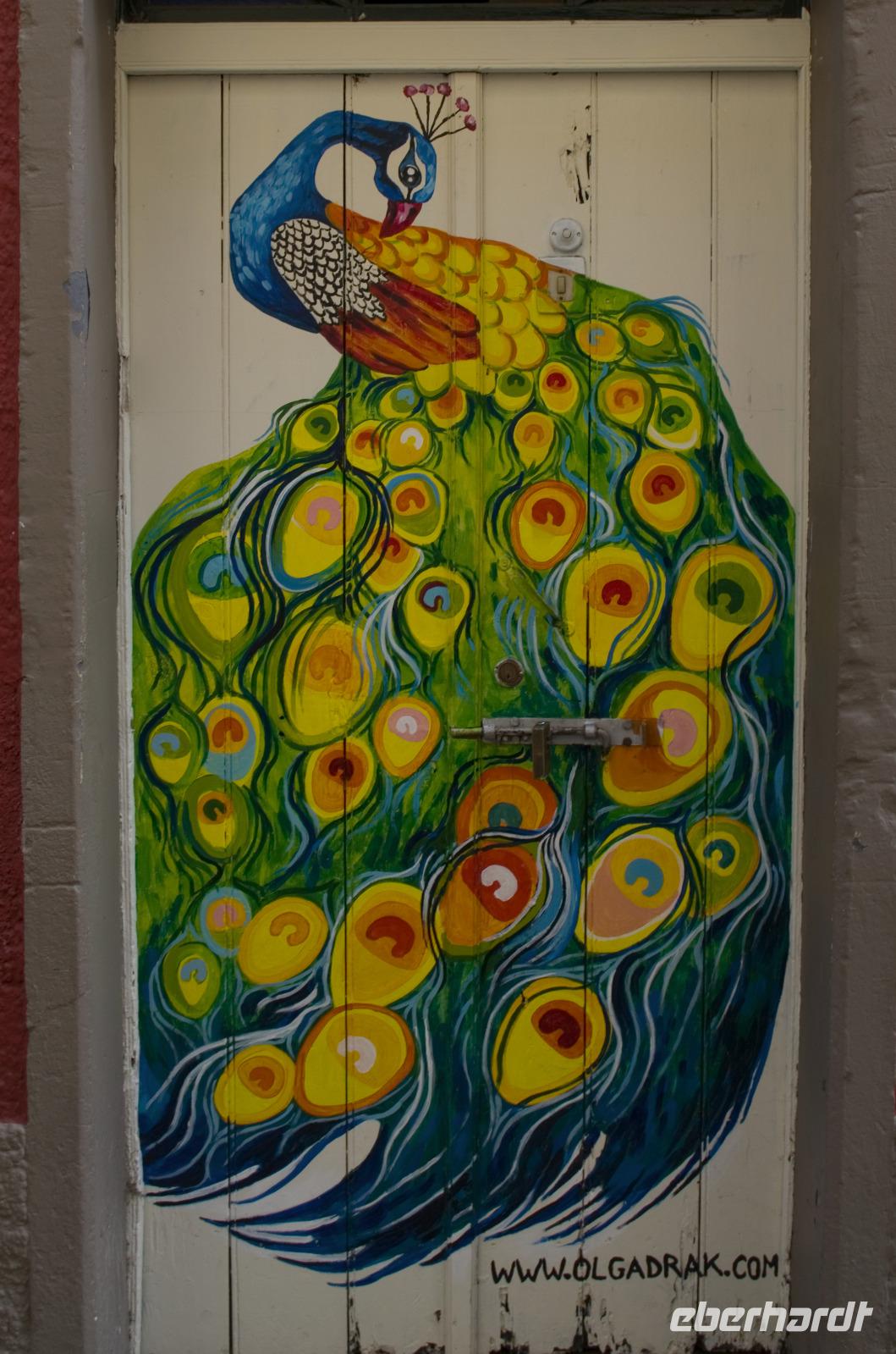 Unsere Fahrt durch Funchal führt uns vorbei am Haus des Präsidenten und dem Garten Santa Catarina bis hin zum Hafen, den wir einmal umrunden, und endet am Busbahnhof in der Altstadt. Bei unserem Altstadtbummel bewundern wir die bunten Türen der Häuser in den engen Gassen und können uns das rege Nachtleben hier lebhaft vorstellen. Viele haben sich besonders darauf gefreut - auf den Besuch der Markthalle. Es ist Samstag und heute bieten die Bauern der Region ihre Waren feil und wir dürfen sie verkosten. Die Fischhalle bietet einen kleinen Einblick in die Unterwasserwelt Madeiras und wir dürfen den berühmten schwarzen Degenfisch bestaunen. Hobbygärtner finden hier typische Pflanzen in Samen oder Knollenform für heimische Zuchtversuche.
