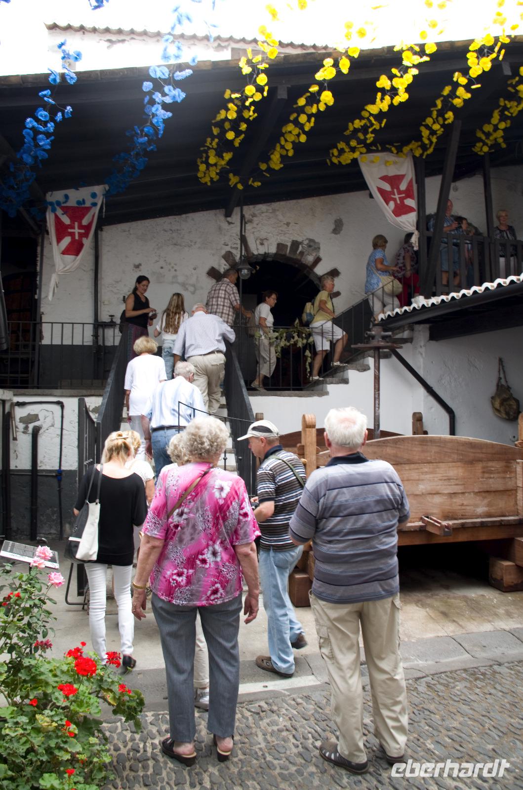 Nach einer kleinen Mittagspause wartet am Nachmittag ein besonderer Höhepunkt dieser Reise zum Weinfest: Die Weinparade in Funchal. Wir haben Tribünenplätze und damit einen guten und bequemen Blick auf die geschmückten Wagen und bunten Kostüme der vorbei ziehenden Folkloregruppen. Fünf festlich geschmückte Wagen und über 500 freiwillige Teilnehmer bringen uns die Geschichte des madeirensischen Weines näher. Der erste Wagen beschäftigt sich mit der Entdeckung Madeiras, ihrer Besiedlung und dem Beginn von Zuckerrohr- und Weinanbau. Der zweite Wagen thematisiert die Weinernte und zeigt typische Geräte, die für die Ernte auch heute noch genutzt werden. Hier erkennen wir auch unseren hölzernen Weinstampfbottich wieder. Wagen 3 trägt den Titel Ricardo III und zeigt die Seite eines Kastells als Symbol der Aristokratie, denn in Adelshäusern in ganz Europa erfreute sich der madeirensische Wein größter Beliebtheit. Der vorletzte Wagen zeigt die Unterzeichnung des Unabhängigkeitsvertrages zwischen Großbritannien und den USA, zu dem George Washington angeblich mit einem guten Glas Malvasia Wein anstieß. Der letzte Wagen mit dem Titel „Madeira's Wein in der Welt" repräsentiert die fast 500-jährige Geschichte des Weins, seine Geschichte als Tauschprodukt im Welthandel und seine Verbreitung bis nach Japan und in die USA.