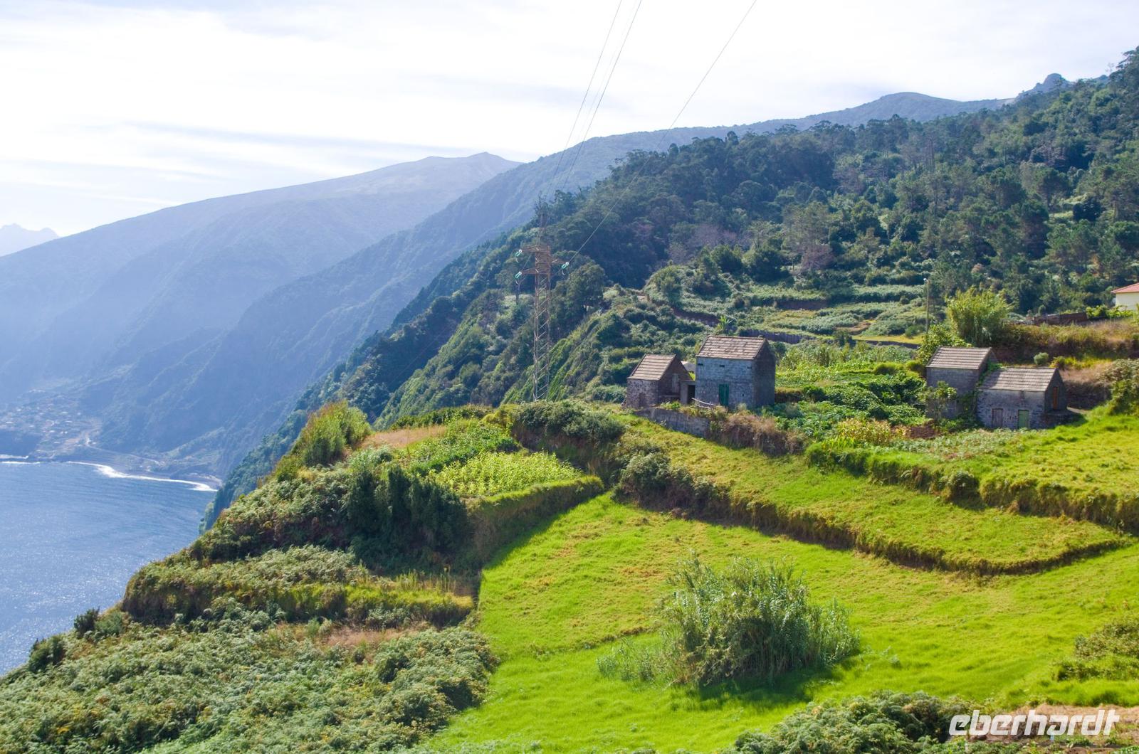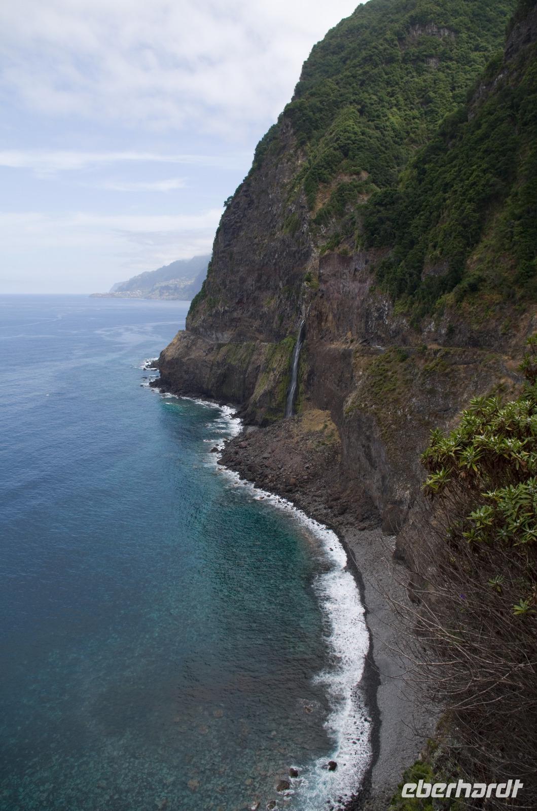 Nach dieser wohltuenden Mittagspause verlassen wir Porto Moniz in Richtung Seixal bis zum Brautschleier Wasserfall. Unterwegs erzählt uns Helena über die neue Mode, Kuhställe in Wochenend- oder Ferienhäuser umzubauen und zeigt uns ein paar gelungene Exemplare entlang der Straße. Am Wasserfall folgen wir der alten Küstenstraße bis zu einem Aussichtspunkt, von wo aus der Brautschleier in voller Pracht zu sehen ist. Bis zu dem Bau der ersten Straße in den 1950er Jahren waren die Orte nicht miteinander verbunden, nur über Bergpfade oder per Boot konnte man sie erreichen.