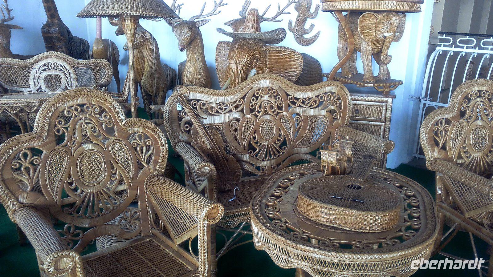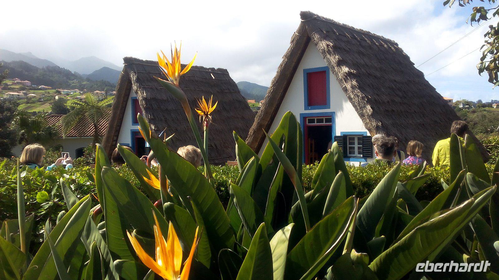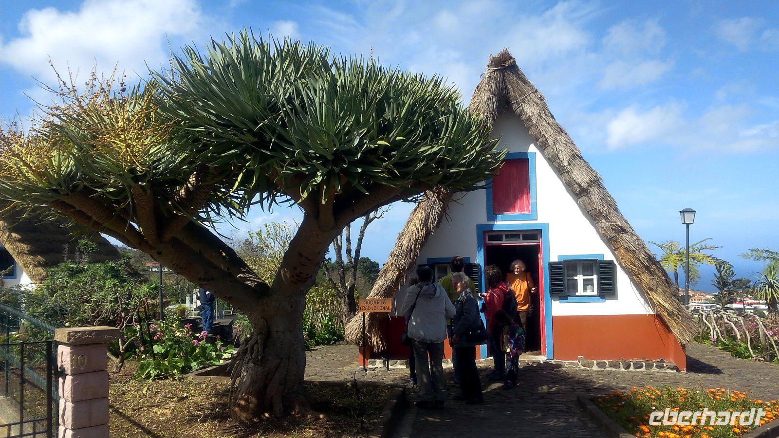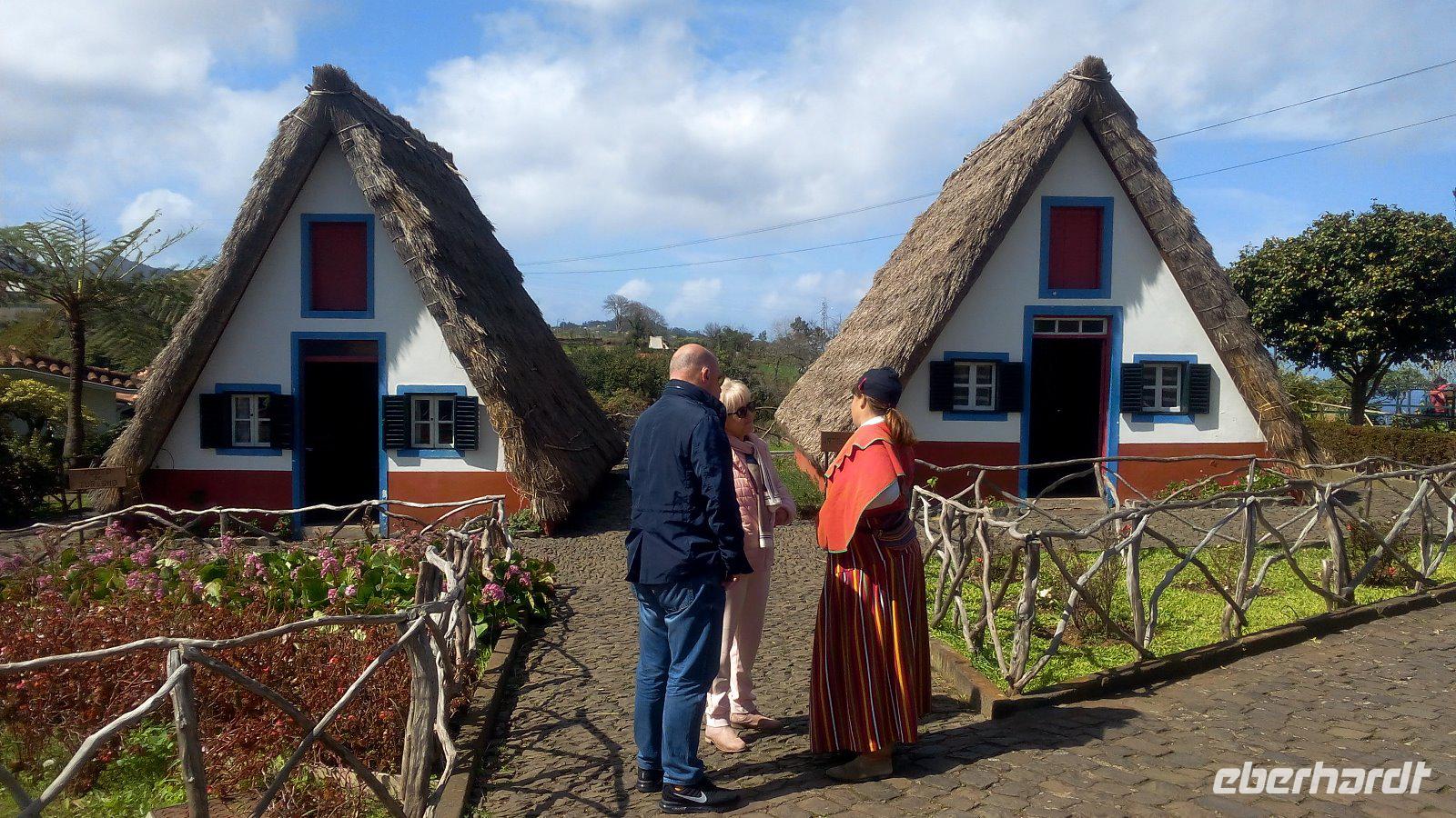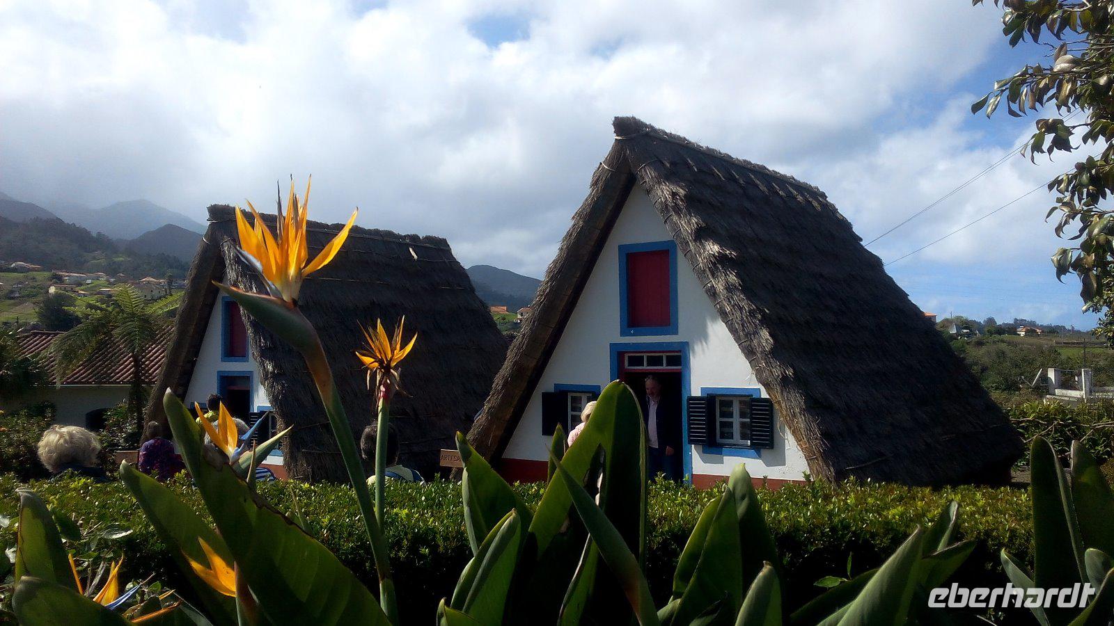 Es geht heute hoch hinaus. Gutes Schuhwerk ist Pflicht. Doch bevor es so weit ist, fahren wir nach Camacha. Wir besuchen eine Korbflechter-Schauwerkstatt. Der Aufschwung der Korbflechterei geht auf die Engländer zurück, die hier ihre Sommerresidenz hatten und den Bewohnern Möbel aus Weidenflechten in Auftrag gaben und die später zu einem wichtigen Exportartikel wurden. Wir sind beeindruckt von der Fingerfertigkeit der Männer und Frauen bei der Arbeit. Wir verabschieden uns von Camacha und fahren bei guter Sicht durch das Weinanbaugebiet zum Pico do Arieiro. Mit seinen 1818 m ist er der dritthöchste Berg von Madeira. Leider "stecken" wir in den Wolken und haben starken Wind nach einem kurzen Fotostopp fahren wir weiter. Entlang der bewaldeten Hänge fahren wir nach Ribeiro Frio mit seiner Forellenzucht. Gegen Mittag beginnen wir eine ca. 3 km lange Levadawanderung. Der Einstieg ist hinter Victor´s Bar und führt von Ribeiro Frio zur Kanzel Balcoes den vielleicht schönsten Aussichtspunkt der Region. Wir sind gespannt auf unsere erste Levada -(Furado)Wanderung. Die Kanäle immer links von uns wandern wir auf einen weichen Waldboden. Achtung, die Wurzeln müssen im Auge behalten werden. Beeindruckend ist die Ruhe, die wir empfinden, bevor wir dann zur Kanzel Balcoes kommen. Faszinierende Blicke auf die Bergspitzen. Eine entspannte Wanderung, die man nicht verpassen sollte. Von oben sehen wir schon unseren Bus und beginnen jetzt auch mit unserem Abstieg. Bruno wartet schon auf uns. Wir setzen unsere Fahrt fort. Nach einer Stunde sind wir im Norden angekommen und besichtigen Santana. Bekannt sind die bunt gestrichenen Casa de Cimo, die strohbedeckten historischen Holzhäuser, die wir erkunden und im Bild festhalten.