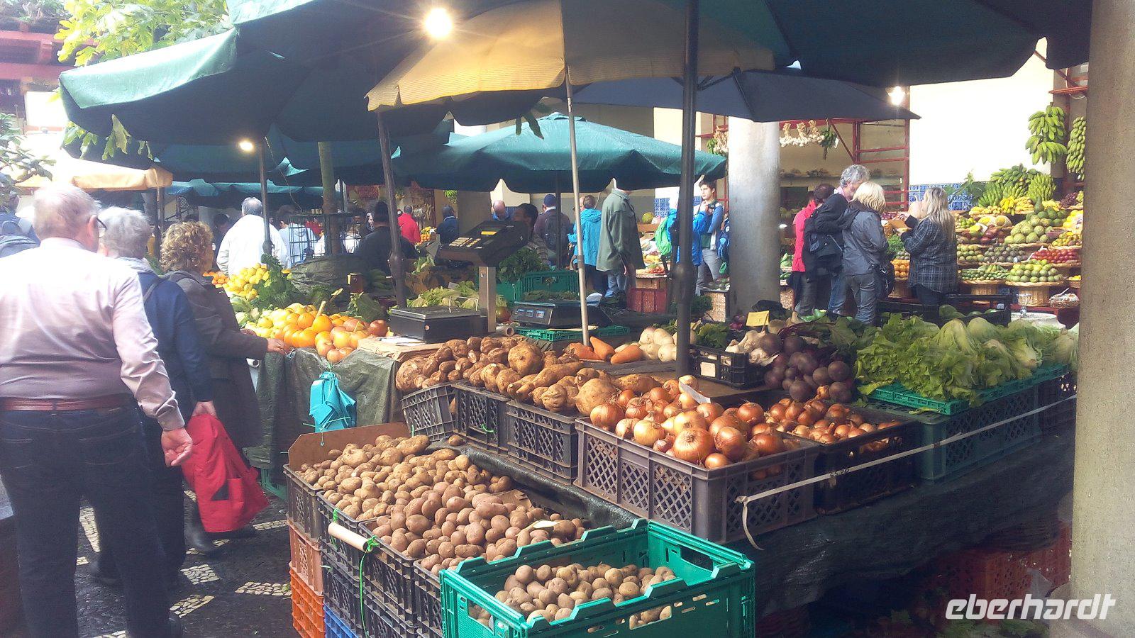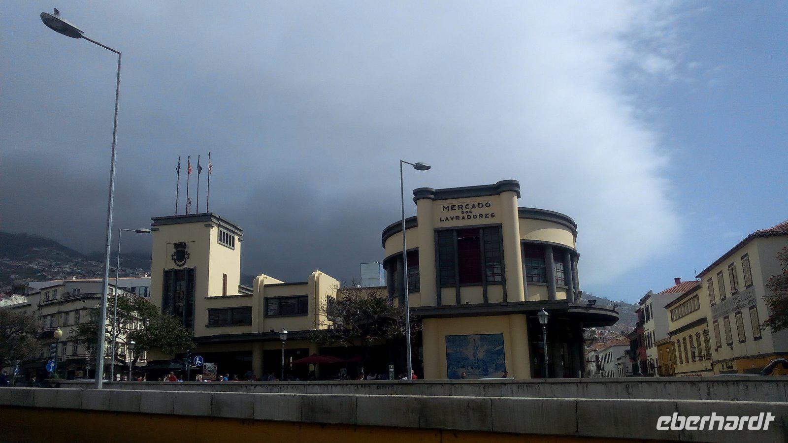 Unser nächstes Ziel ist die Markthalle (Mercado dos Lavradores) die 1940 mit ihrer schlichten Fassade eröffnet wurde. Wir folgen Marco in den Innenhof, in dem die Händler mit exotischen Früchten, Gemüse, Honig und vielen Blumen handeln. Die Fischhändler sind in einer eigenen Halle untergebracht und handeln mit großen Thunfischen und auch mit den schwarzen Degenfischen -Esparda- die wir schon probieren konnten.