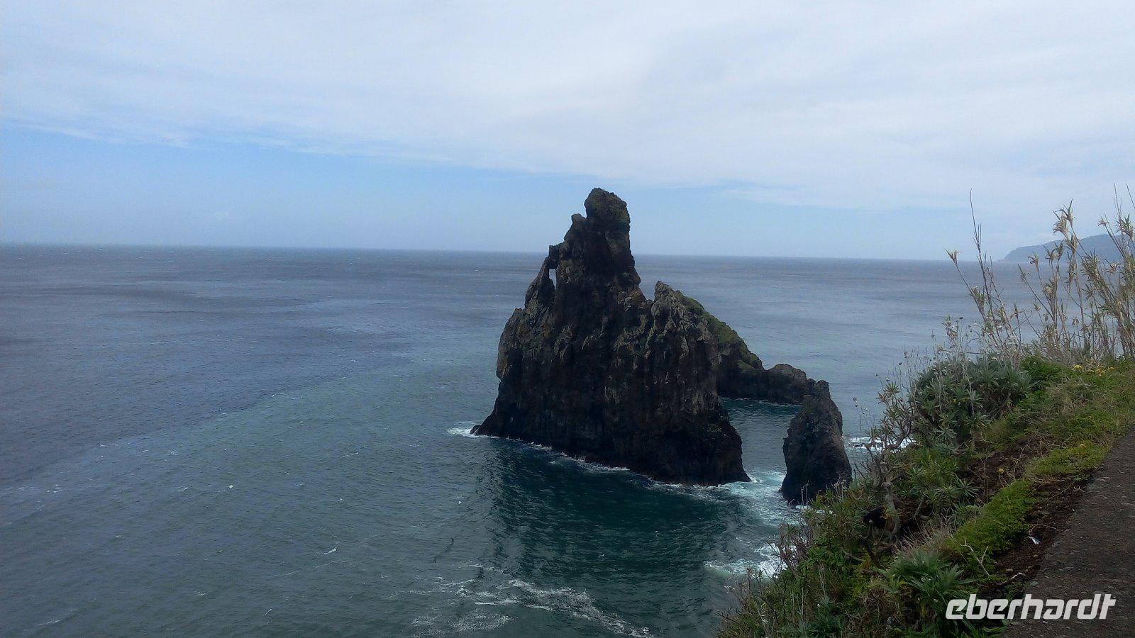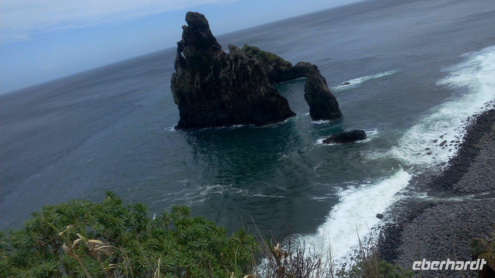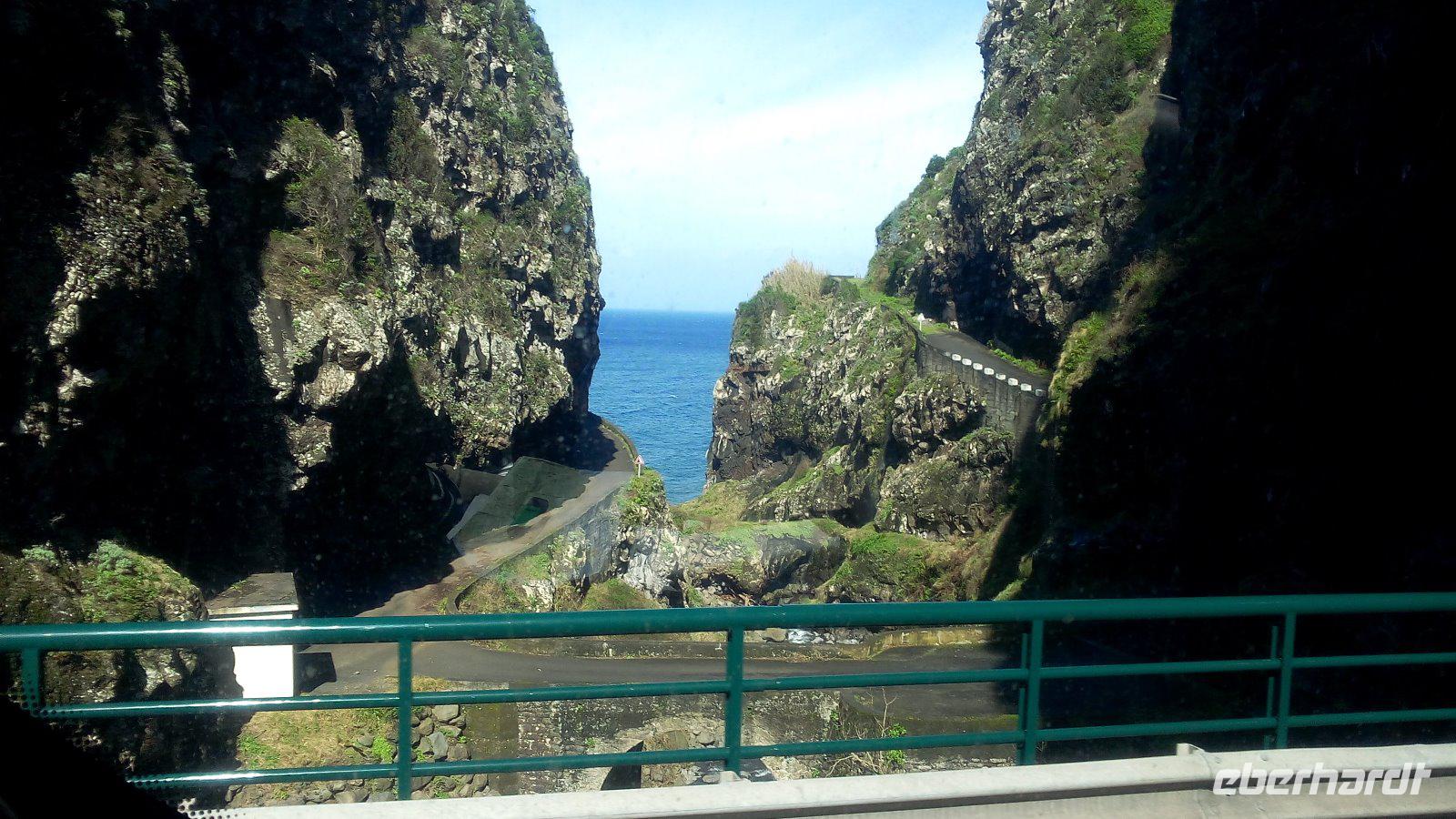 Vor Ribeira da Janela stoppen wir und fotografieren die Bucht und im Ort die Fensterfelsen, eine ungewöhnliche Gesteinsformation.