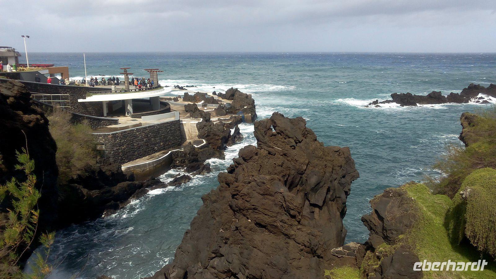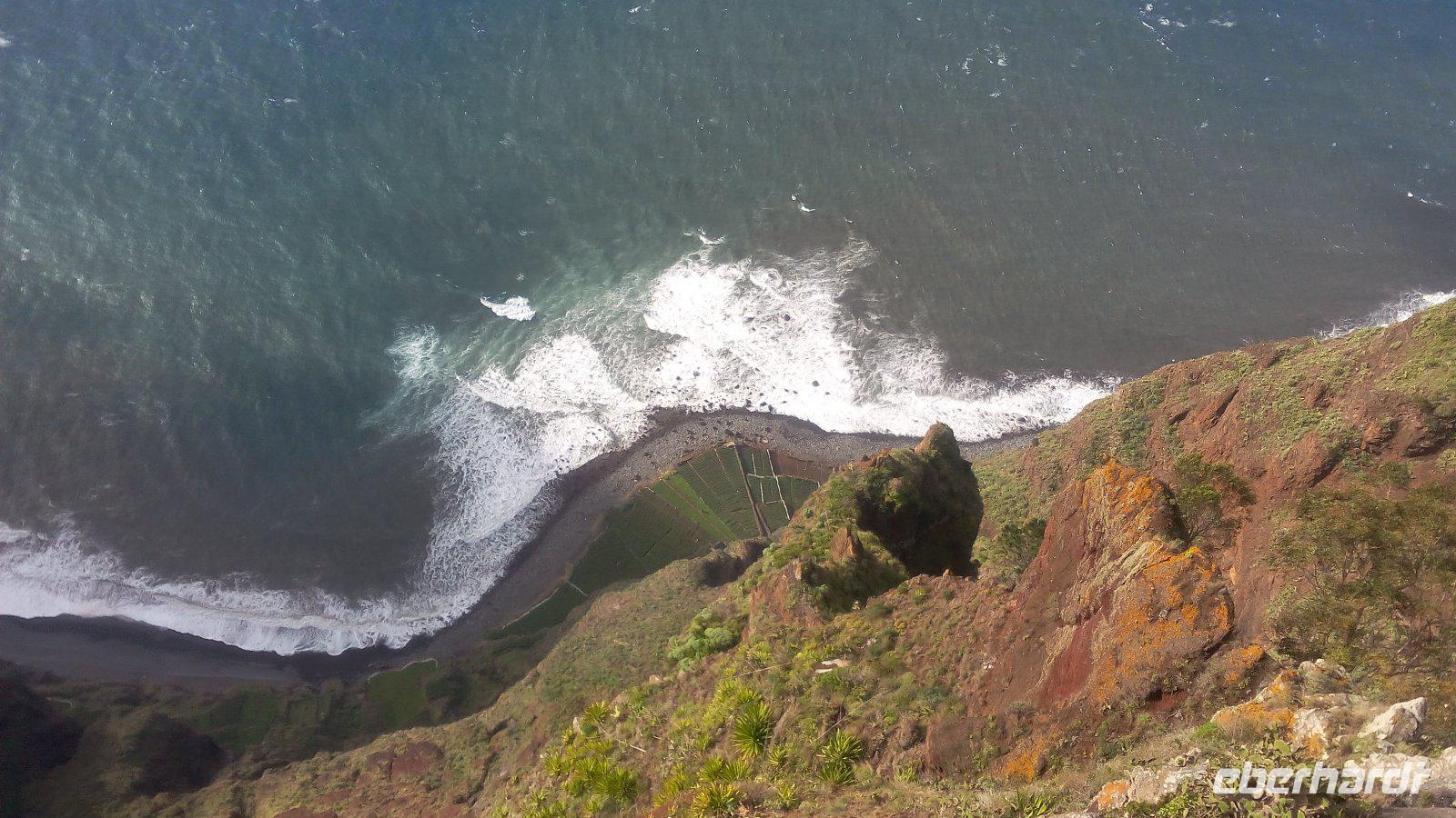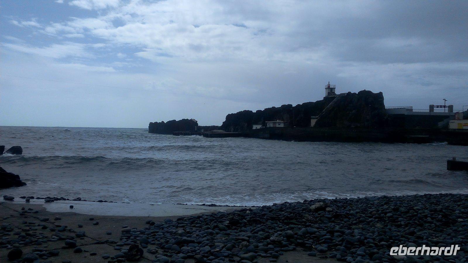 Vor Ribeira da Janela stoppen wir und fotografieren die Bucht und im Ort die Fensterfelsen, eine ungewöhnliche Gesteinsformation.