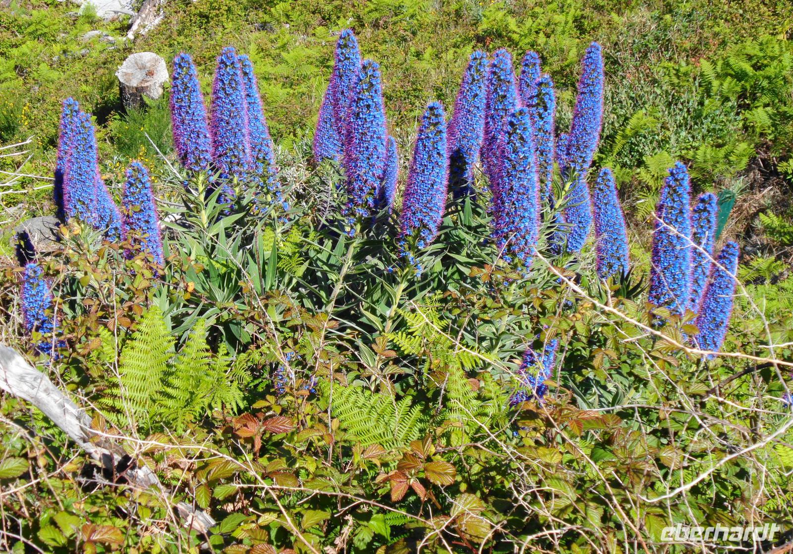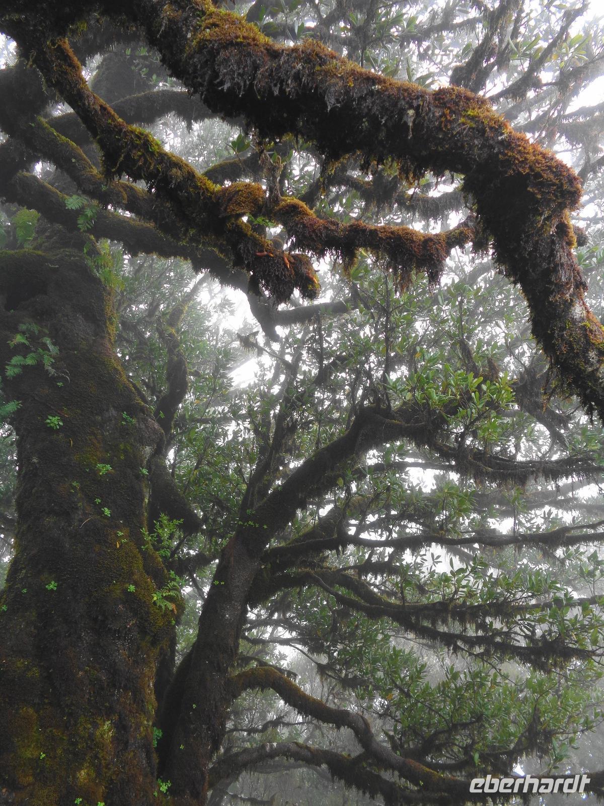 Nach einem Rundgang in dem freundlichen, gepflegten Städtchen ging es weiter zur Hochebene Paúl da Serra. Hier, auf 1000 m Höhe, war es plötzlich wieder sehr nebelig, kalt und regnerisch, die Sicht betrug nur ein paar Meter. Trotzdem stiegen wir natürlich aus dem Bus und ließen uns von der durch Farne, Moose, Heidekraut und Flechten geprägten Landschaft verzaubern. Man glaubte sich eher ins Schottische Hochmoor versetzt, als auf der Blumeninsel Madeira!