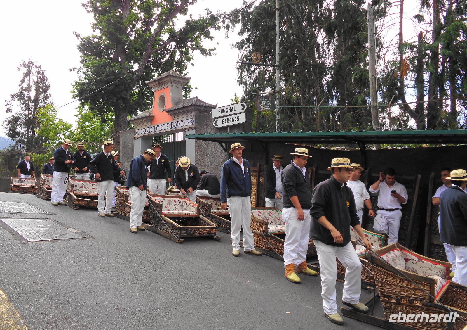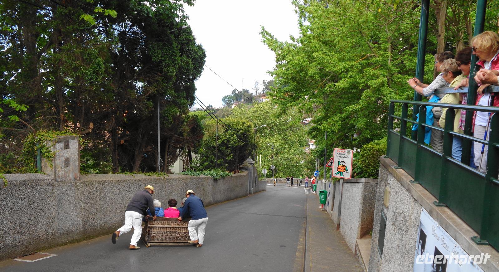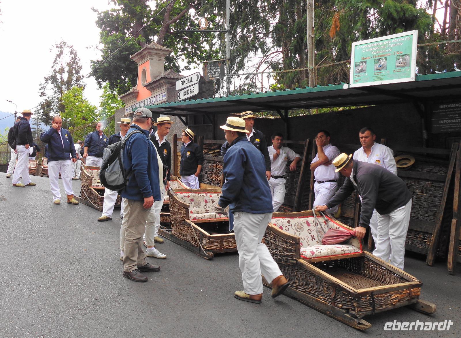 Unmittelbar unter der Kirche starten die berühmten Korbschlitten, Madeiras wohl bekanntestes Transportmittel. 15 mutige Gäste nahmen den Schlitten und begaben sich auf die rund 2,5 KM lange, rasante Fahrt. Ursprünglich das einzige öffentliche Transportmittel für die Bewohner, sind die bremsenlosen Schlitten heute eine Attraktion für Touristen, die sich gerne den Fahrkünsten der traditionell in weiß gekleideten „Carreiros" anvertrauen.