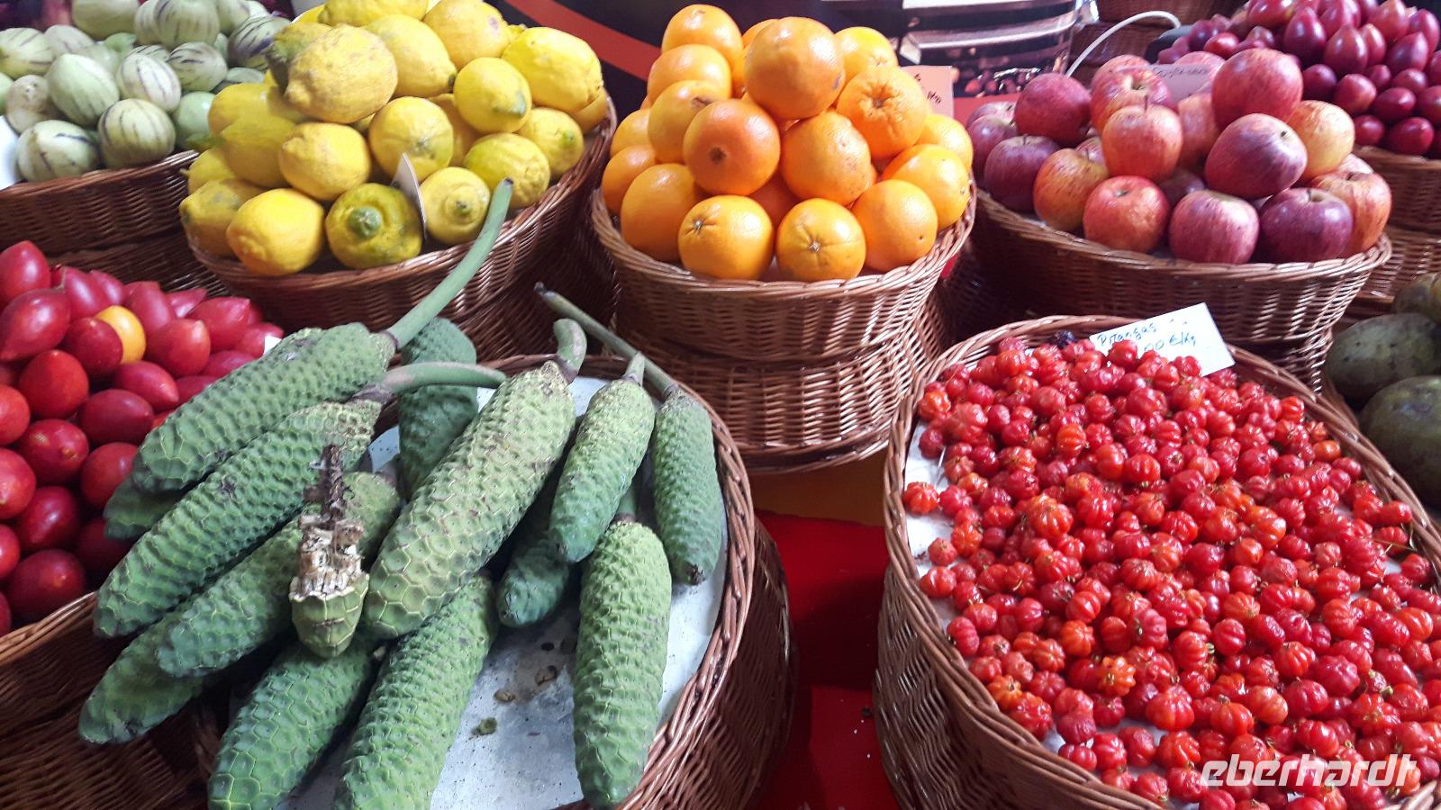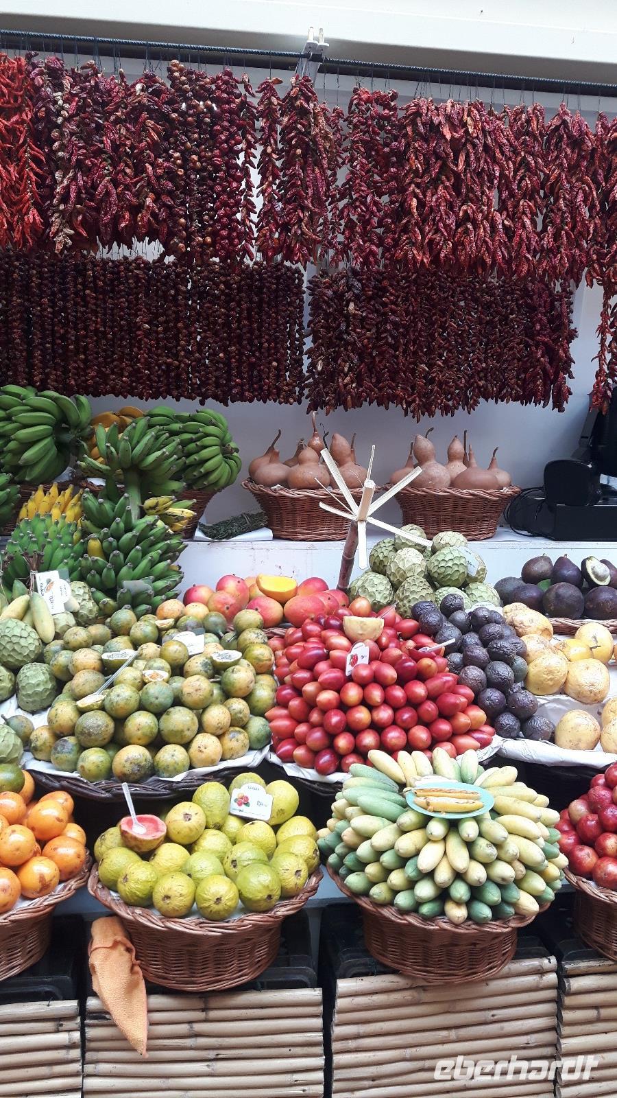 Auch heute ging es erst gegen 9 Uhr los und nach einer sehr kurzen Fahrt waren wir bereits im oberhalb von Funchal gelegenen Botanischen Garten angekommen. Allein die Lage ist äußerst reizvoll, denn der Blick auf die Inselhauptstadt ist von hier aus fantastisch. Gemeinsam mit Paula flanierten wir gemütlich durch den Park, die Vegetation mit über 2.000 verschiedenen Pflanzen ist bewundernswert. Gegen Mittag besuchten wir die quirlige und altehrwürdige Markthalle von Funchal, die wir dann mit allen Sinnen erleben konnten. Das Motto lautet "Sehen, riechen, schmecken und staunen...!" Hier fanden wir alles, was die Insel an Kulinarischem, Floralem und Kulturellem zu bieten hat. Später erreichten wir "Blandy´s Wine Lodge" und auch hier führte uns Paula durch verschiedene Räumlichkeiten, bis wir den berühmten Madeira-Wein in zwei verschiedenen Sorten probieren konnten. Gut gelaunt spazierten wir weiter durch die Gassen der Altstadt zum Restaurant "Solar da