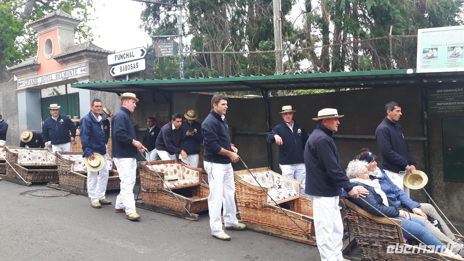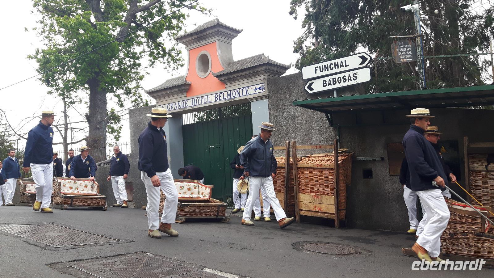 Nach dem Frühstück starteten wir auch heute wieder mit Paula´s obligatorischer Frage "Ein Platz frei...?" und dem Hinweis auf die Bäckerei "Reis Magos". Zunächst erreichten wir Funchal und auf Wunsch unserer Gäste sollte es eigentlich für einige von uns mit der Monte-Seilbahn hinauf nach Monte gehen. Leider jedoch fuhr die Seilbahn wegen zu starker Windverhältnisse zu diesem Zeitpunkt nicht und so blieb uns nichts anderes übrig, als mit unserem Bus zu fahren. Oben angekommen, besuchten wir zuerst die berühmte Wallfahrtskirche von Monte. Danach wurde es dann abenteuerlich, denn die meisten Gäste nahmen die Möglichkeit zu einer der hier angebotenen Korbschlittenfahrten wahr. Zu zweit oder zu dritt ging es ab - zwei weiß gekleidete Männer mit Strohhüten schoben die Schlitten jeweils schwungvoll an oder brachten ihn auch mal an Seilen gezogen in Fahrt und recht rasant ging es dann auf der abschüssigen Straße, die immerhin auch von Autos befahren wird, hinab. Heute ist dies natürlich ein touristischer Jux, aber früher waren die Korbschlitten immerhin die ersten öffentlichen Verkehrsmittel auf Madeira. Nach diesem kleinen Abenteuer gelangten wir mit unserem Bus zum Aussichtspunkt Pico dos Barcelos, von wo man einen überwältigenden Blick auf Funchal genießen kann. Anschließend ging es noch weiter hinauf nach Eira do Serrado, wo wir überwältigende Blicke über das Nonnental und die umliegenden Gipfel hatten. Schließlich erreichten wir am frühen Nachmittag das Nonnental, welches hinsichtlich der Architektur und Mentalität der Menschen so ganz anders als das übrige Madeira auf uns wirkte. Wir probierten die typische Maronensuppe in einem der hiesigen Lokale und stellten fest, dass dieses einfache Gericht nicht jeden Geschmack traf (mich übrigens eingeschlossen). Den restlichen Nachmittag verbrachten die meisten Gäste in Funchal, um ggfs. auf eigene Entdeckungstouren zu gehen. Schließlich gab es einen öffentlichen Linienbus, der uns von Funchal innerhalb von etwa 30 Minuten zu unserem Hotel zurückbrachte. Am Abend traf sich nochmals unsere gesamte Gruppe, die übrigens mittlerweile zu einer tollen Gemeinschaft zusammengewachsen war, zu einem "Abschieds-Abendessen". Wir flanierten entlang der Promenade zum direkt am Meer gelegenen Restaurant "Reis Magos". Die Speisekarte ließ keine Wünsche offen und so schlemmten wir "letztmalig" leckere Fleisch- und Fischgerichte. Zumindest glaubten wir das zu diesem Zeitpunkt noch...