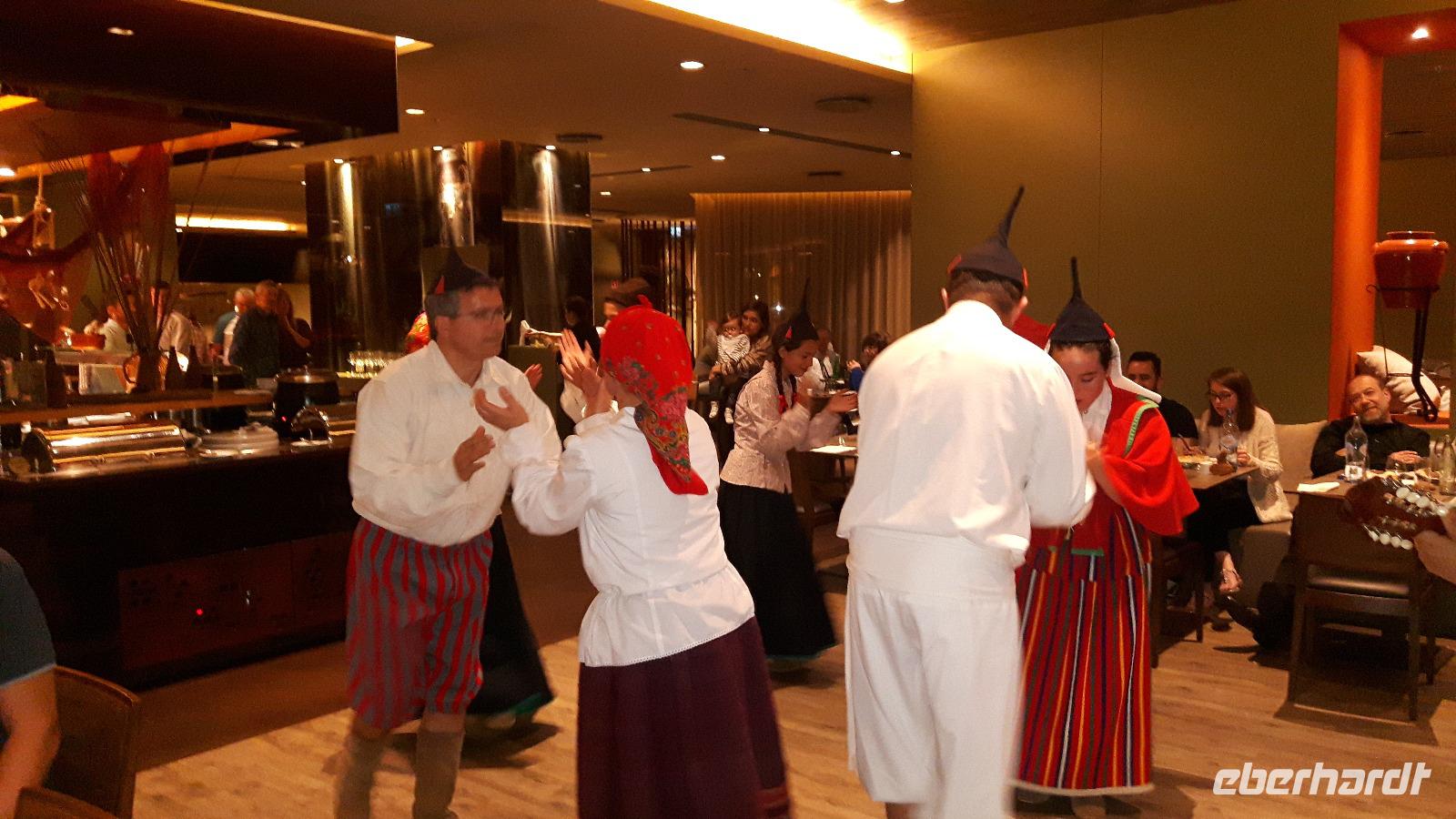 Santola", wunderschön am Meer gelegen. Heute nun endlich konnten wir eine typische Fischsuppe probieren - einfach nur lecker und dazu durfte das obligatorische Knoblauchbrot nicht fehlen! Gut gestärkt ging es mit dem Bus zur beeindruckenden Meeresklippe Cabo Girao. Es handelt sich hier immerhin um die höchste Meeresklippe Europas und der Skywalk bietet eine Aussichtsplattform aus Glas, wo der Blick atemberaubende 580 Meter in die Tiefe reicht. Am Nachmittag legten wir einen Halt im Fischerdorf Camara de Lobos ein. Gemeinsam schlenderten wir zum kleinen Hafen mit seinen charakteristisch bunten Fischerbooten. Bekannt ist der Ort nämlich auch dafür, dass hier die meisten Espadas bzw. Schwarzen Degenfische, die Fischspezialität Madeiras schlechthin, gefangen werden. Diese Köstlichkeit ist übrigens einmalig in Europa und kommt nur rund um die Insel Madeira vor. Es gibt aber auch noch etwas anderes, worauf uns Paula aufmerksam machte - das typische Getränk "Nikita" sollten wir probieren! Gesagt..., getan... - in einer der Bars probierten wir gemeinschaftlich diese erfrischende Mischung aus Bier, Weißwein und Ananaseis. Der heutige Abend hielt für uns noch etwas ganz besonderes bereit, denn wir besuchten gemeinsam das Restaurant "Planka" oberhalb von Funchal. Neben einer tollen Aussicht über das Lichtermeer von Funchal besticht das Restaurant mit seiner regionalen Küche. Heute kamen übrigens die Fleisch-Liebhaber unter uns voll auf ihre Kosten, denn hier wurden die traditionellen portugiesischen "Espetadas" (Fleischspieße) mit zahlreichen Beilagen serviert, ein absoluter kulinarischer Genuss! Gut gelaunt fuhren wir am späten Abend mit unserem "Fernando-Express" zurück.