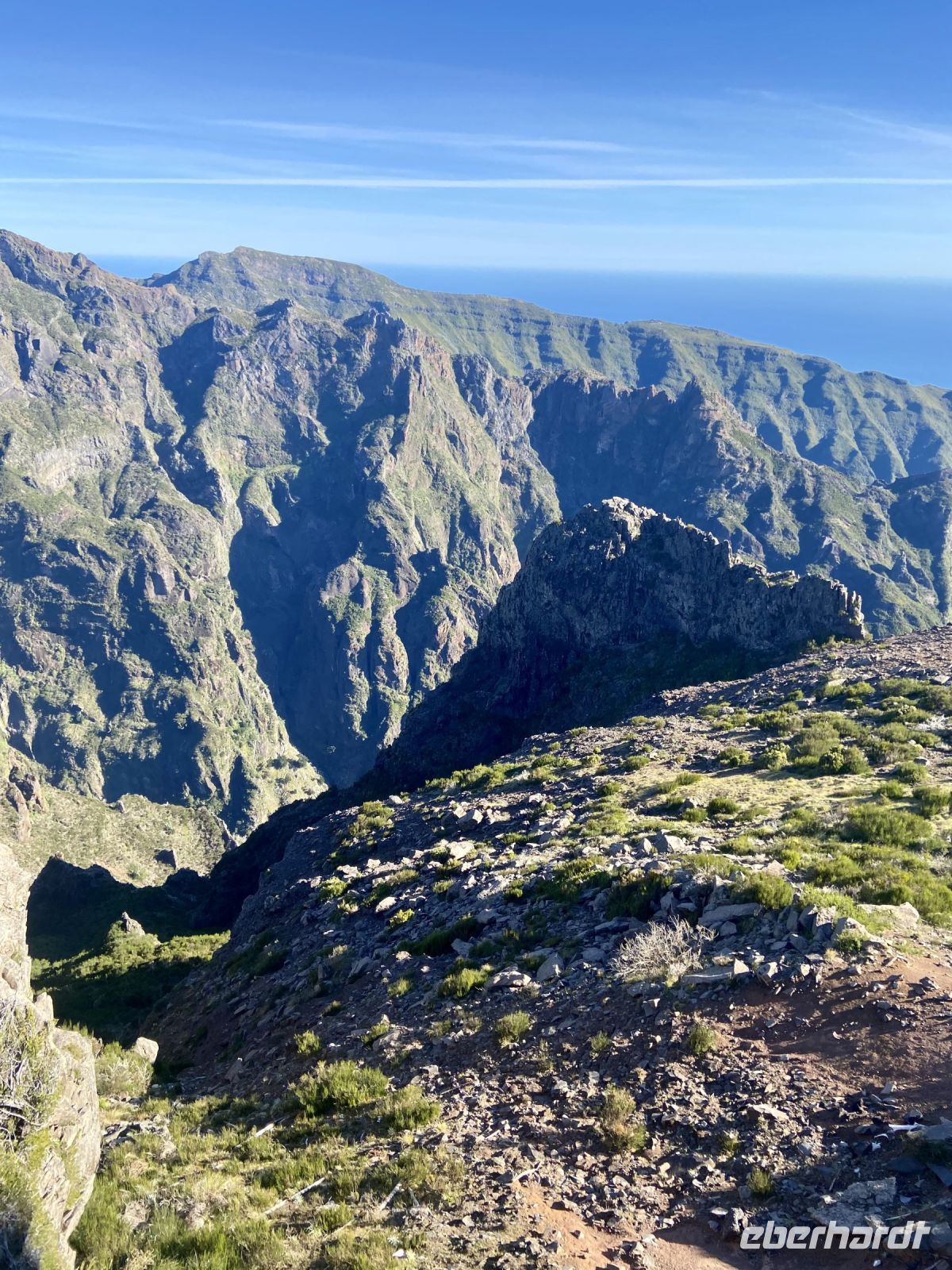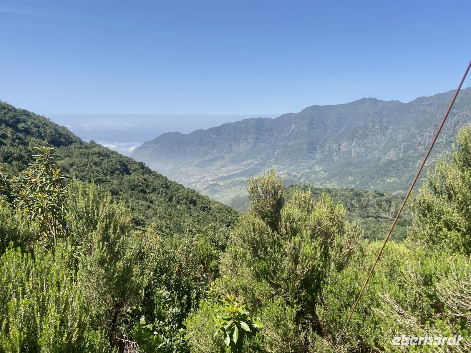 Eigentlich war ein kurzer Bummel in dem kleinen Ort geplant, doch wir müssen den Zeitplan etwas ändern: die ursprüngliche Strecke über den Encumeada-Pass können wir nicht passieren, denn ein großes Verkehrsschild warnt vor Steinschlag und weist darauf hin, dass die Fahrt nur auf eigene Gefahr durchführbar wäre. Dieses Risiko wollen wir natürlich nicht eingehen und so nehmen wir eine Alternative, die uns aber etwas Zeit kostet. Trotzdem genießen wir die kurze Pause hoch oben auf 1.500 m Höhe, die links erstreckt sich die Nordküste, rechts geht der Blick in Richtung Süden. Etwas getrübt wird die Aussicht heute jedoch durch leichten Saharastaub, den das warme Wetter mit sich bringt. Er taucht alles in ein milchig-hellgelbes Licht und lässt die Konturen verschwimmen.