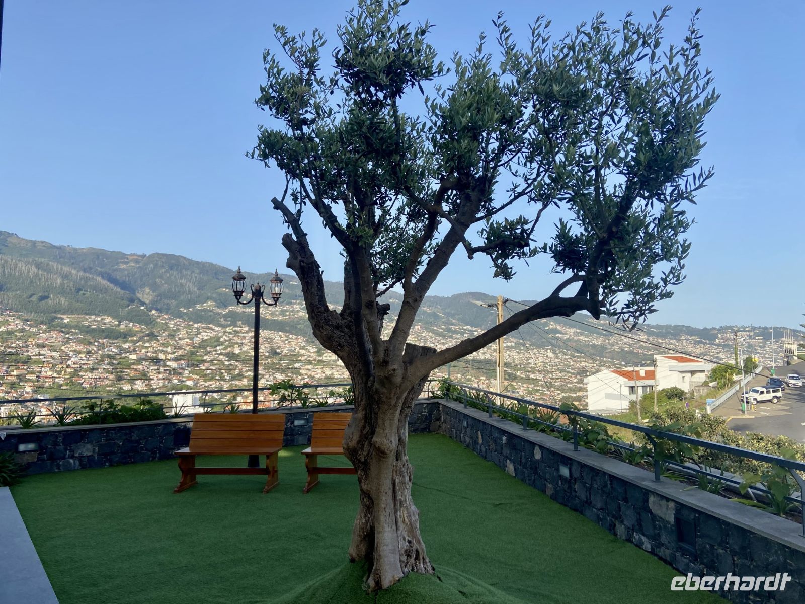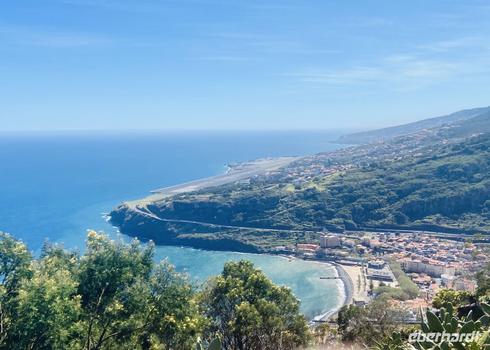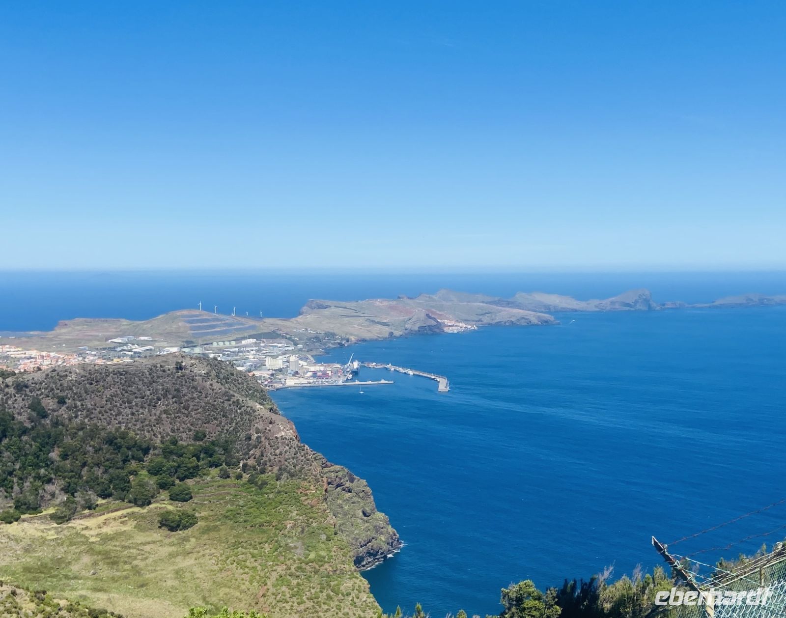 Wir halten kurz am Aussichtspunkt "Pico dos Barcelos", in dessen Nähe wir unser gestriges Abendessen hatten. Nun können wir den Blick aus einer Höhe von 355 Metern noch einmal bei Tageslicht genießen.